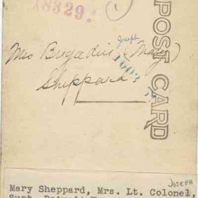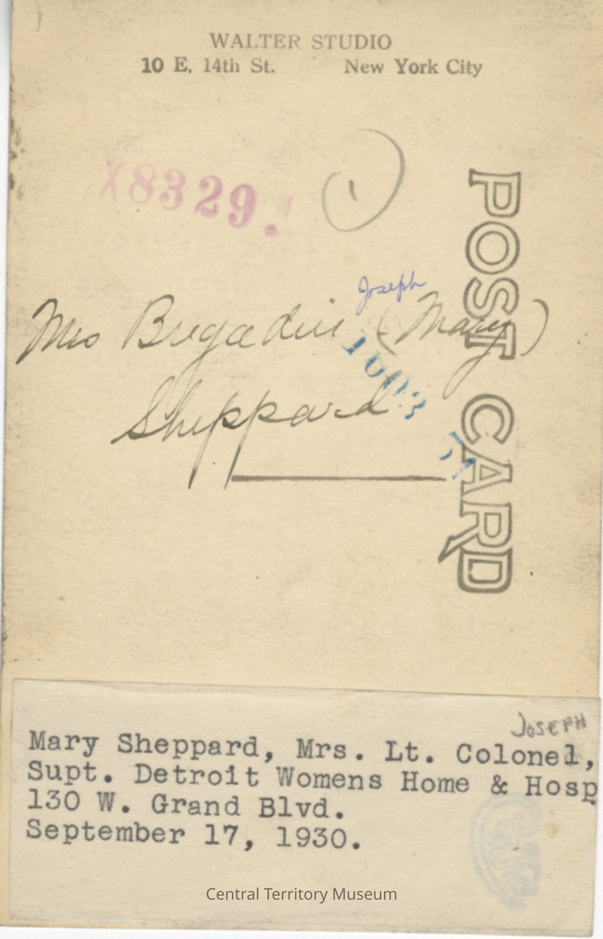 The back of the postcard is stamped with the name Walter Studios with all of its locations in New York City and in New Jersey. The publisher, CYKO, is printed in the stamp box. A white label is pasted to the back with a typed note "Mary Sheppard, Mrs, Lt. Colonel, Supt. Detroit Womens Home & Hosp 130 W Grand Blvd September 17, 1930".Acquisition