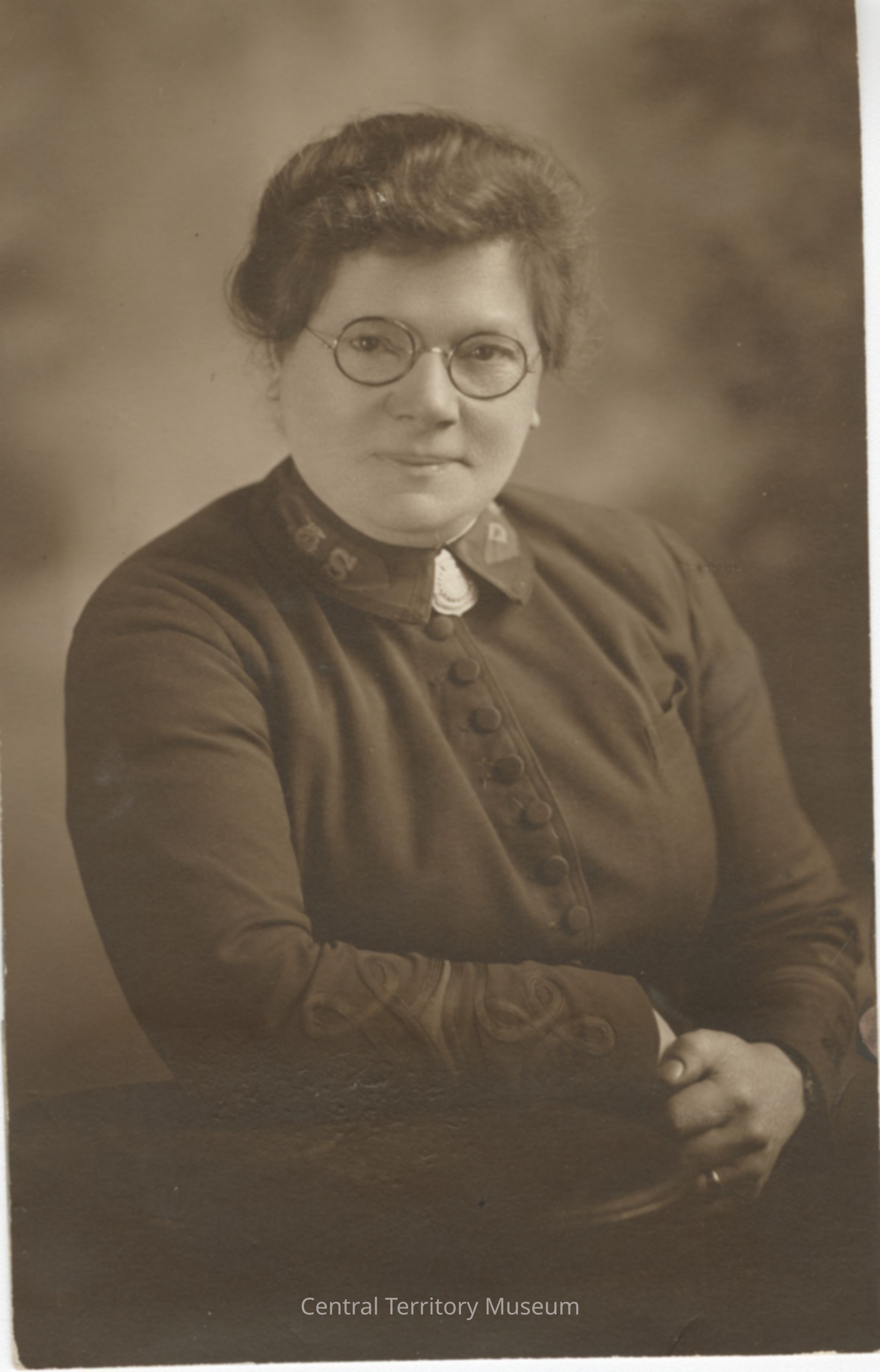 Postcard with a sepia toned photo of Brigadier Mary J. (Casley) Sheppard. She is posed with her right arm crossed in front and her left hand clasping the right wrist. Her uniform sleeve has intricate braiding, indicating her rank. She has a Salvation Army brooch at the throat of her bodice which appears to have the crest on it and is wearing metal framed eyeglasses.