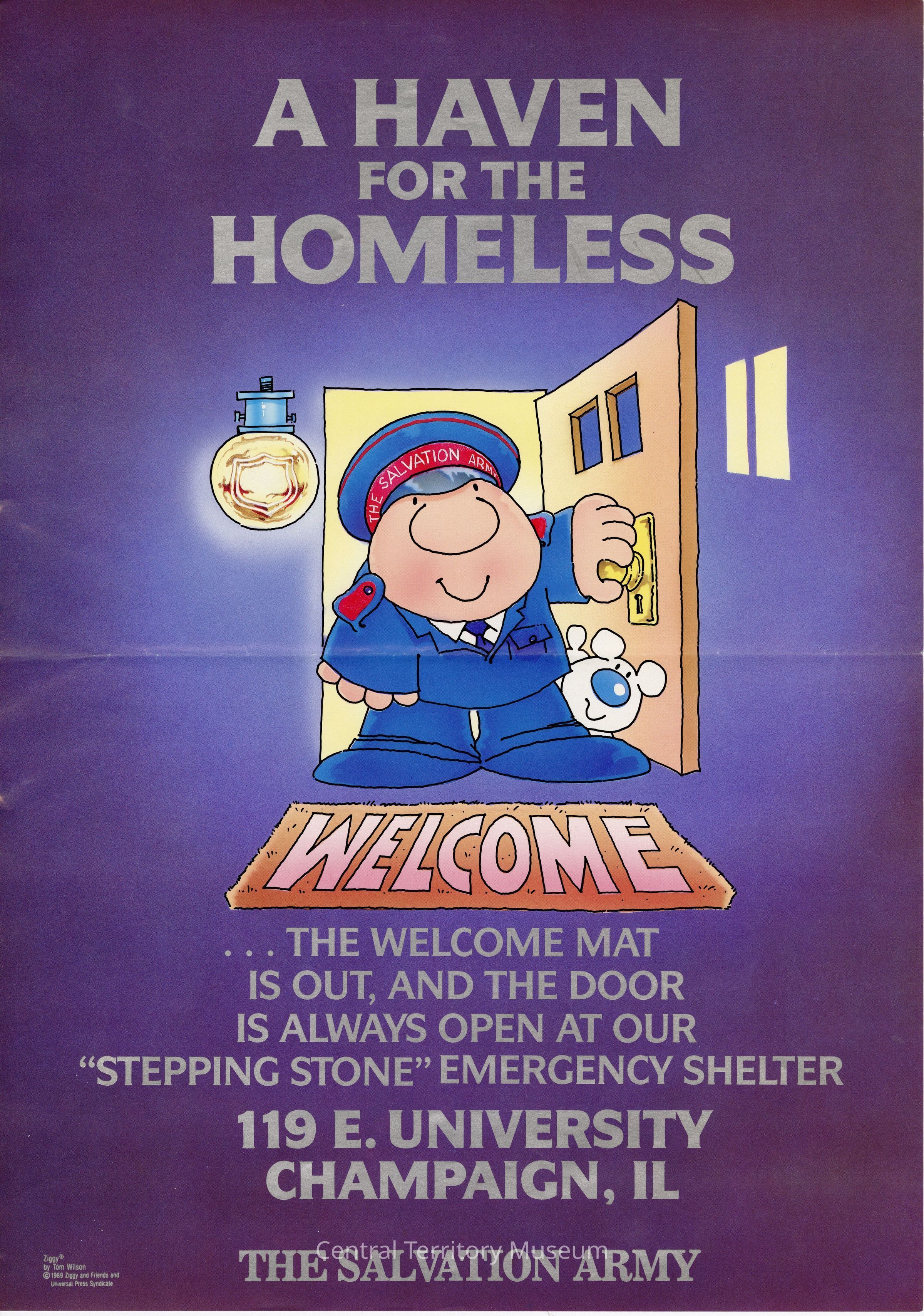 Color poster, featuring the cartoon character Ziggy, dressed in a Salvation Army uniform, standing in the doorway of a home with the door open. A light is glowing next to the door and the background is also lit. A small white dog, Fuzz, stands next to Ziggy and a welcome mat is at their feet. Text, printed in silver, above the cartoon, reads: A Haven for the Homeless. Text below, also in silver, reads: ...The Welcome Mat is out, and the door is always open at our "Stepping Stone" Emergency Shelter. / 119 E. University / Champaign, IL / The Salvation Army. The artist's name, publisher information, and year are printed in the lower left corner.Acquisition