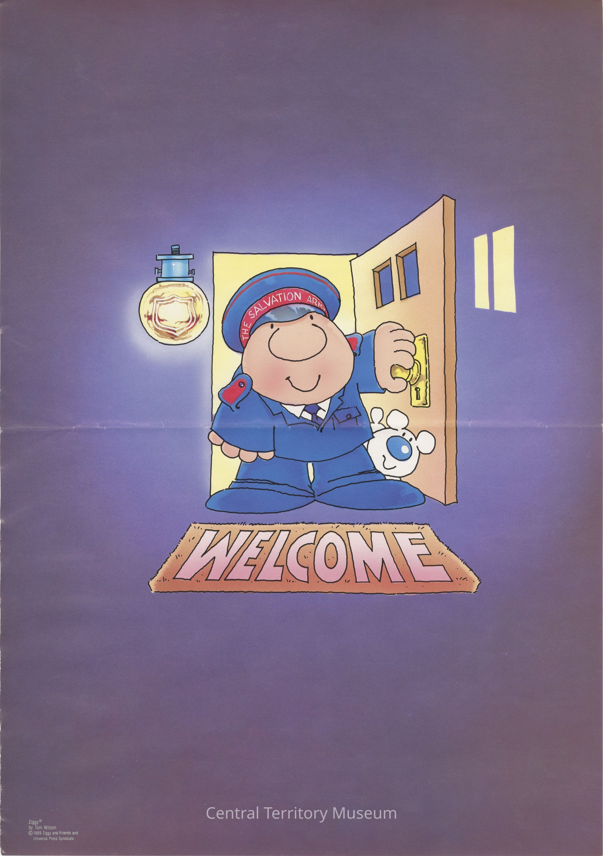 Color poster, featuring the cartoon character Ziggy, dressed in a Salvation Army uniform, standing in the doorway of a home with the door open. A light is glowing next to the door and the background is also lit. A small white dog, Fuzz, stands next to Ziggy and a welcome mat is at their feet. The artist's name, publishing information, and year are printed in silver in the lower left corner.Acquisition