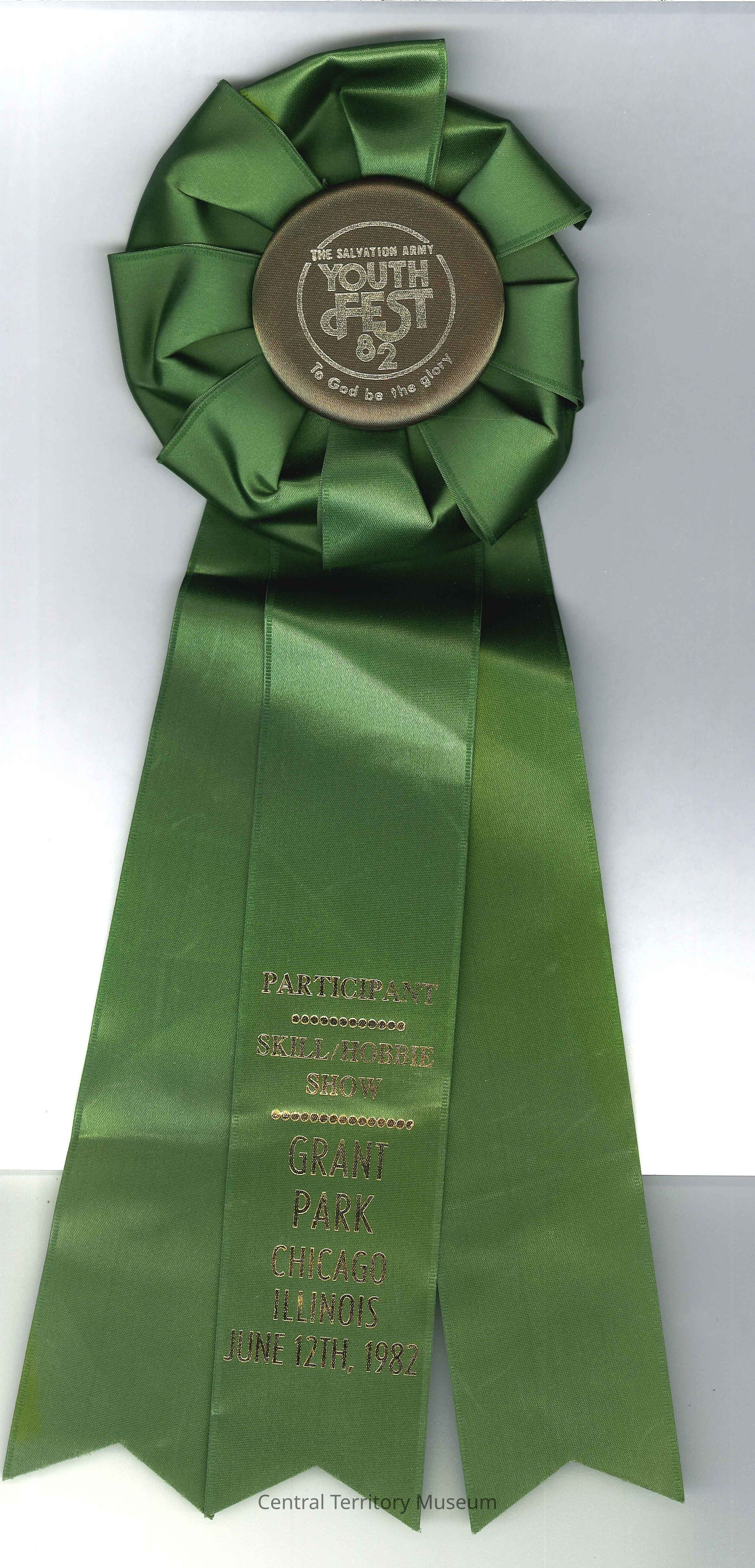Prize ribbon, green satin rosette with a darker aged bronze center disc and three green streamers. The center disc has the logo for The Salvation Army Youth Fest in its center. The middle stream has text, printed in gold: Participant | Skill / Hobbie Show | Grant Park Chicago Illinois June 12th, 1982.