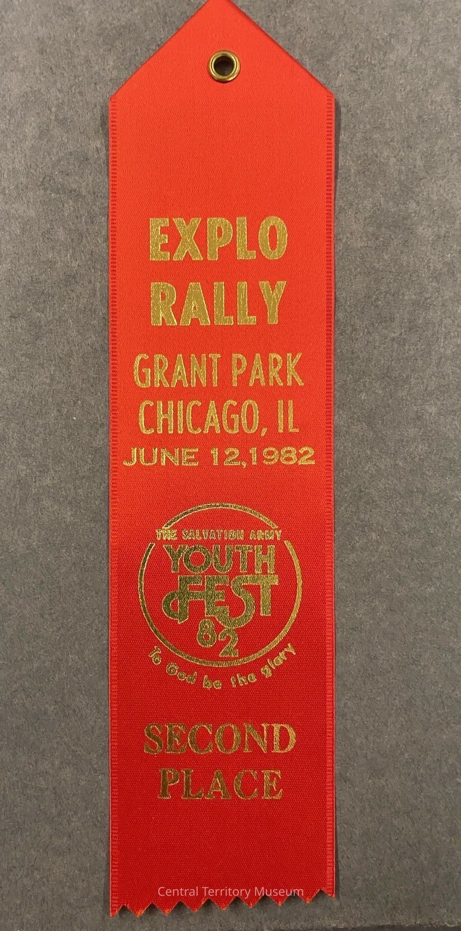 Prize ribbon given out during the 1982 Youth Fest / Youth Explo. The red satin ribbon has the following text, printed in dark gold: Explo Rally / Grant Park Chicago, IL / June 12, 1982; followed by the Youth Fest logo; then text: Second Place. A brass grommet is at the top of the ribbon. The remnants of a paper tag are on the back.
