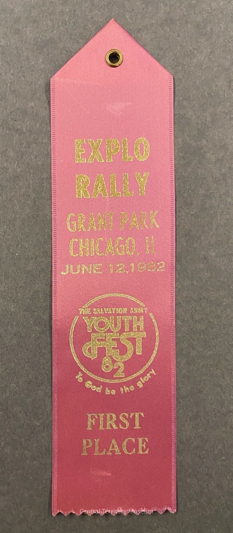 Prize ribbon given out during the 1982 Youth Fest / Youth Explo. The purple satin ribbon has the following text, printed in dark gold: Explo Rally / Grant Park Chicago, IL / June 12, 1982; followed by the Youth Fest logo; then text: First Place. A brass grommet is at the top of the ribbon. The remnants of a paper tag are on the back.