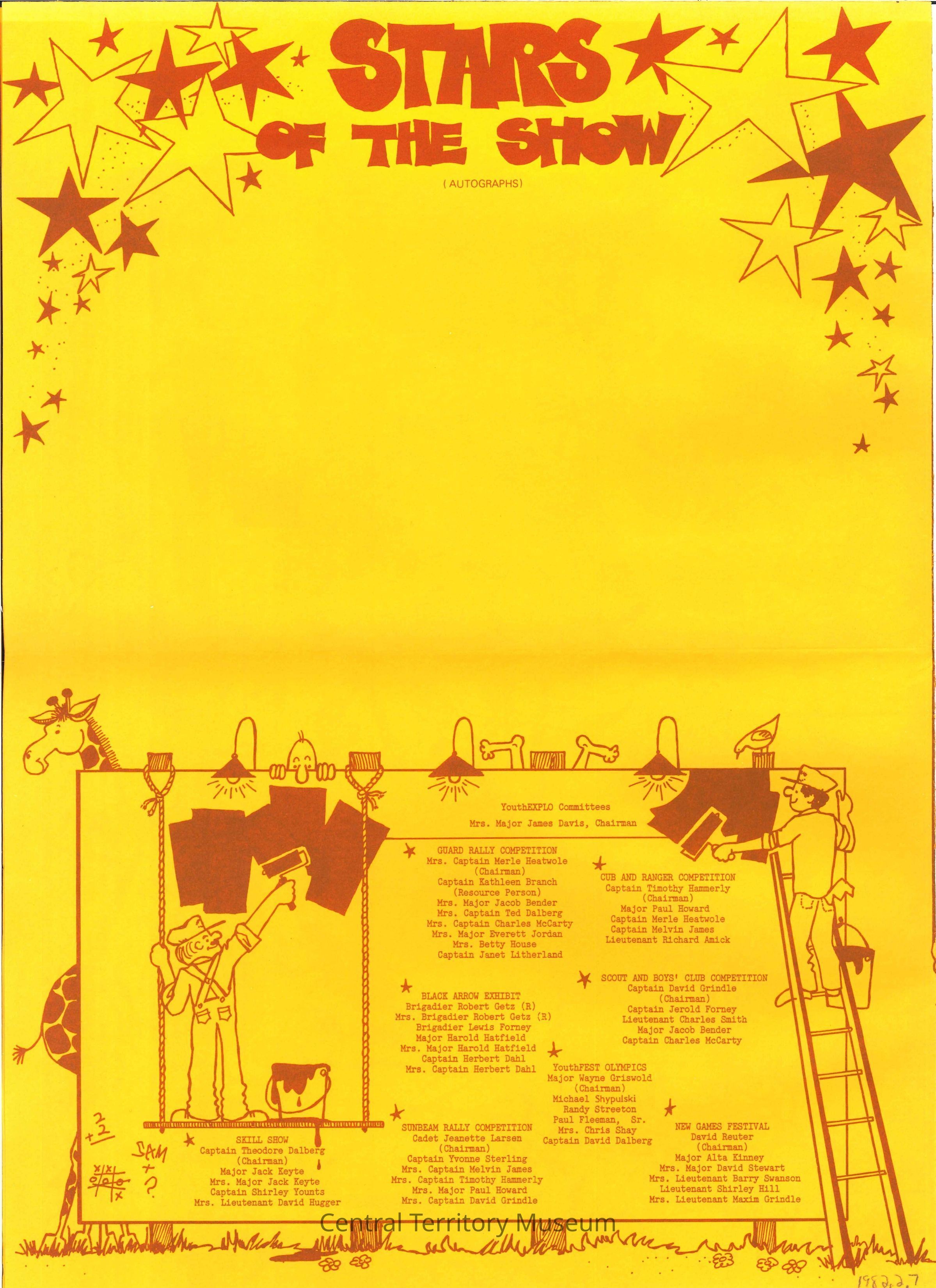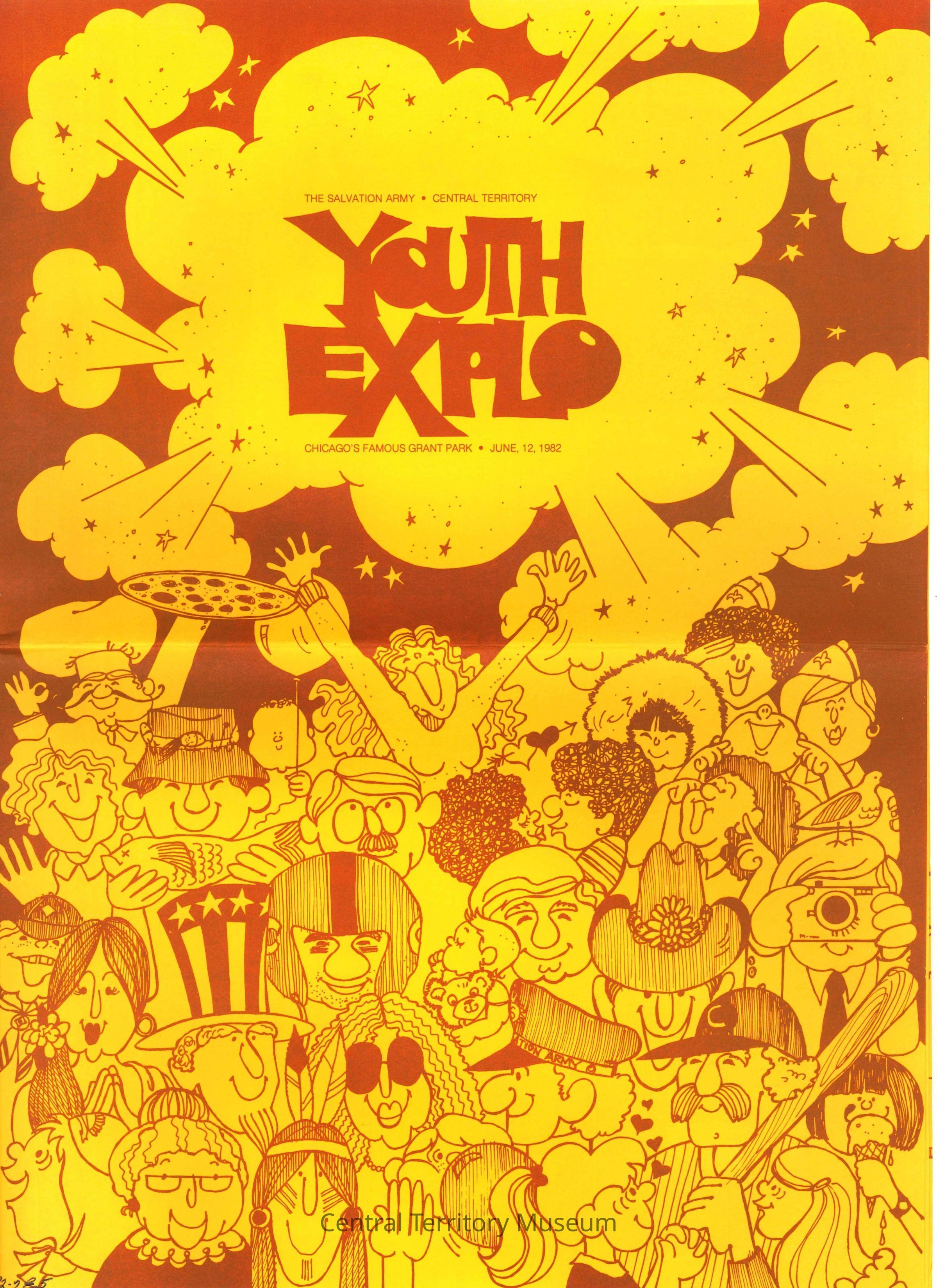 Program, quarter fold, from the 1982 Youth Explo, held in Grant Park, Chicago, Illinois. The cover page is folded in half, with one half containing a graphic of clouds and stars exploding off a main cloud that contains the title, location, and date. The other half contains caricature illustrations of people of different ages and occupations. The interior page has illustrations and text blocks highlighting the array of activities, rallies, parades, and demonstrations taking place. The brochure opens up further into a large illustration highlighting not just The Salvation Army Explo taking place in Grant Park but also highlights of Chicago from Soldier Field to the Picasso sculpture, Sears Tower, the John Hancock, and Lake Michigan. The final page has a half page, decorated with stars, intended for autographs, and a half page listing all of The Salvation Army officers and cadets who worked on creating the Explo.Acquisition