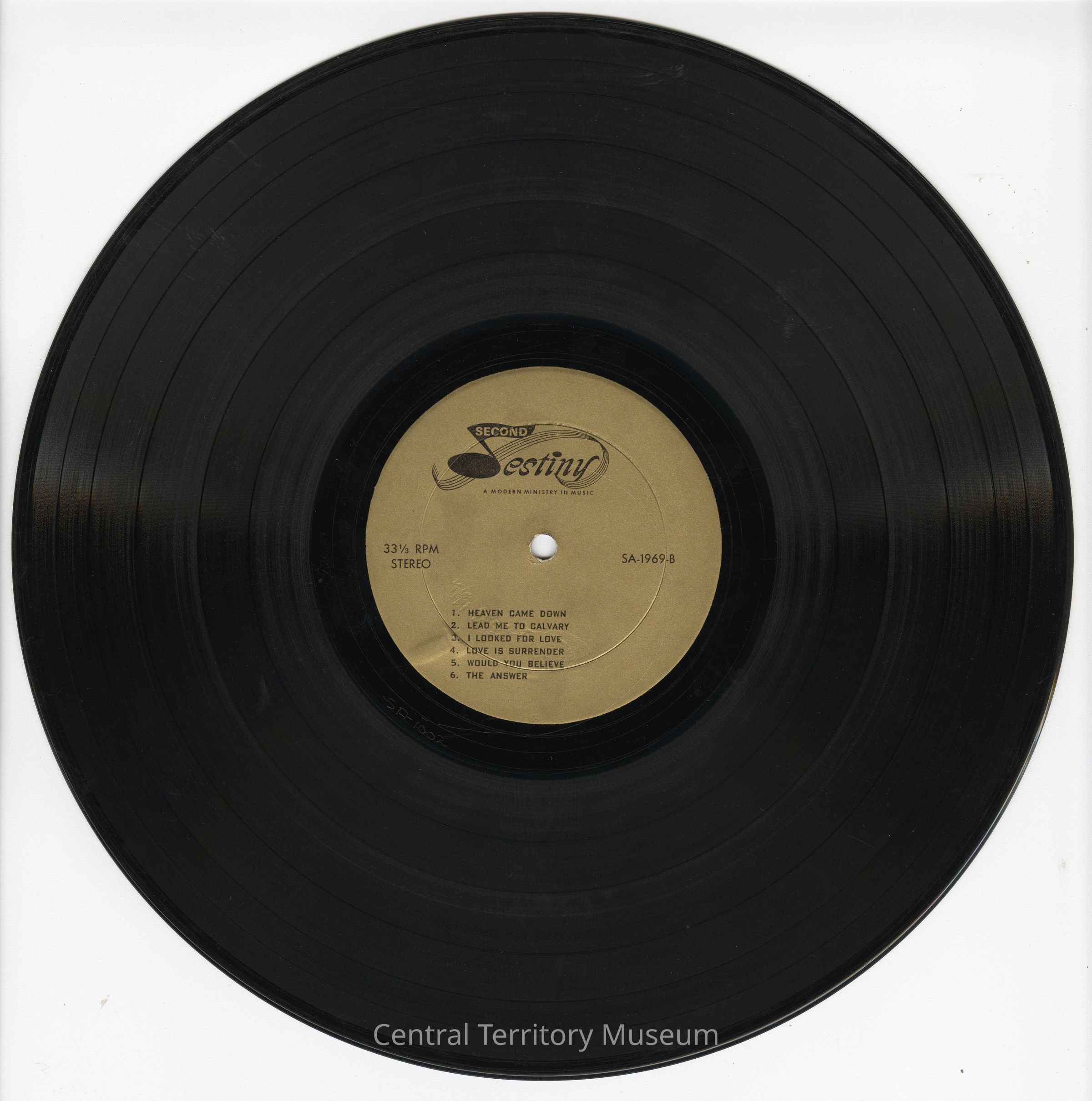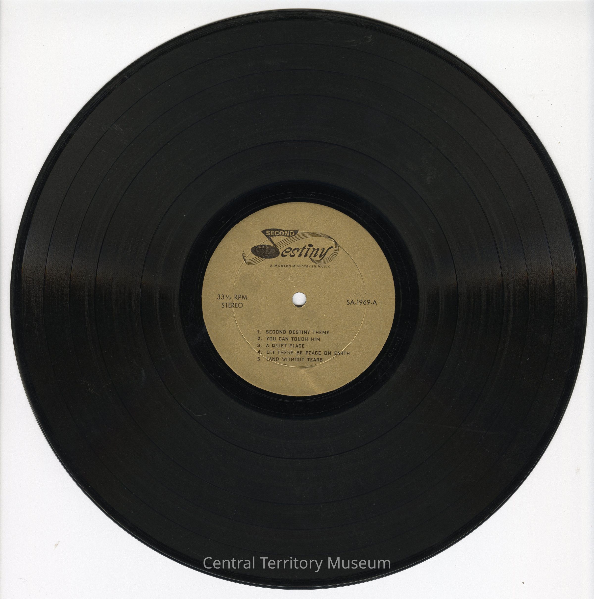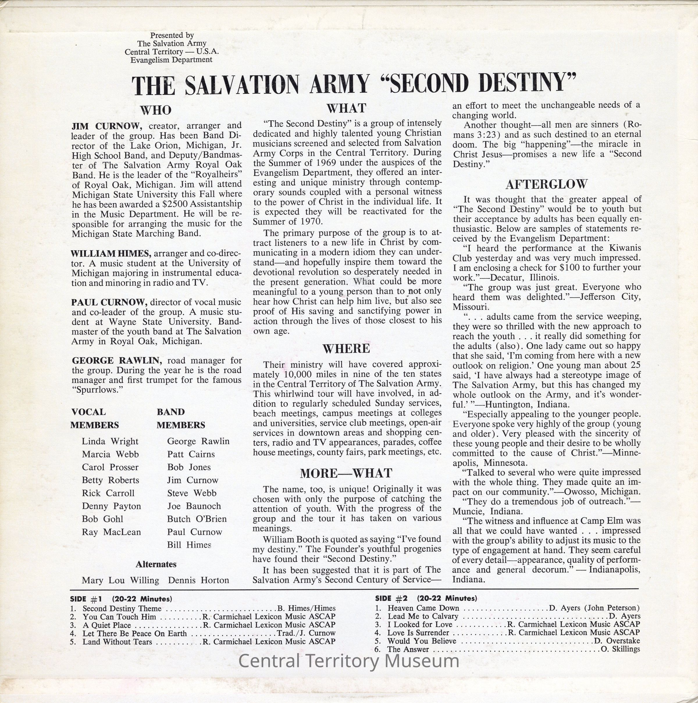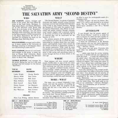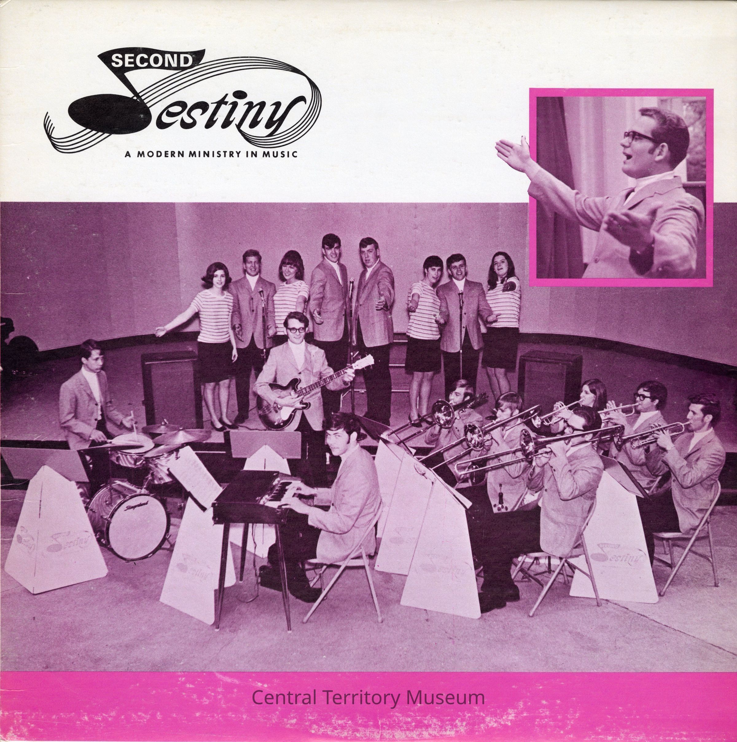 Record, music, 33 1/3 RPM. The record is title Second Destiny: a Modern Ministry in Music by the band Second Destiny, produced by The Salvation Army Central Territory Evangelism Department. The record jacket has a white background with the title / band name printed in black near the upper left corner. A pink tinted black-and-white photo of the musicians and vocalists is printed across the lower section with a pink tinted black-and-white photo of the band leader inset near the top corner. A wide pink border is under the photo.