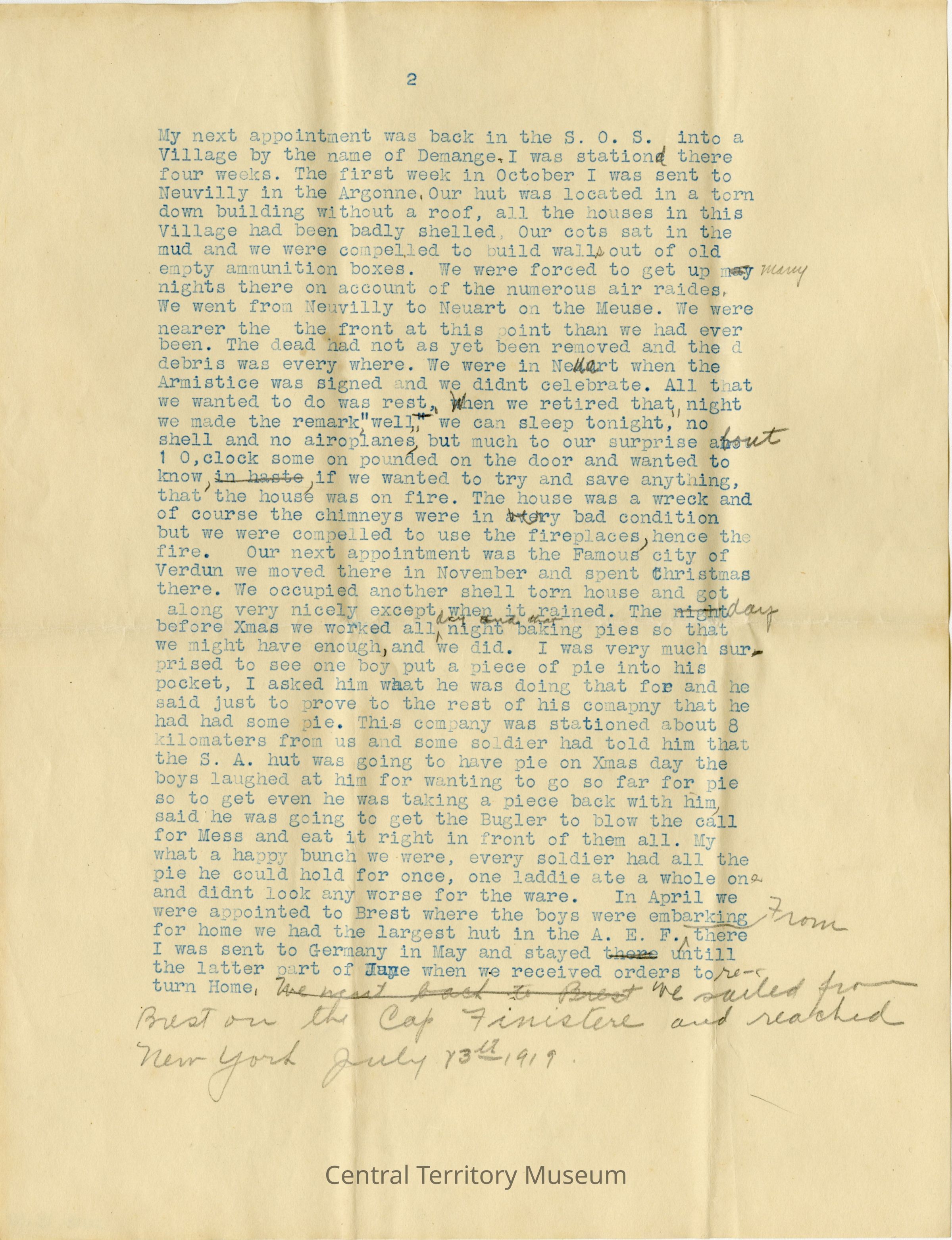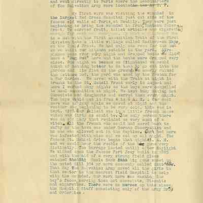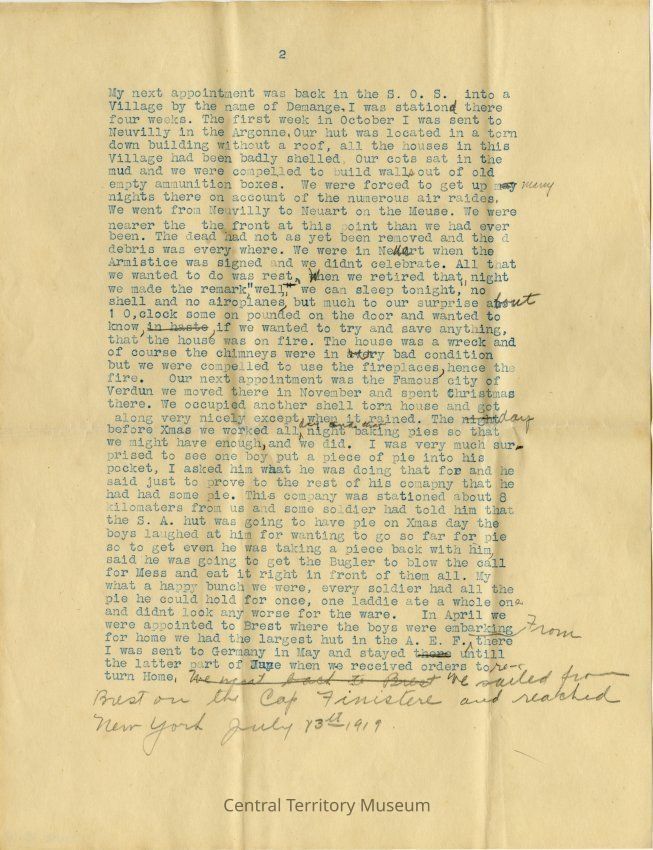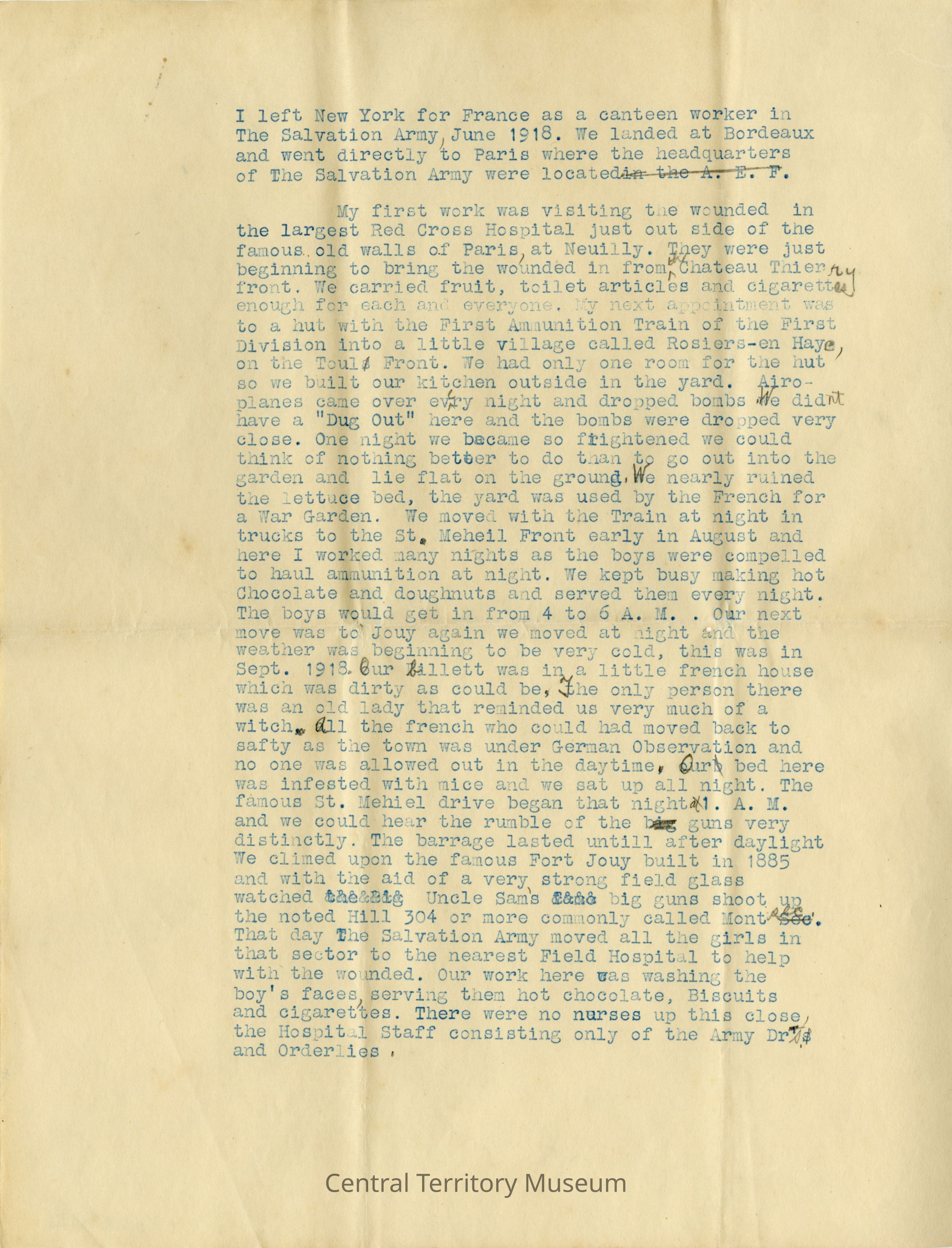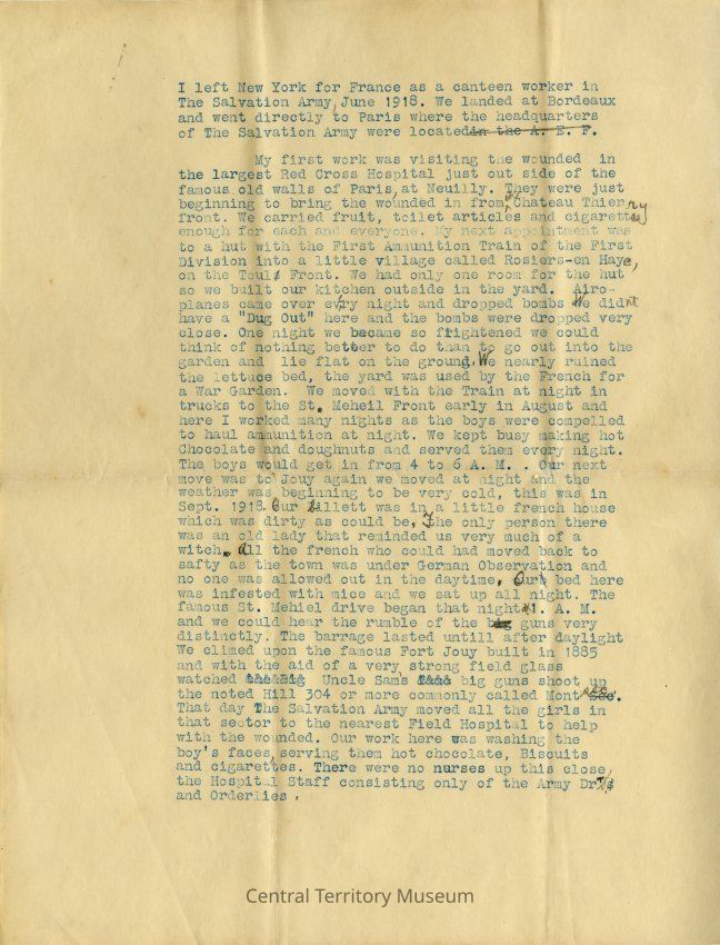 After action report of Cecil Burdick's overseas work with The Salvation Army during World War I . The report details her movements over time, the duties she performed, and memories from her time serving. The document is a draft version of the final report. It is typscript (blue ink) with editing marks in pencil throughout. The report is two pages in length, each printed on one side of two different sheets of paper.