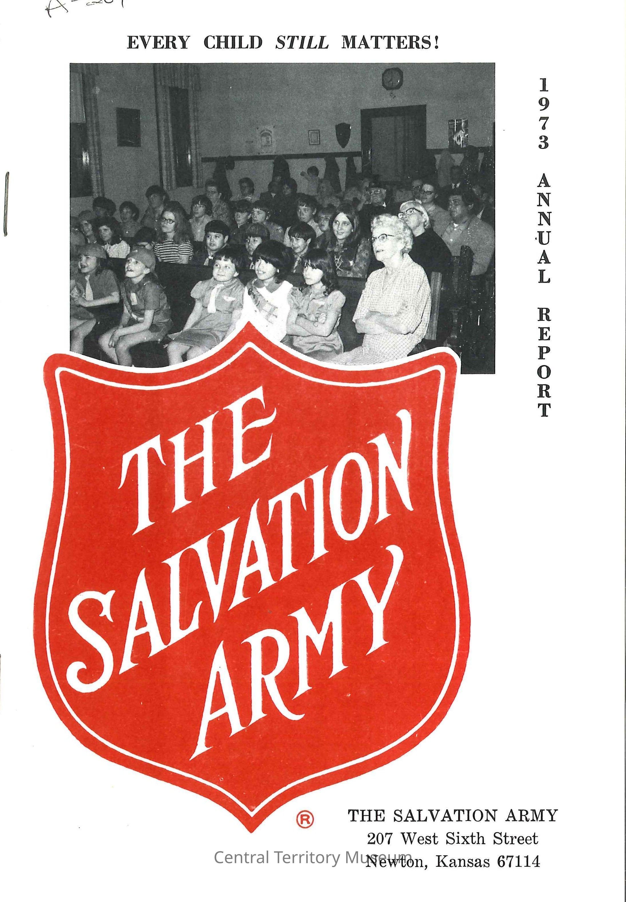 Annual report for Newton, KS corps, 1973. The cover, printed on glossy paper, has a large Red Shield and a black & white photo of a children's meeting. The title and year are printed in black vertically next to the photo. The corps address is printed in the lower right corner. Page 2 has a black & white photo of the corps building. The years of service to Newton and the surrounding area are printed below. Page 3 has a letter from John P. Dickey, the Advisory Board Chairman, printed on his business (Dickey Music Co) letterhead. Page 4 has a letter from Lt. James A. Birney, corps officer and page 5 contains the income and expense report. Pages 6 and 7 details the statistics of service to others and the Christmas report. A black and white photo of corps service in action is printed on page 7. Pages 8 and 9 have a montage of photos showing service to children and upcoming programs. Page 10 lists the Advisory Board members and acknowledges volunteer service. Page 11 has The Salvation Army mission statement and requests consideration when estate planning. The back cover has a verse, written by William Pearson and printed in The Salvation Army Song Book No 789, and a Red Shield logo.