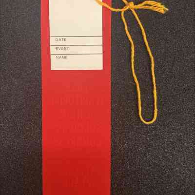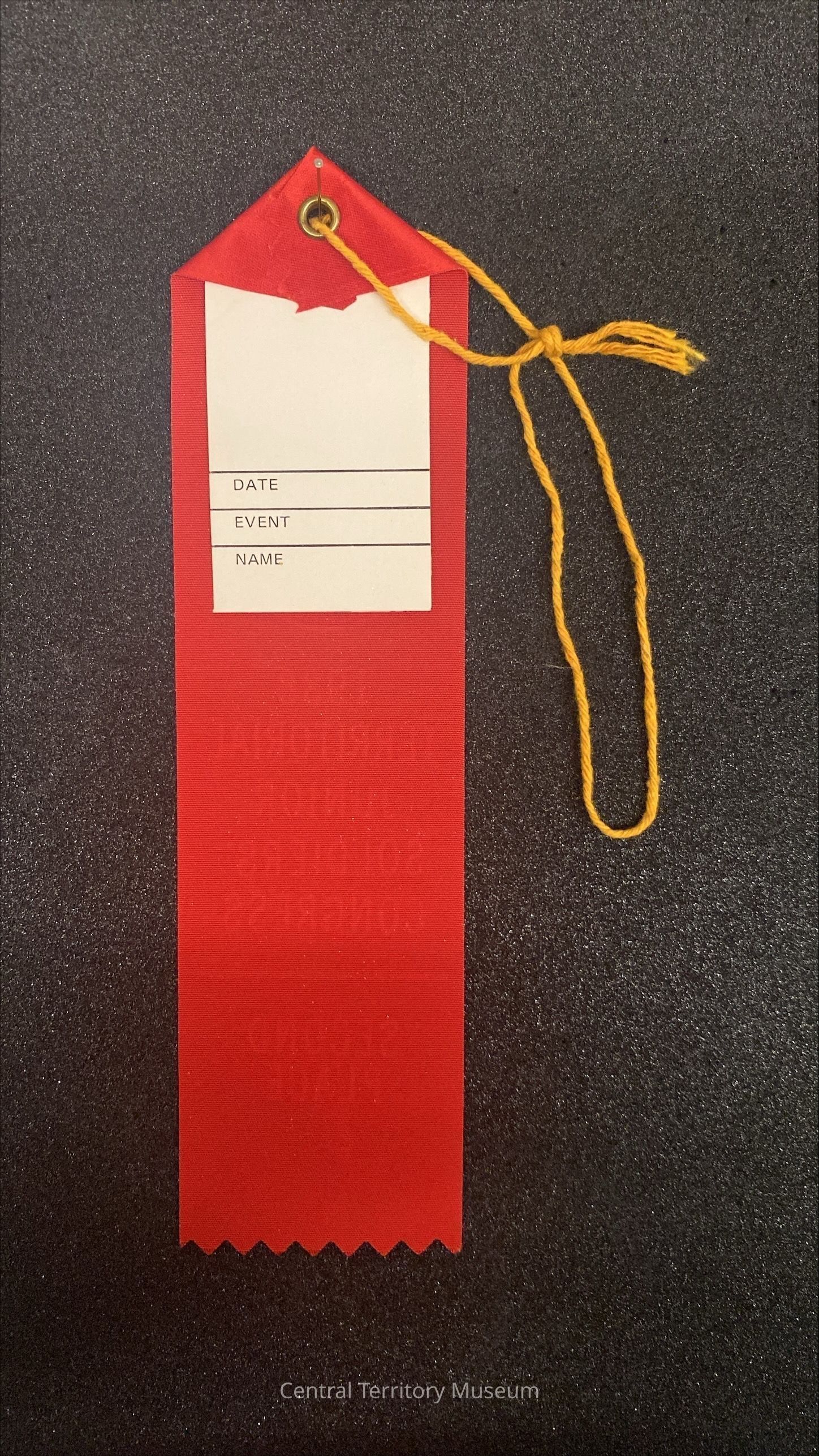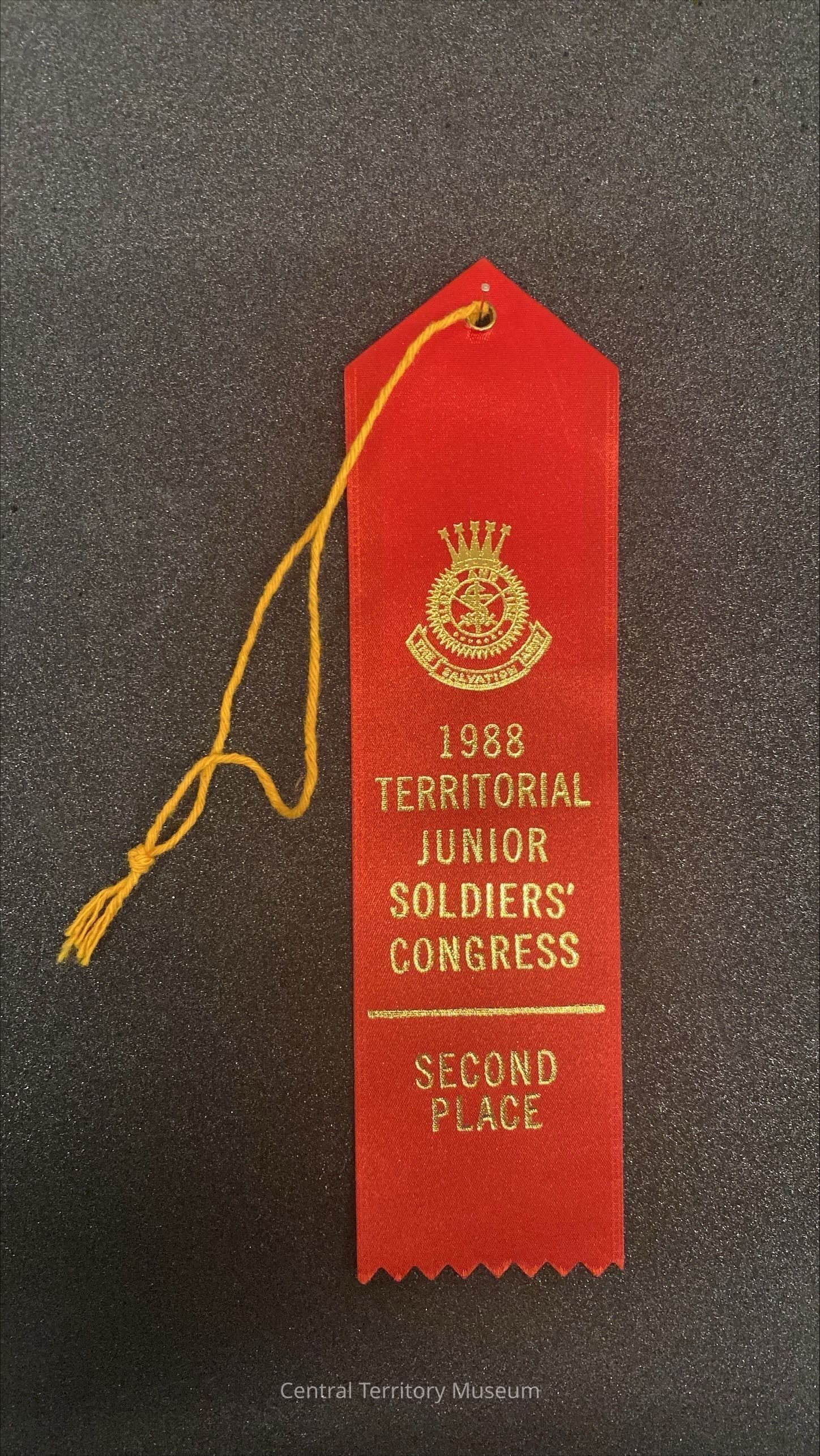 Red acetate prize ribbon. Text, printed in gold, reads: 1988 Territorial Junior Solders' Congress | Second Place. The Salvation Army crest with crown is printed above the text. A yellow cord hangs from a metal grommet near the top edge. The back of the ribbon has a paper card with preprinted text for the date, event, and the name of the winner.