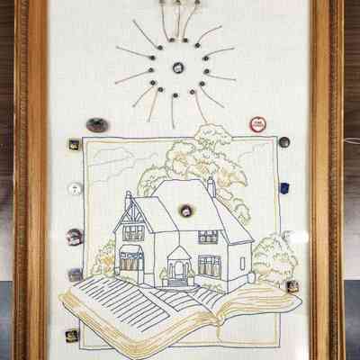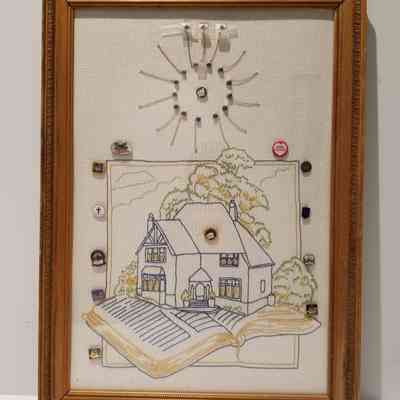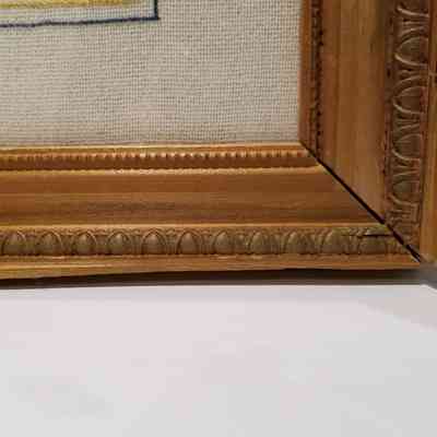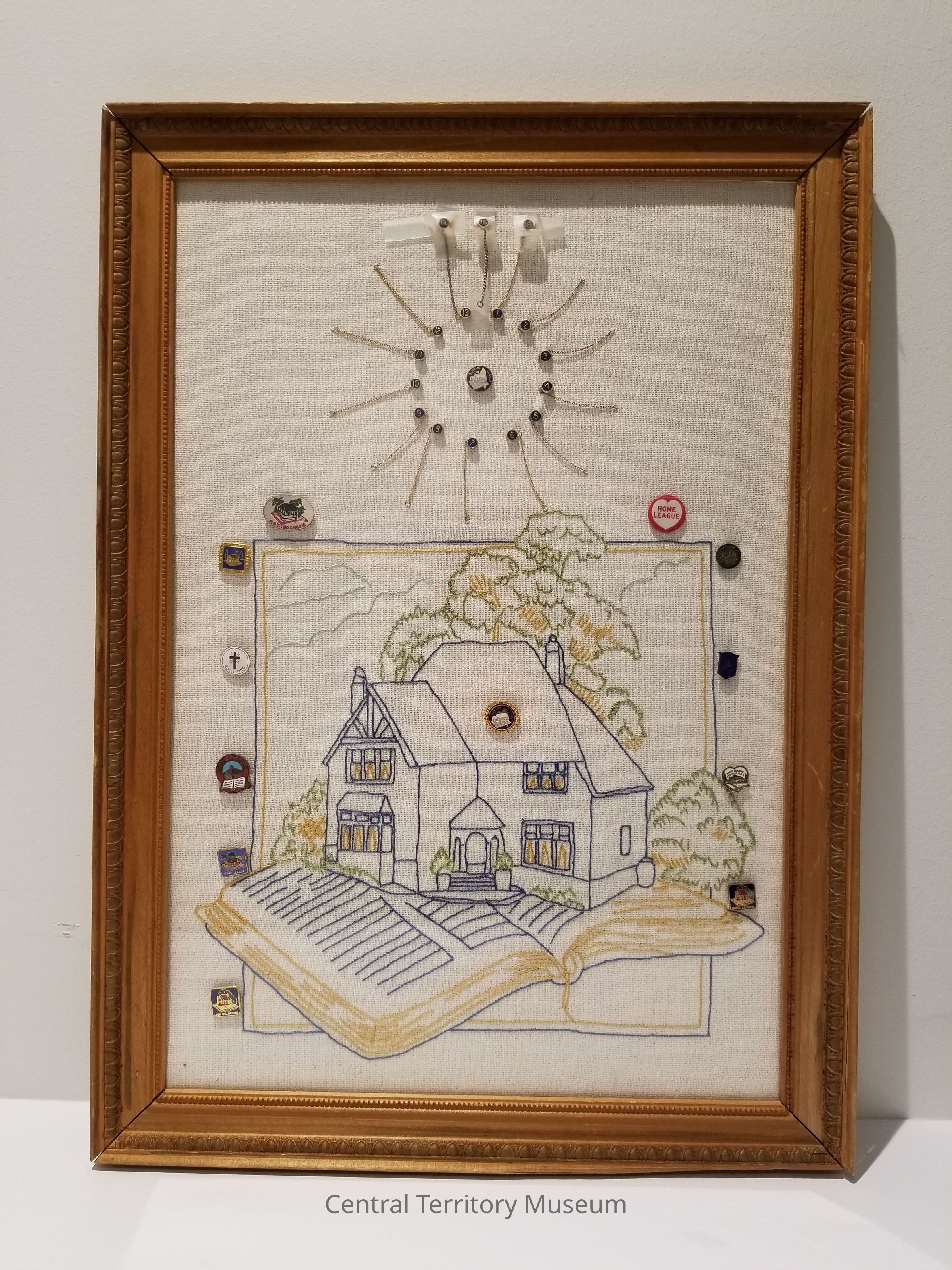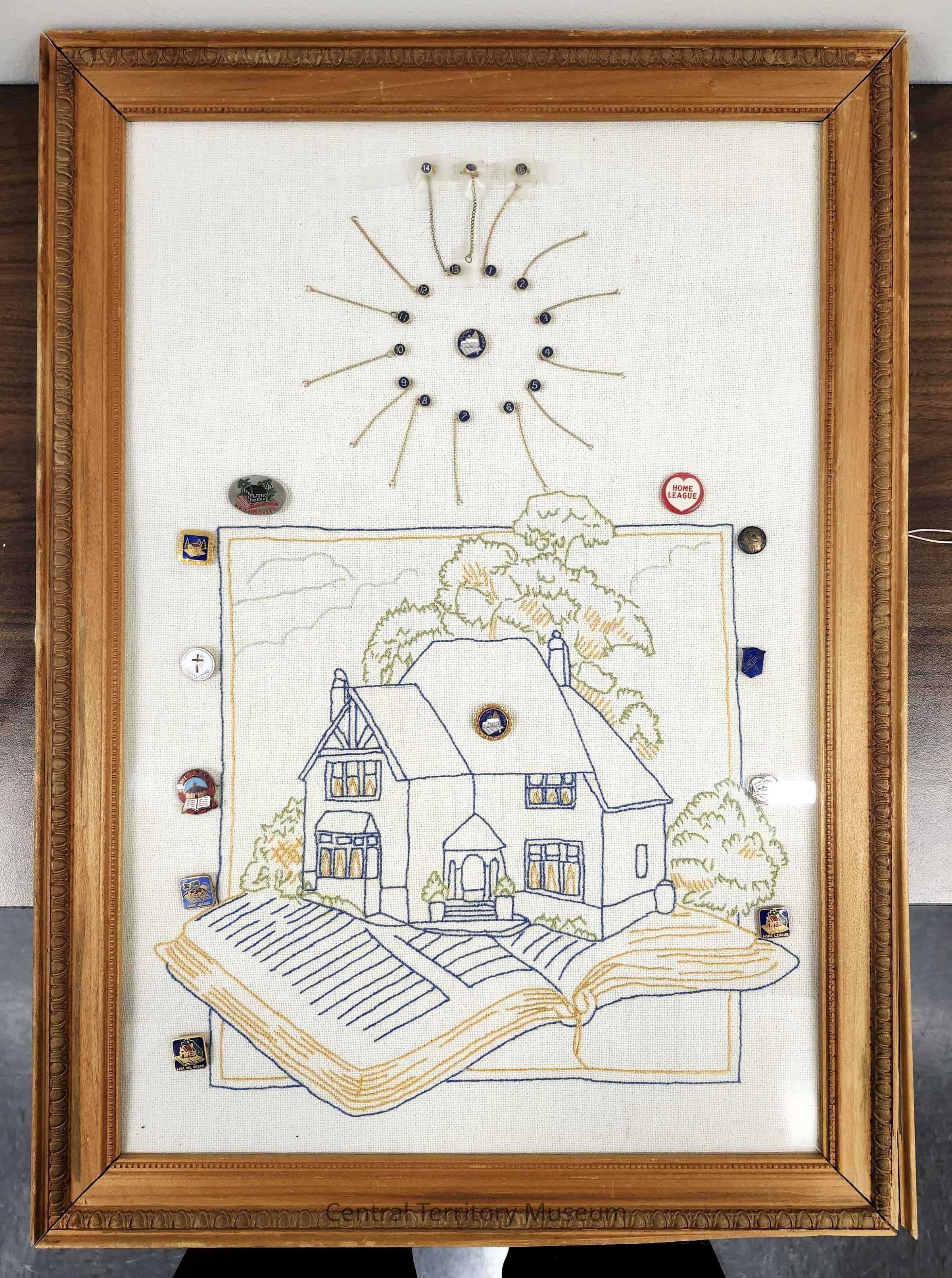 Framed embroidery depicting The Salvation Army Home League logo done in back stitch on fabric. Home League pins have also been added to the embroidery and three additional pins are affixed to the glass covering with Scotch tape.