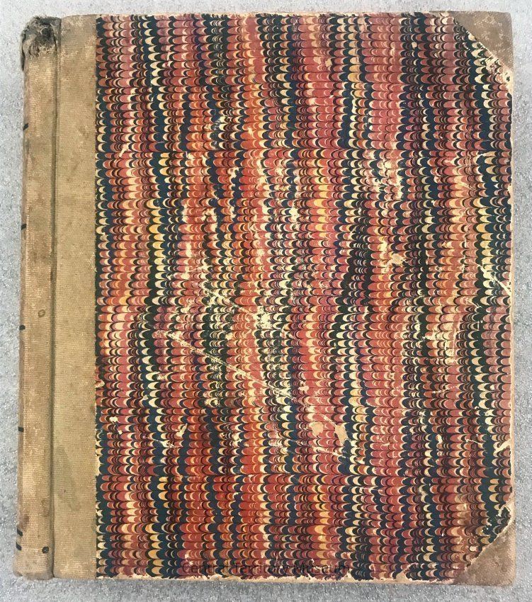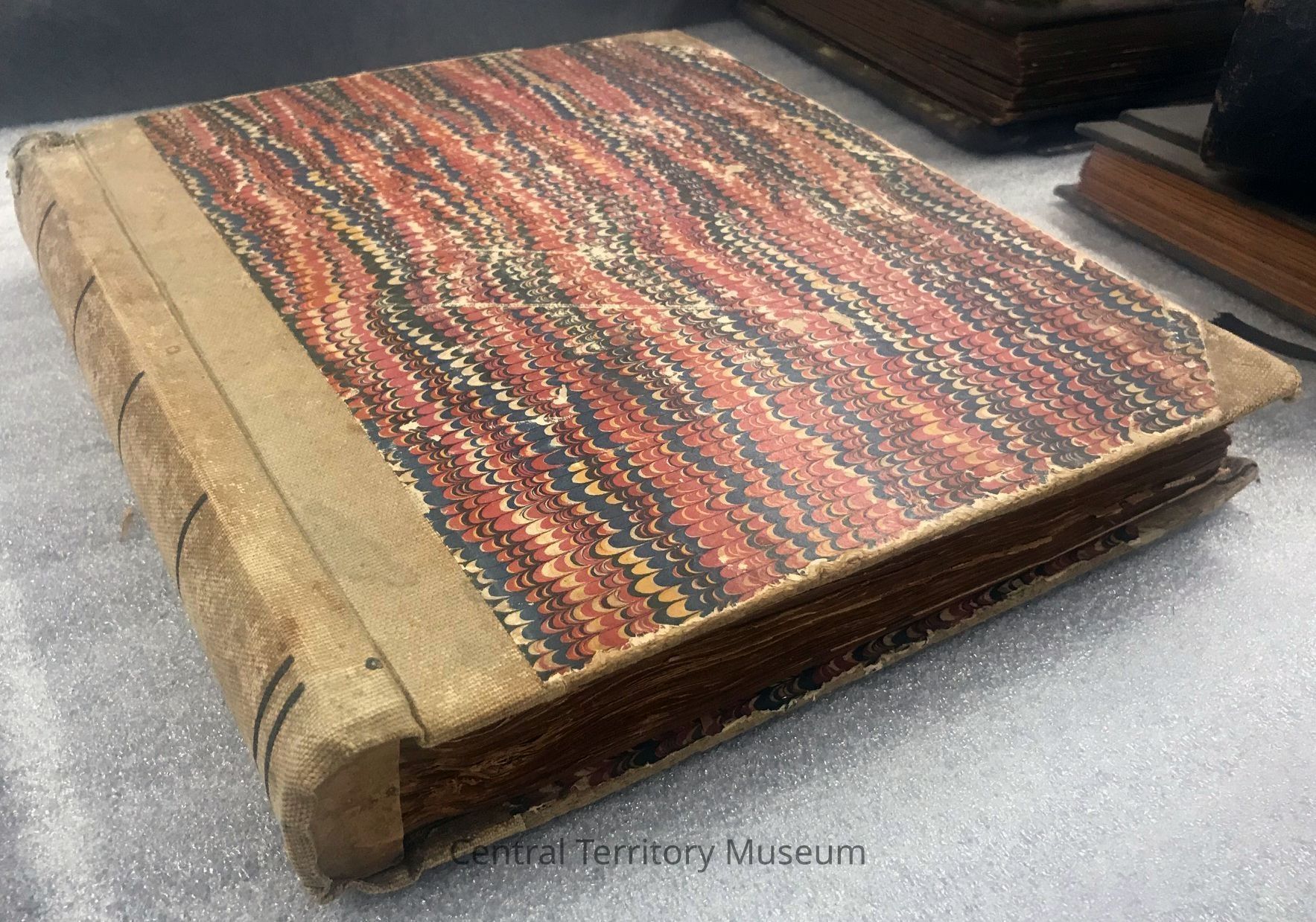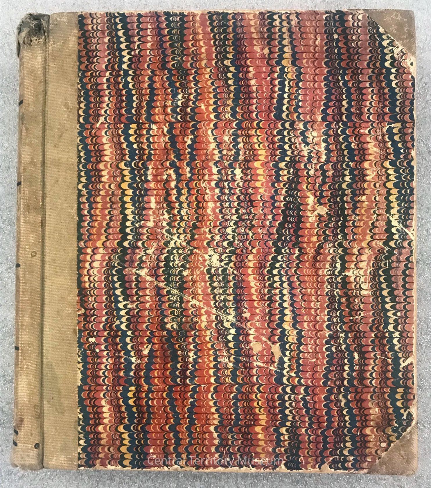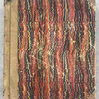 Marbled print paper (red, blue, green, yellow, black, white) hard cover with tan binding.Acquisition