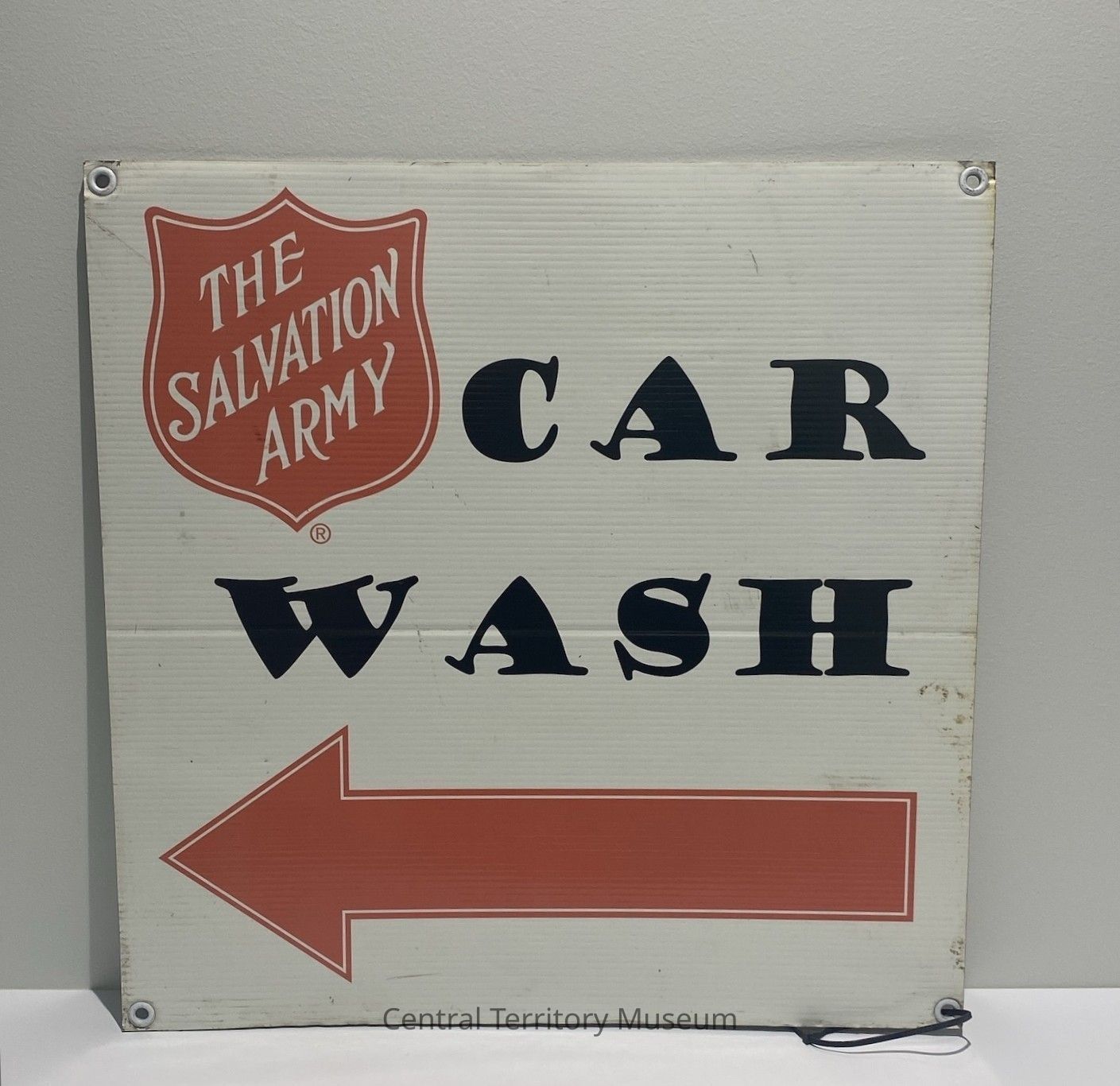 Sign, printed on white Sintra, with four metal grommets in each corner, with text on one side. A Salvation Army Red Shield is printed in the upper left corner with text in black CAR WASH printed to its right and below. A large red arrow pointing left is printed along the lower edge.