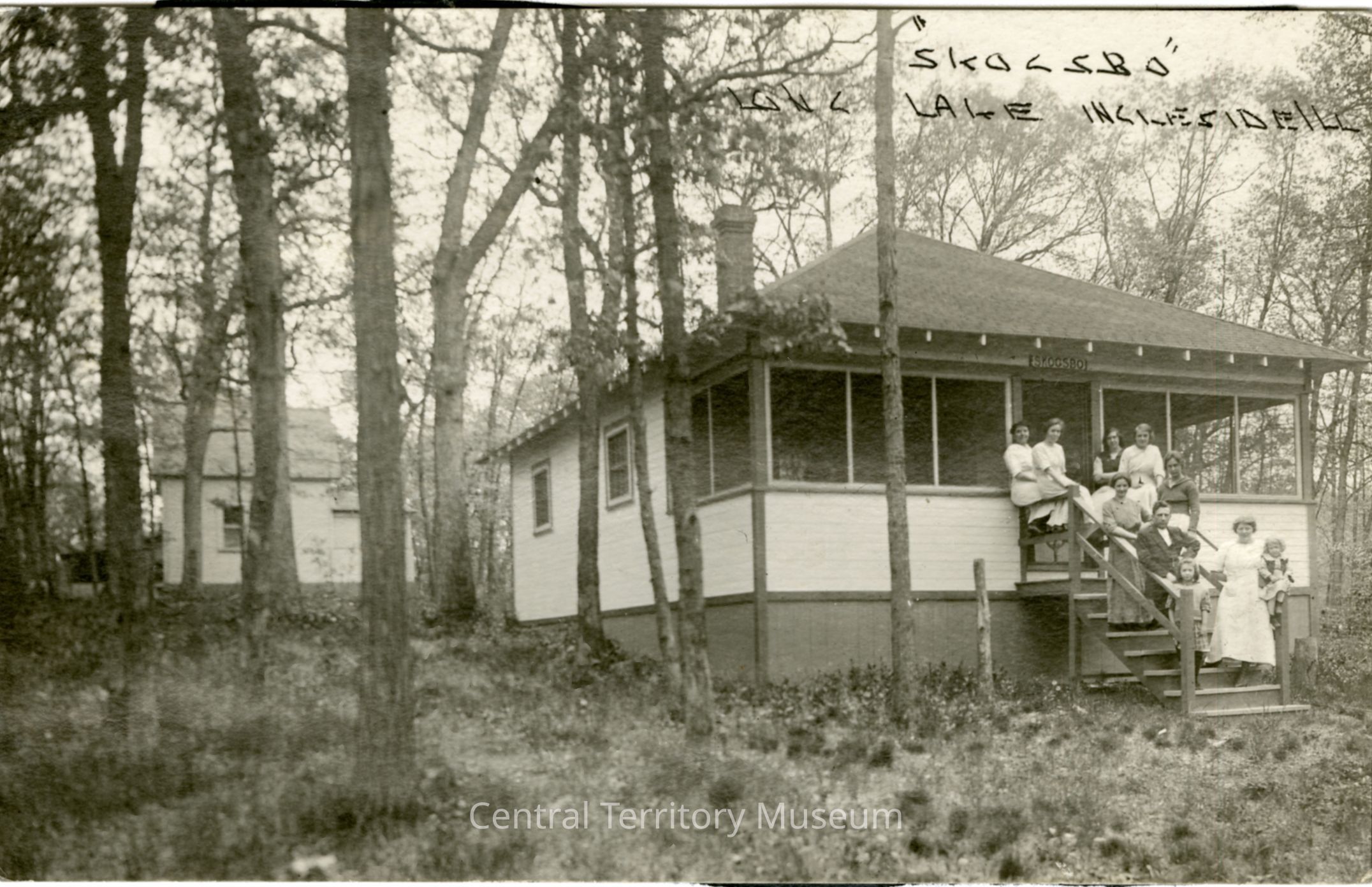 Photo postcard of a group of men, women, and children standing on the steps of a cabin, set amidst the trees. Another building can be seen in the background. A sign, "Skogsbo" is attached above the doorway. The upper right corner has the following written on it: "Skogsbo / Long Lake Ingleside ILL".