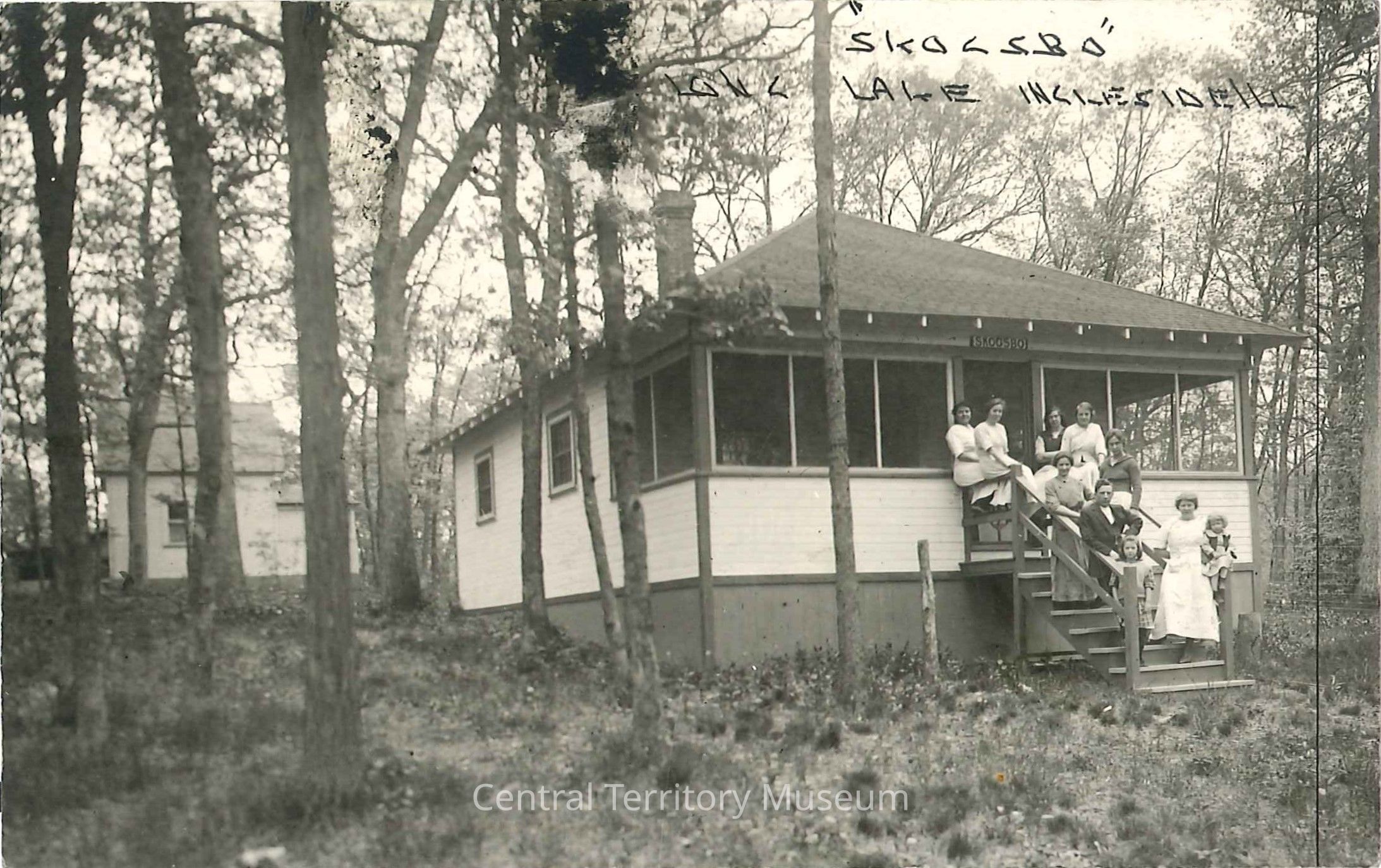 Photo postcard, depicting a cabin at Skogsbo Camp, Long Lake, Illinois. In the photo, a group of women, a man, and two children pose on the steps of a cottage. A sign "Skogsbo" is mounted over the entrance. The porch windows are screened. Another building can be seen in the background, amid the trees. In the upper right hand corner, "Skogsbo Long Lake Ingleside ILL" is printed.Acquisition