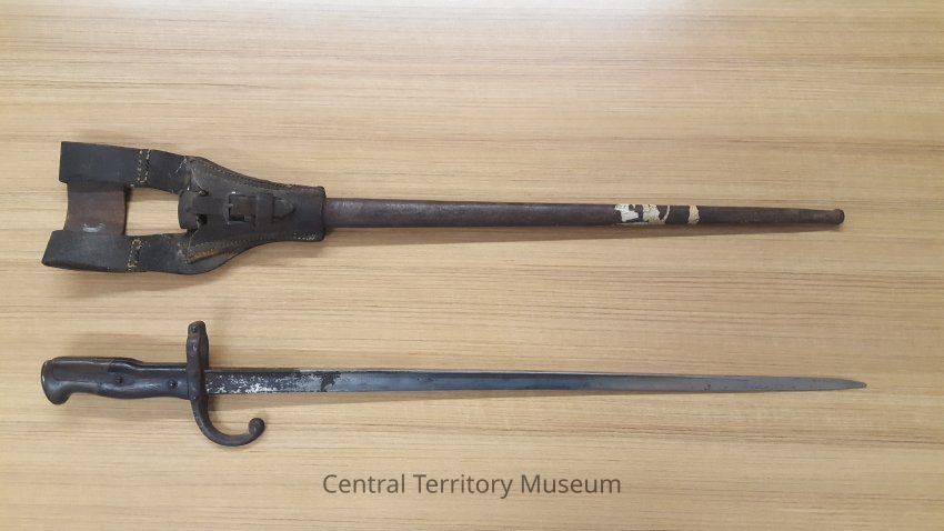 a) Bayonet sword. Top of blade is a flat edge (with a small ridge). Handle made of wood with a "J" shaped metal guard and metal-capped pommel.