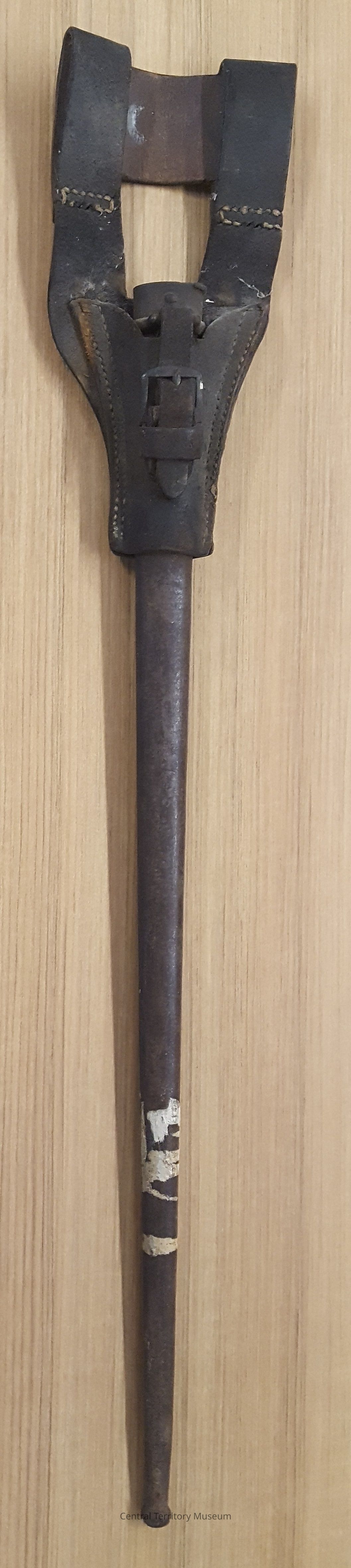 b) Iron(?) sheath with leather holster at top (the open end of the sheath)