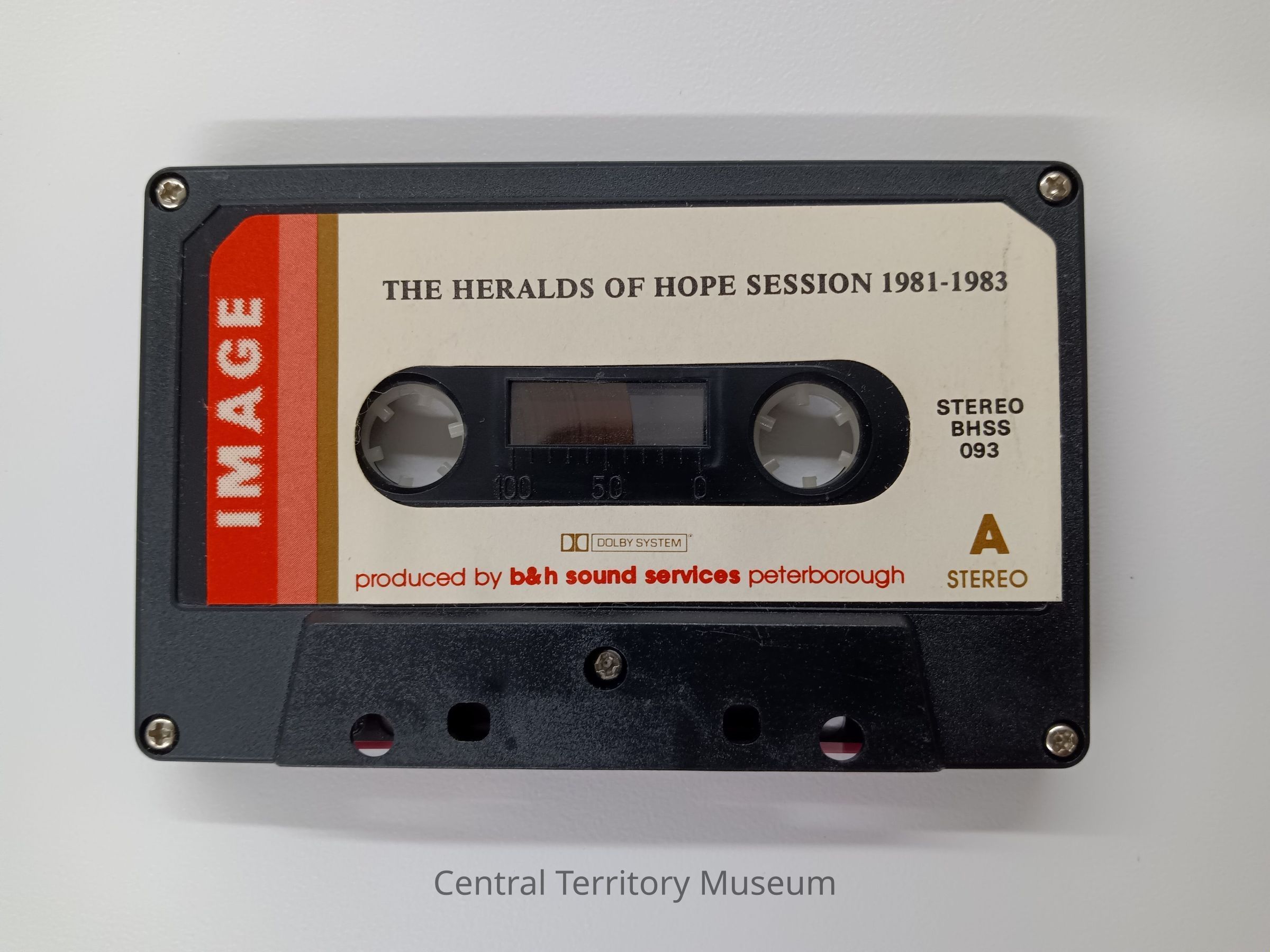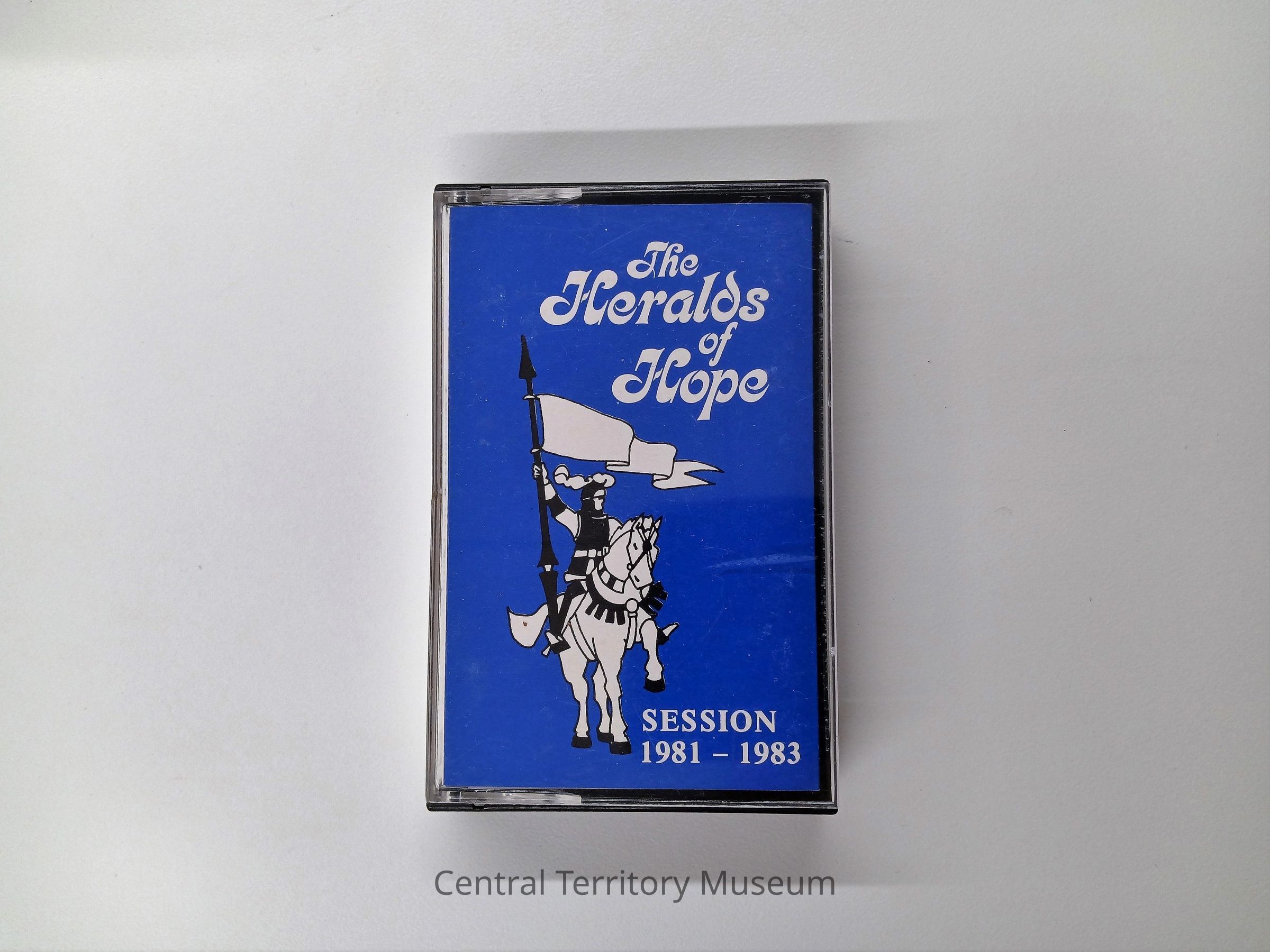 Audiocassette, sleeve, and case, "The Heralds of Hope Session, 1981-1983." Cassette is black plastic with two white labels, side A and Side B. Case is black and clear plastic. Sleeve is white with black print with a blue cover with a knight holding a flag on a horse. Produced by b&h sound services; Salvationist Publishing and Supplies Ltd., London. 2.75" H x 4.25" H x .625" D
