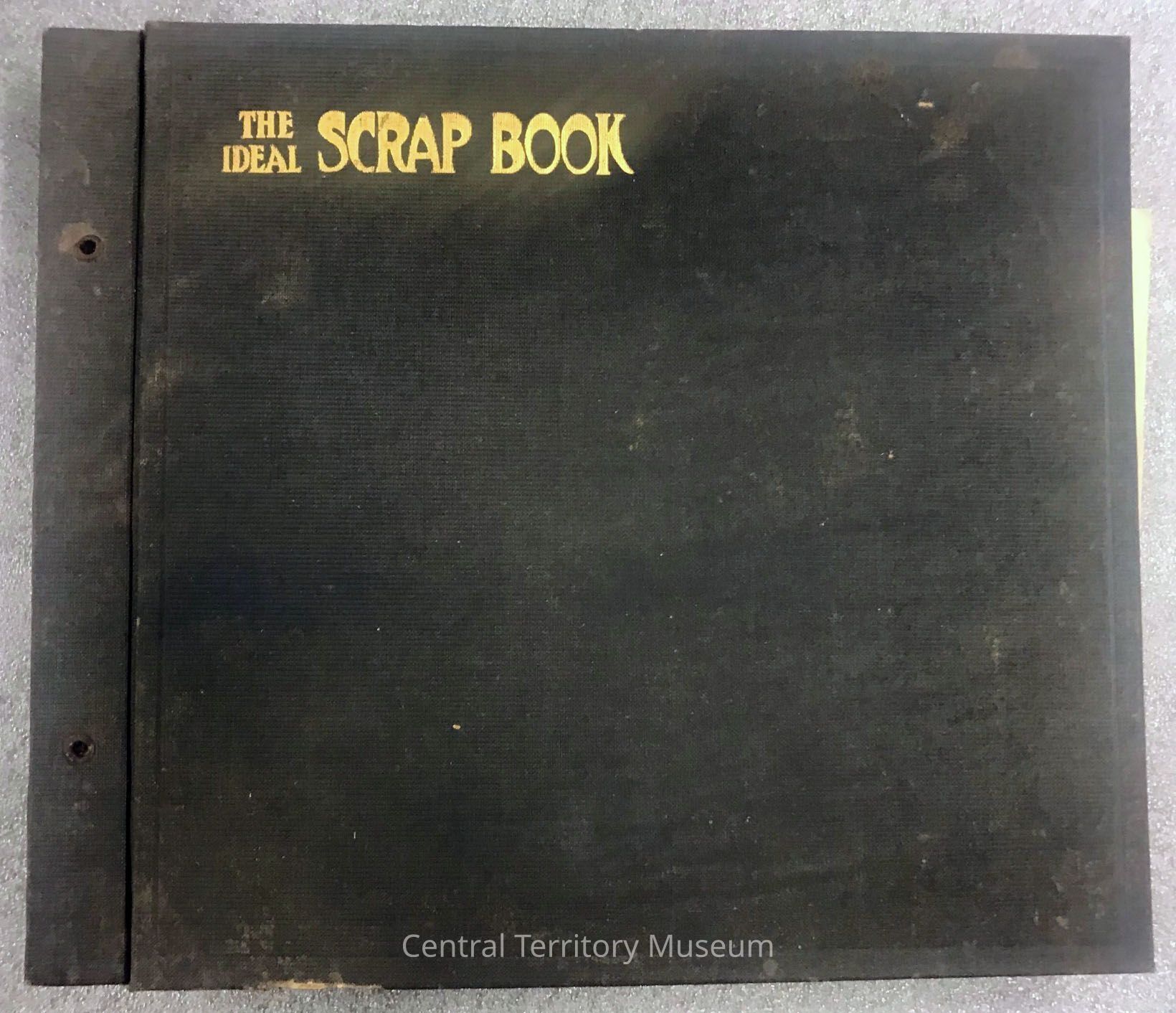 Black fabric cover with gold letterpressed title "THE IDEAL SCRAPBOOK" in the upper lefthand corner of the front cover.