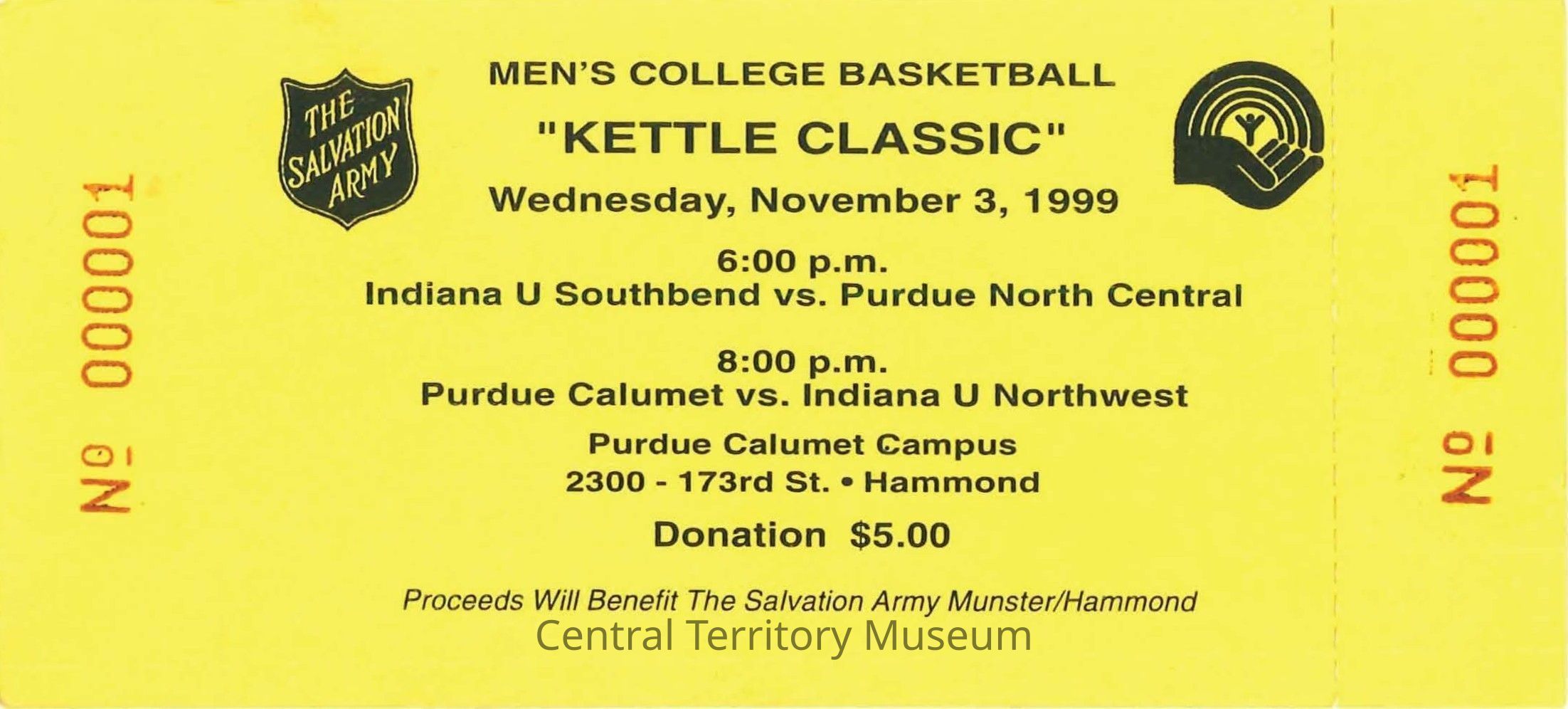 There were two games played that evening. The first, starting at 6 pm, featured Indiana U Southbend vs. Purdue North Central, and the second game started at 8pm between Purdue Calumet vs. Indiana U Northwest. The games were played at the Purdue Calumet Campus in Hammond, Indiana. A suggested donation of $5 is printed on the ticket with proceeds benefitting The Salvation Army Munster/Hammond Corps.Acquisition