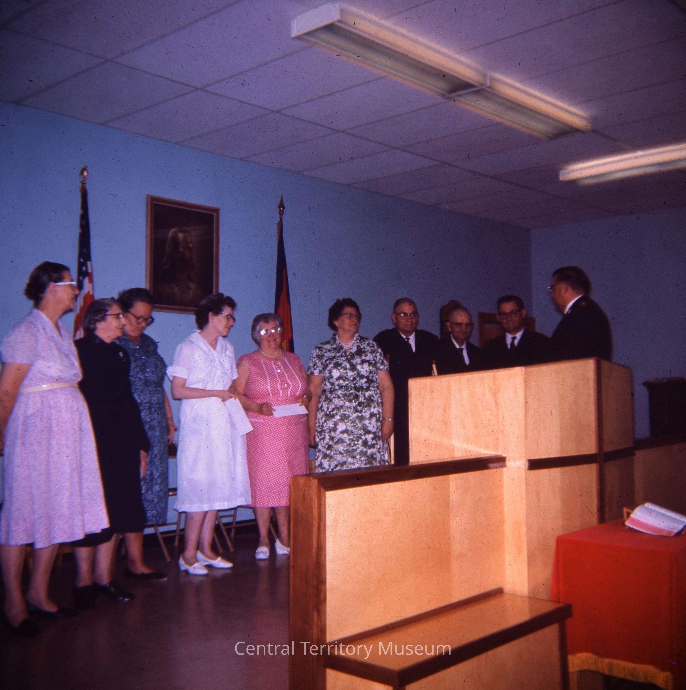 This image depicts recognition by Corps officer at Oskaloosa IA, Corps building. A group of six women and three men are standing being addressed by a man. Two of the women towards the center of the group are holding envelopes or a folded paper. Behind the group a large framed picture of Jesus Christ is hanging the wall. An American flag and a Salvation Army flag flank the picture. The slide is marked with an "11A' in pen.
