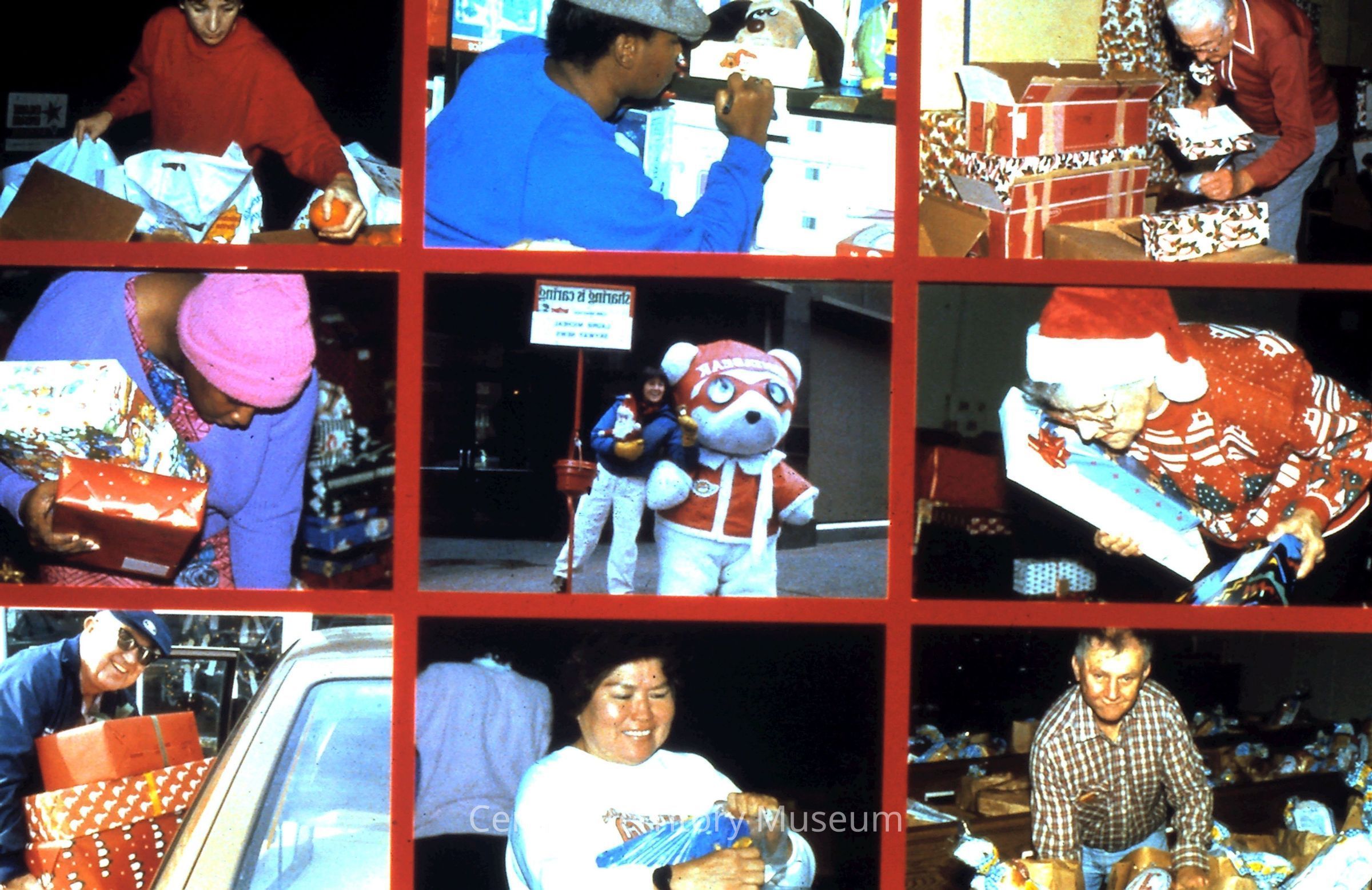 This is slide twenty-seven of the presentation, The Song of the Bell. There are nine images on this slide with a red border around the photos. Each person pictured is a volunteer for different aspects of the Salvation Army Christmas activities.