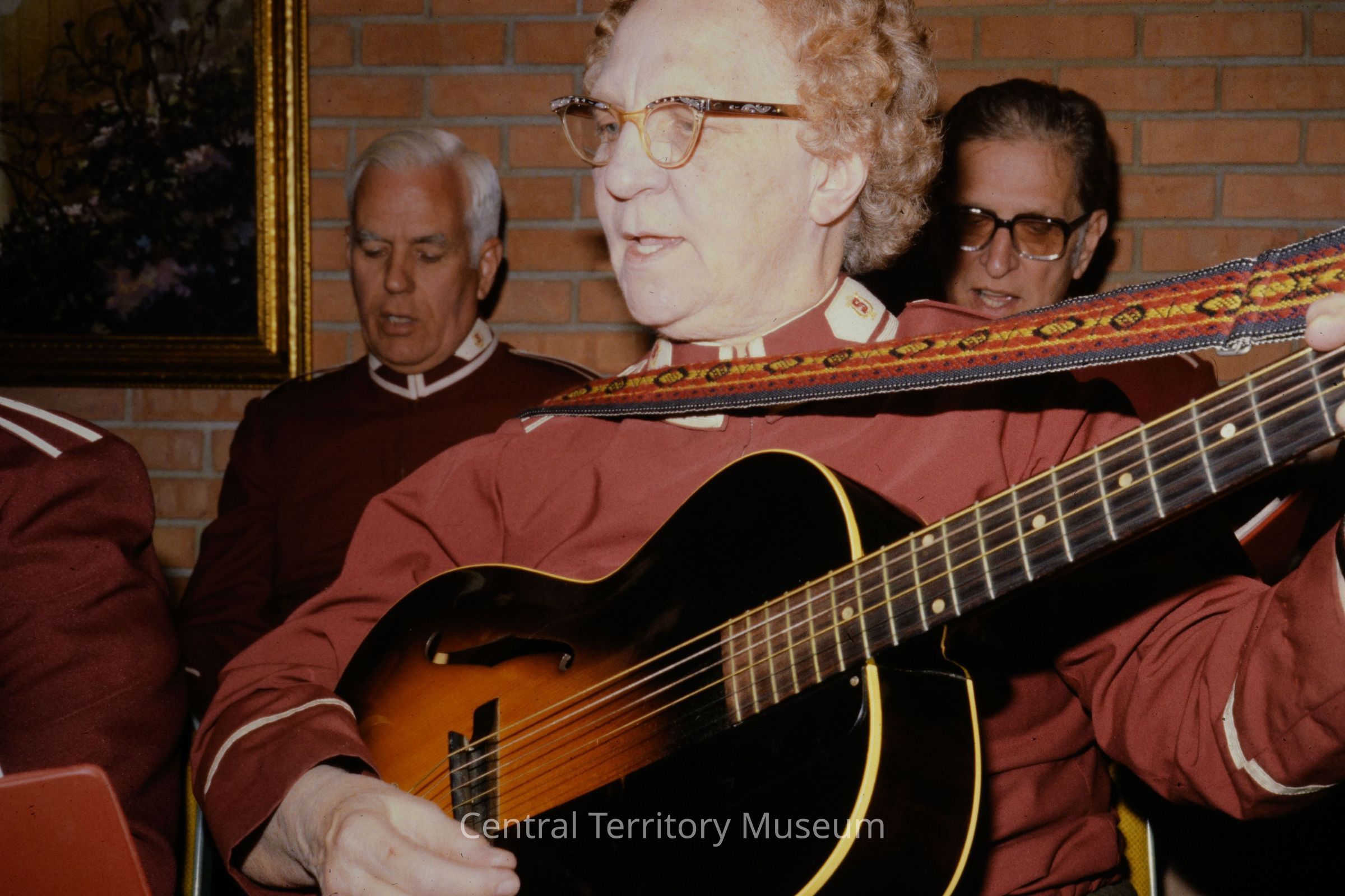 Violet Nelson (Carlson), a member of the Northern Illinois Division String Band, plays guitar. She is wearing a red Salvation Army uniform and appears to be singing as well as playing. Two men, presumably other members of the band, are standing behind her.