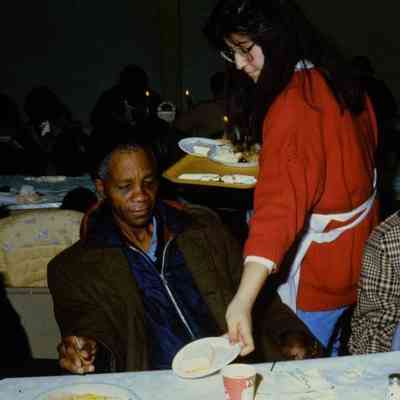 This is slide nine of the presentation, The Song of the Bell. The photograph shows a Caucasian woman wearing a red sweater, serving food to an African-American man. This is part of the food relief programs run by the Salvation Army.