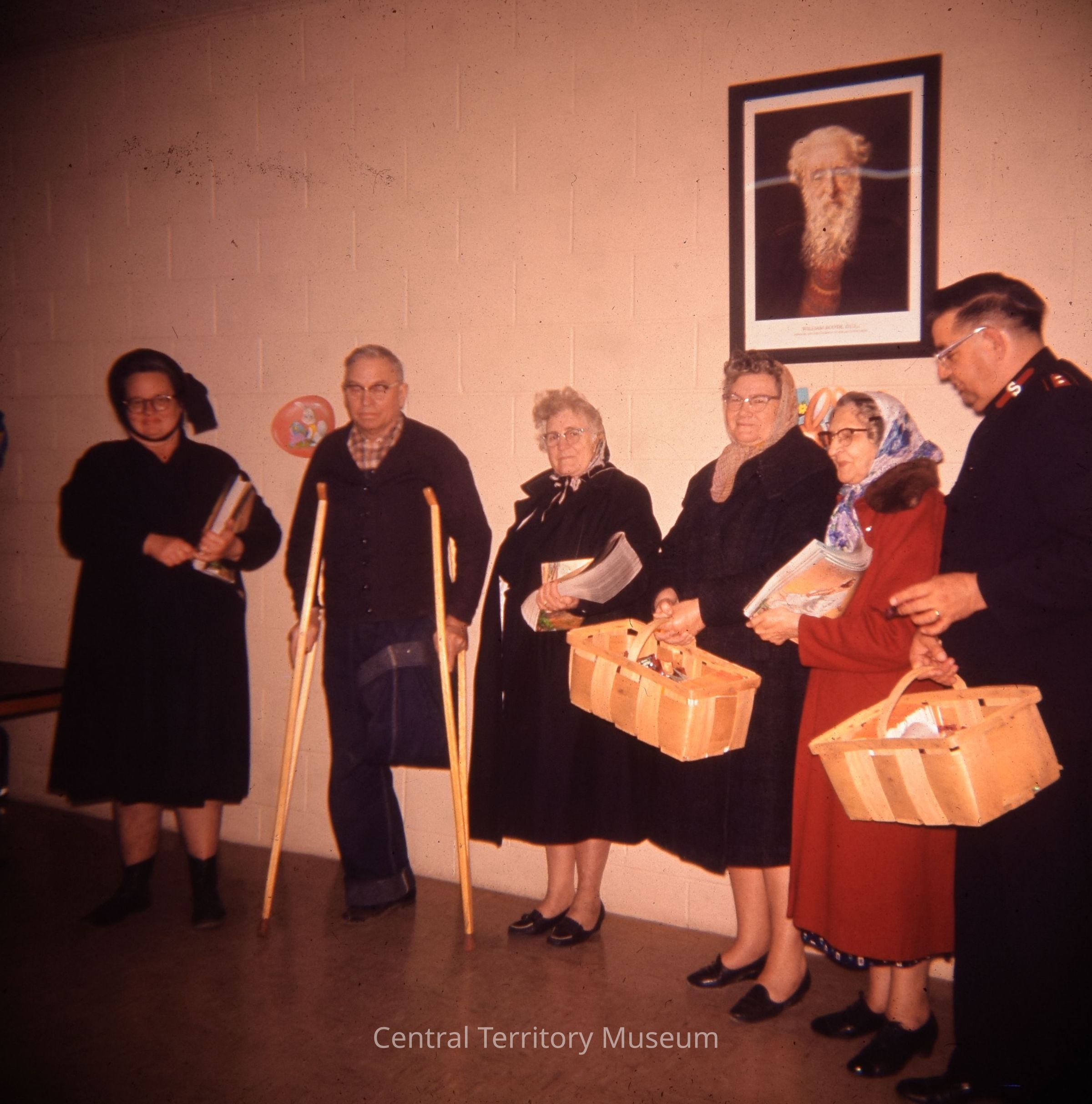 This is a photo of the League of Mercy visitation with Mrs. Greenleaf's Corps officers at Oskaloosa, IA Corp. There are four women and two men gathered under a framed picture of WIlliam Booth. The woman on the left and the man on the right are wearing Salvation Army uniforms. There is an older man on the left who is using crutches and has one leg. His denim pants are cuffed and the left pants leg (the missing limb) is folded upward from the knee towards the hip. The three older women in the middle of the group are carrying: a woman in a dark coat is carrying papers; the woman in the middle also in a dark coat is carrying a wood basket; and the woman in the red coat is carrying papers. The man on the end, in a Salvation Army uniform, is carrying a basket. The slide is marked "10A" in pen.