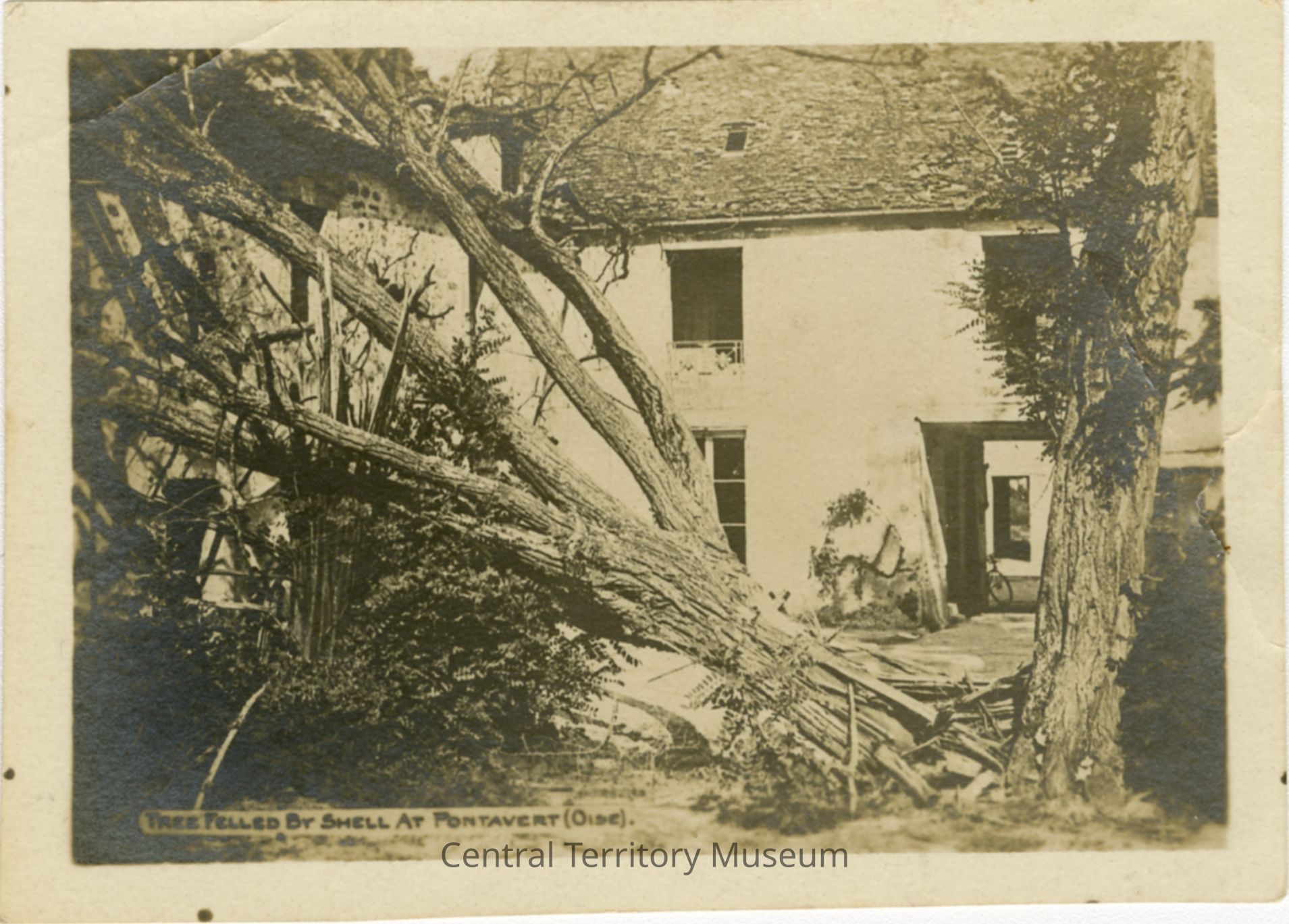 Black and white horizontal photograph with printed caption "TREE FELLED BY SHELL AT PONTAVERT (OISE)." Photograph shows part of a building (light/white with a dark roof). In front of the building is a large tree fallen off to the left (leaning diagonally into other trees and brush). The end of the tree's trunk is completely splintered. There is a still standing tree to the right of the felled tree's trunk.