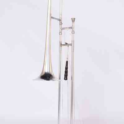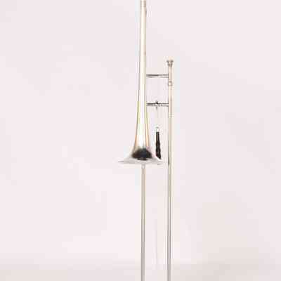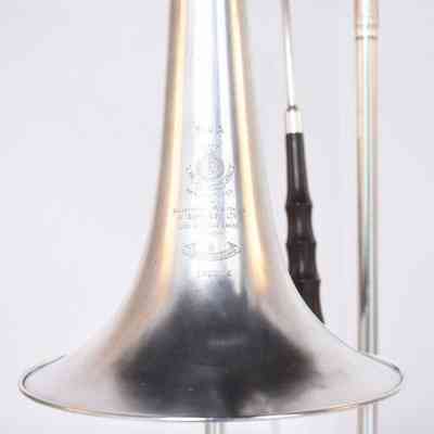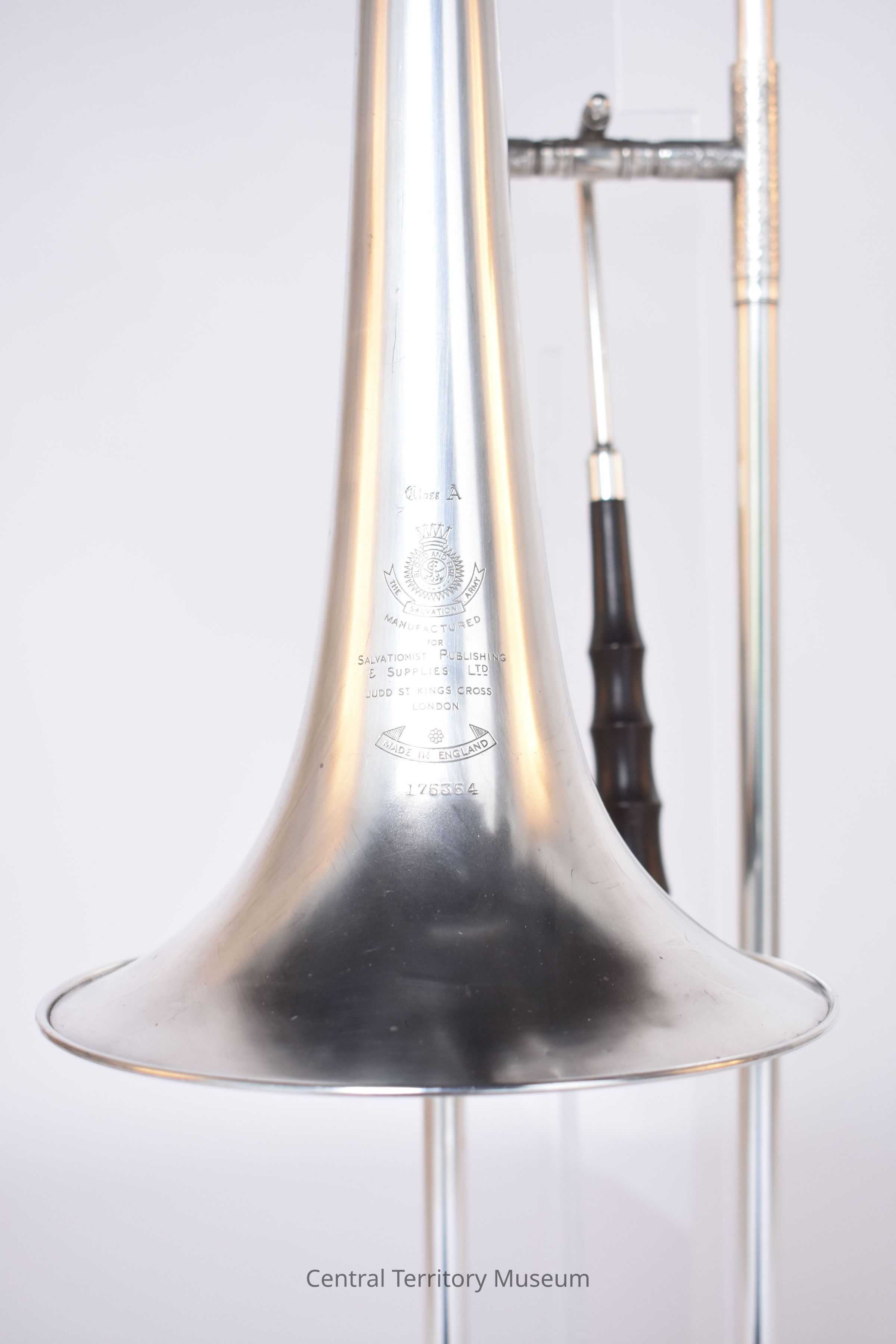 Trombone, with slide extender, silver plate, made by Boosey & Hawkes for Salvationist Publishing Supplies Ltd, serial number 175354. The trombone was manufactured for The Salvation Army by Boosey & Hawkes at their Edgware, London factory. The instrument was one produced in a batch of six by workman James between February 1 and July 13, 1950. The Salvation Army crest and manufacturing information is engraved on the side of the bell.
