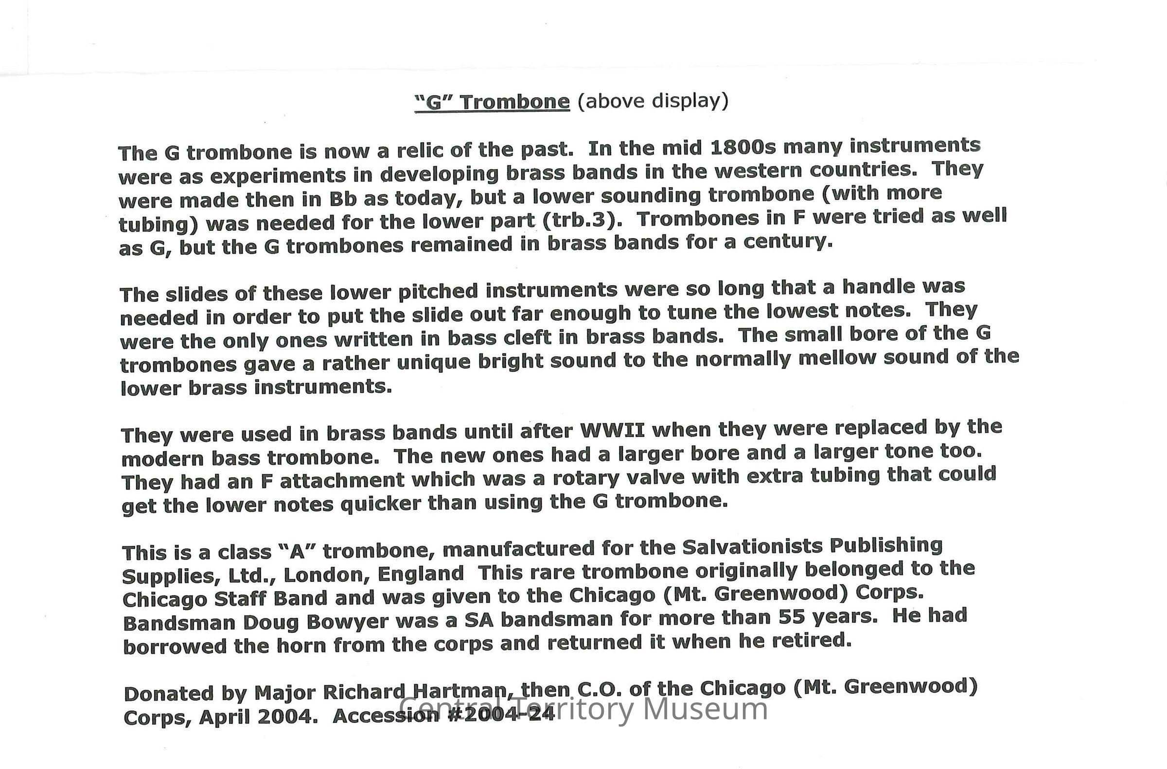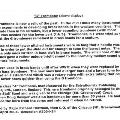 The trombone originally belonged to the Chicago Staff Band and was given to the Chicago (Mt. Greenwood) corps. It was played by Doug Bowyer, a 55 years + bandsman. He borrowed the trombone from the corps and returned it when he retired.