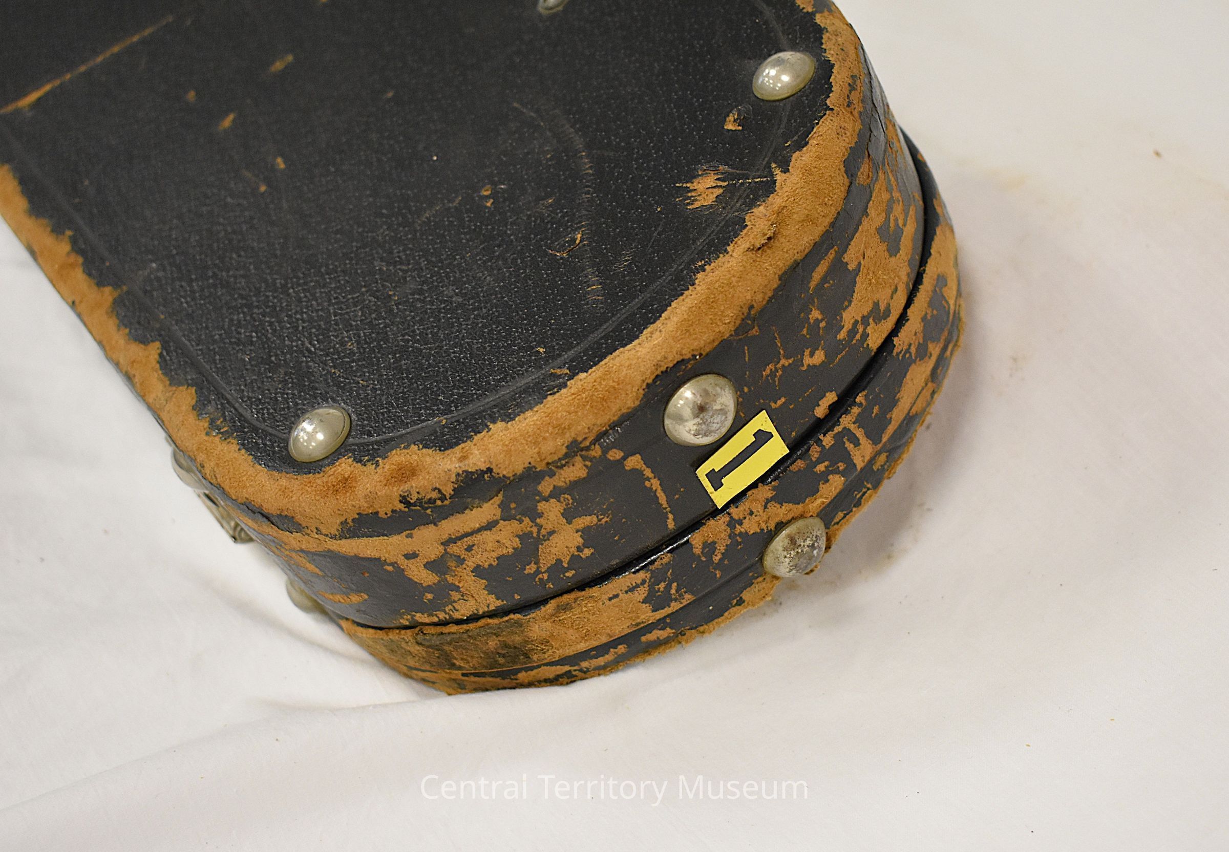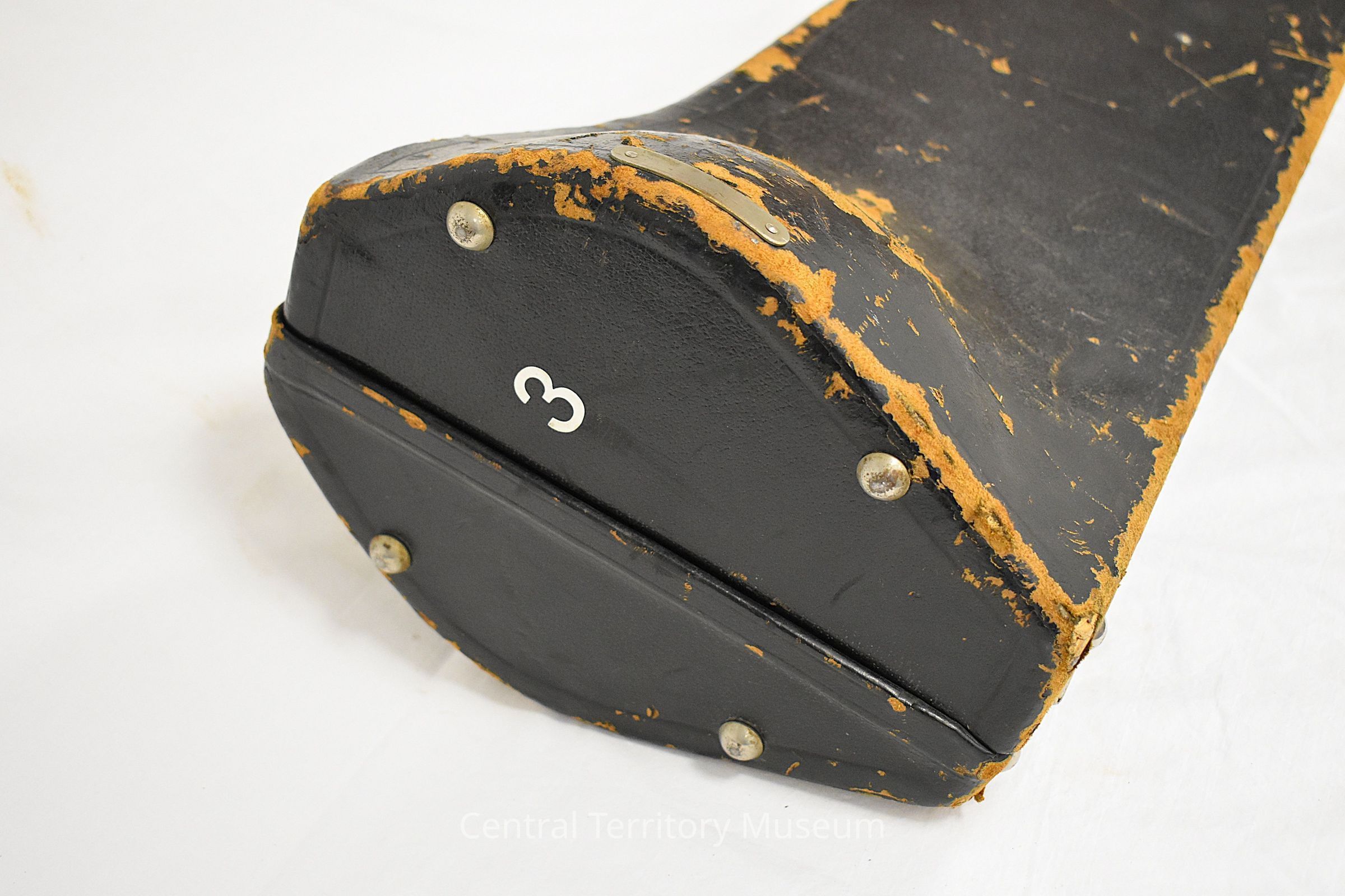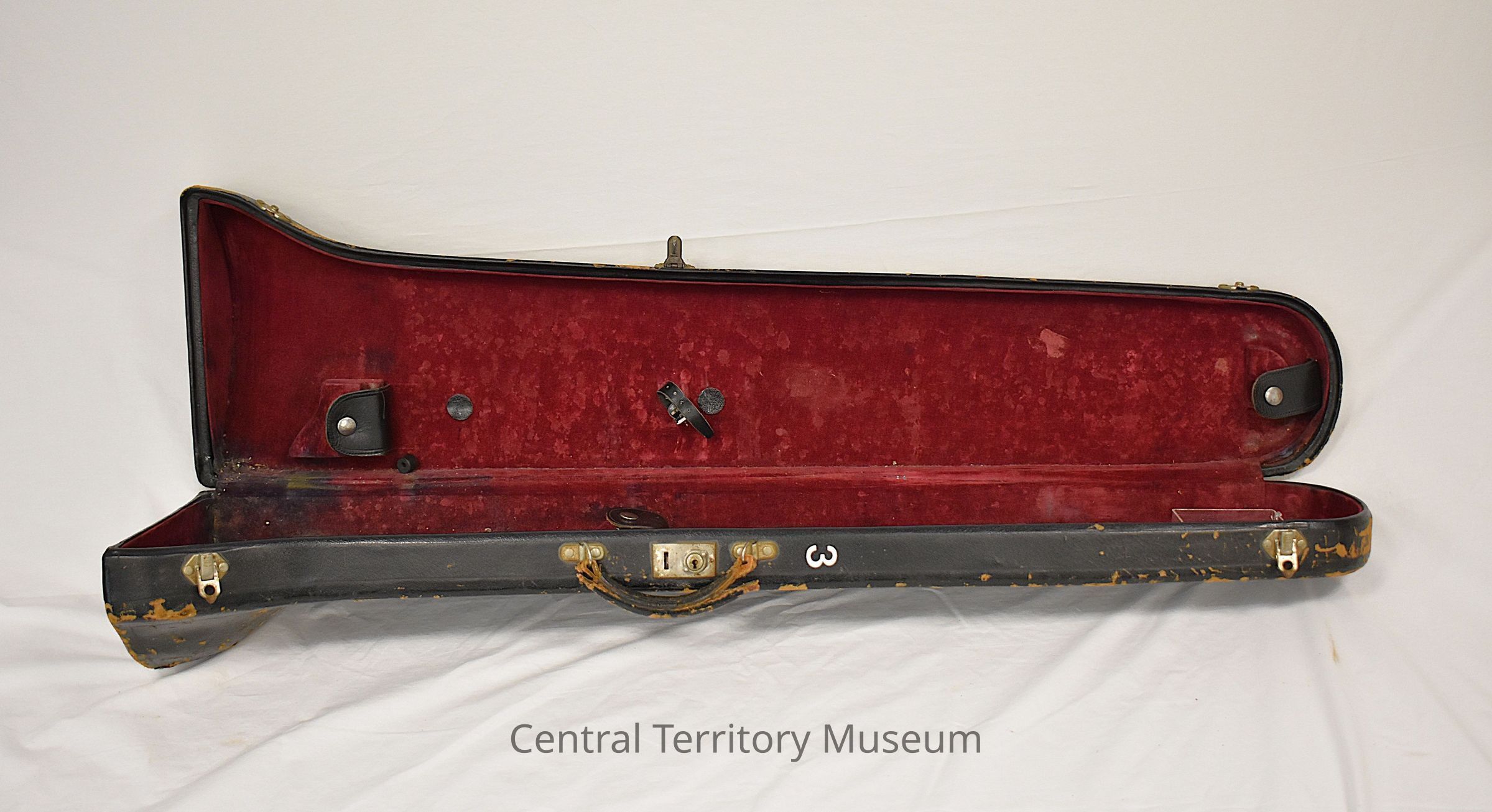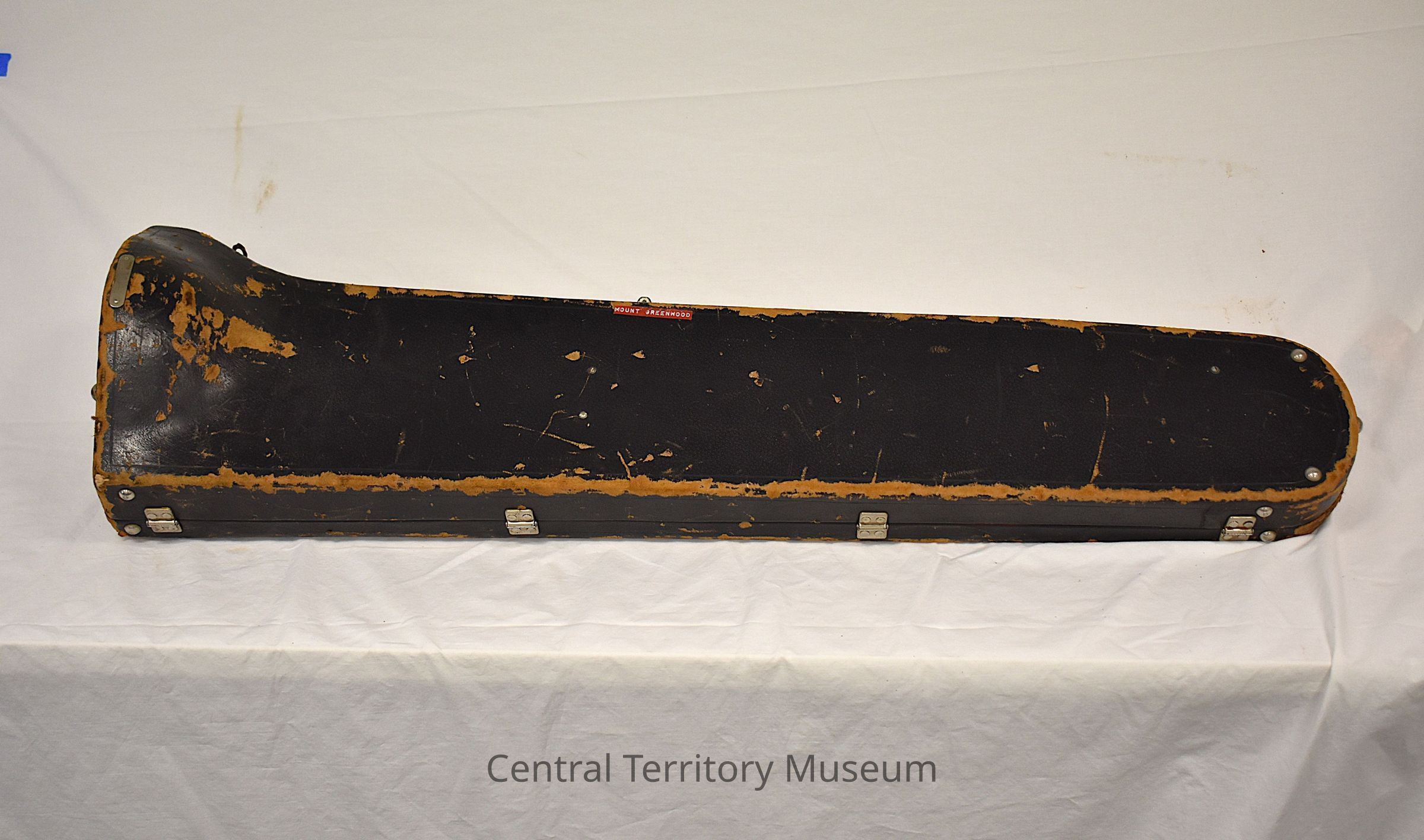Trombone Case. The case is associated with the trombone, 2004.25.1. It has a red plastic label with "Mount Greenwood" printed in white adhered near the handle, a yellow label with "1" in black at the top, and a white number "3" at the bottom and on the side. The interior of the case is lined with red fabric and has black straps for holding the instrument. There are also small pockets inside the case for accessories.
