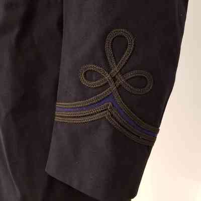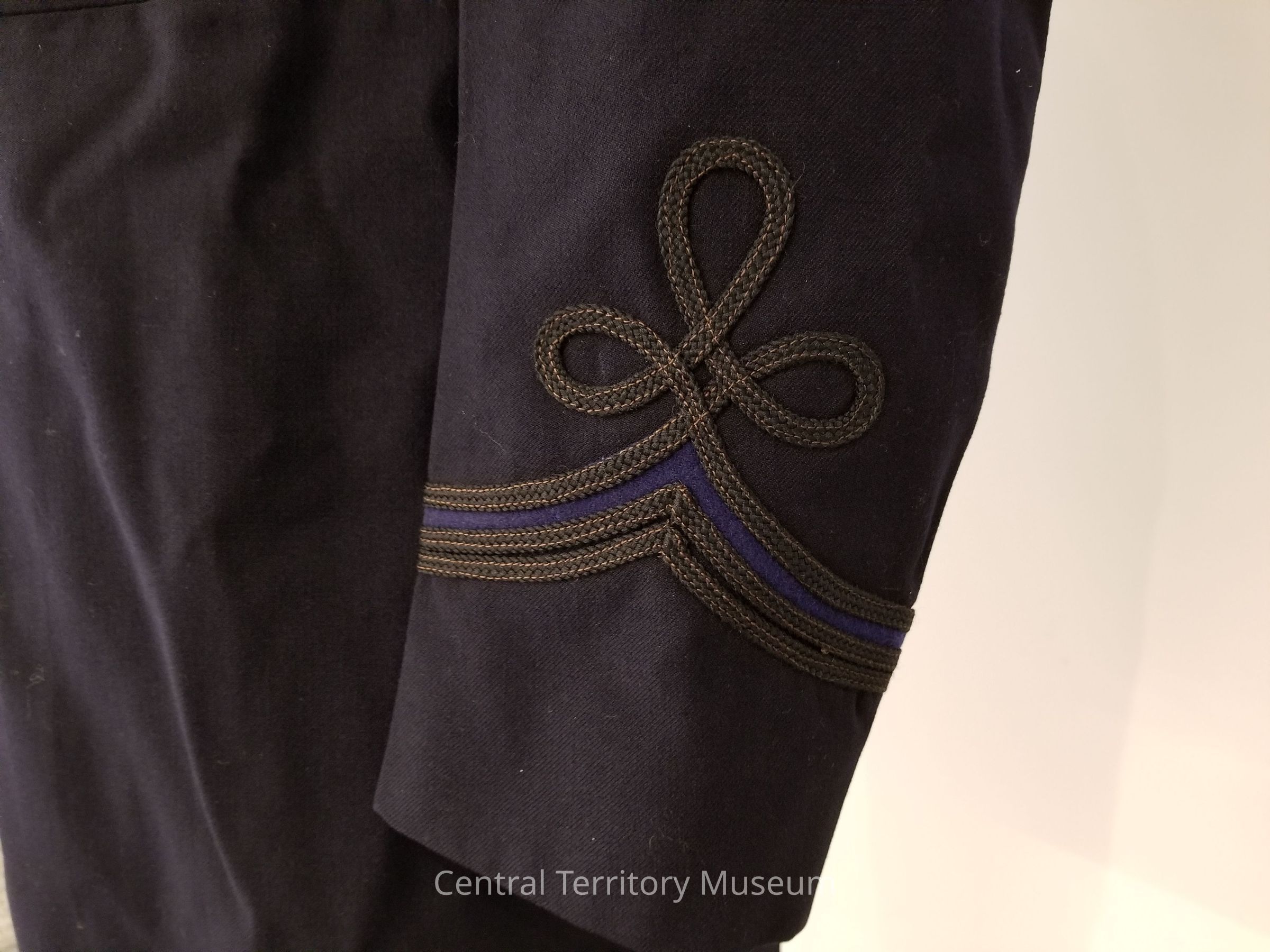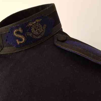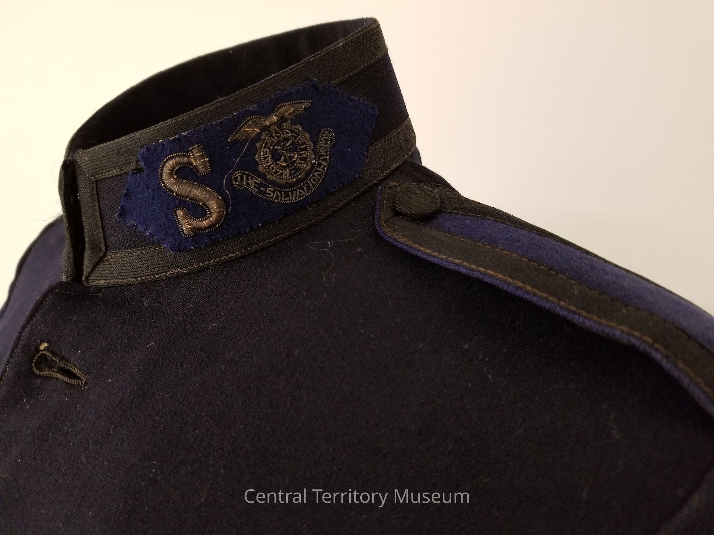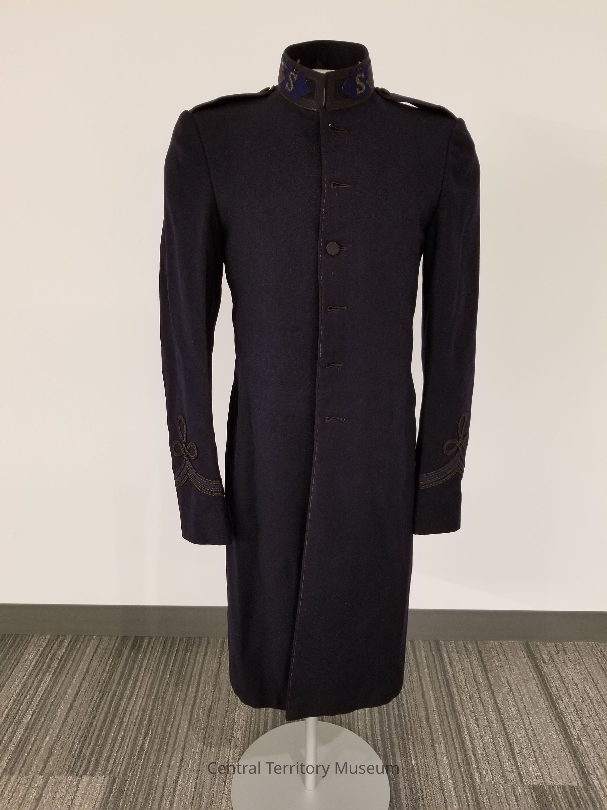 Man's Salvation Army uniform tunic (occupational uniform coat). Tunic is long with waist seam, cut in a frock coat style. Tunic body is made of navy blue wool with fabric covered buttons. Interior is lined with navy blue rayon or similar fabric. Closes at center front with five fabric covered buttons and two hook and eyes. Tunic has an attached stand up collar with black braid trim and Salvation Army insignia. Insignia are composed of a lozenge shaped blue wool felt patch on which the letter "S" and the Salvation Army USA eagle crest (in use 1880-1976) are stitched in metallic bullion tread. Insignia appear on each side of center front, centered horizontally on the collar. Shoulders feature blue epaulets with black braid trim fastened at top edge with fabric covered button. Sleeves have black braid with blue insert trim. Collar and sleeve trim indicate that the wearer is a Salvation Army officer (ordained minister) and had The Salvation Army rank of either staff-captain or major. Insignia patterns date from c. 1914-1948.