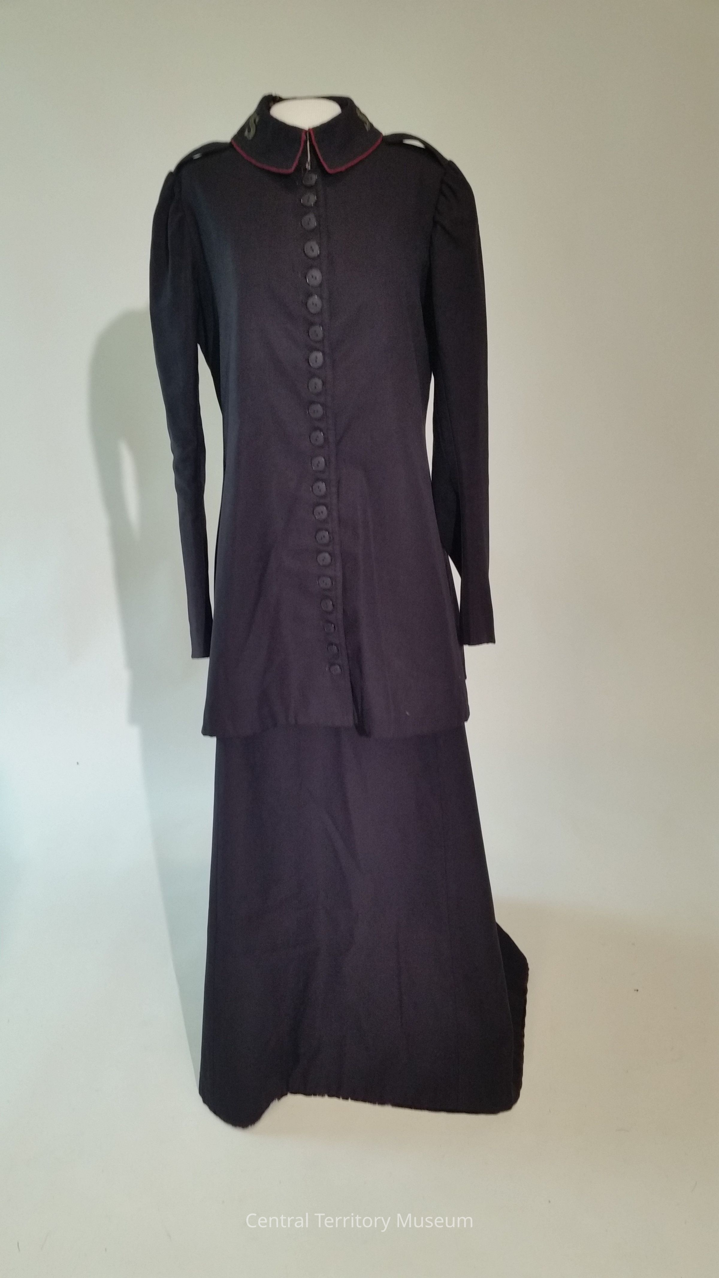 The uniform was purchased by the donors while traveling through Holland. Its style is consistent with uniforms worn by Salvation Army officers and soldiers in the United States, c. 1880-1920. Based upon the cut of the sleeves and shoulders, this uniform likely dates to the 1890s.