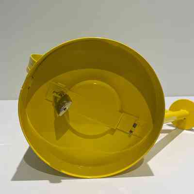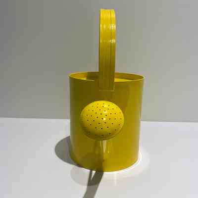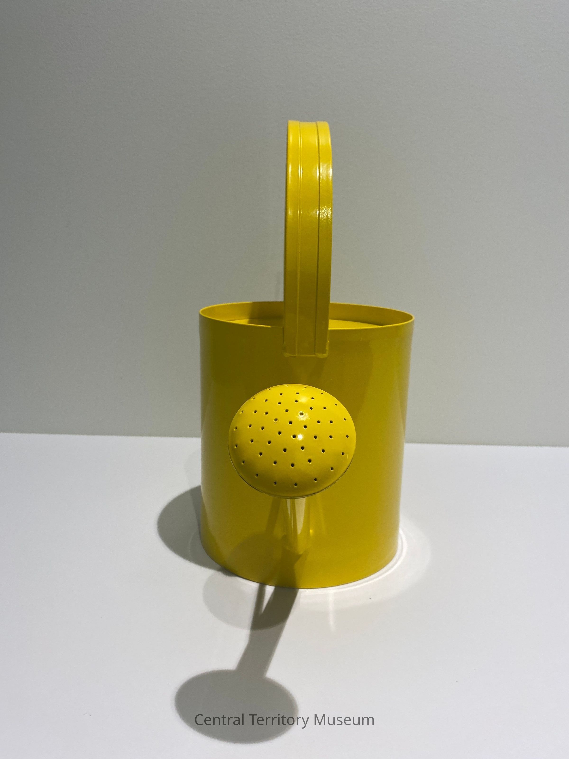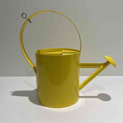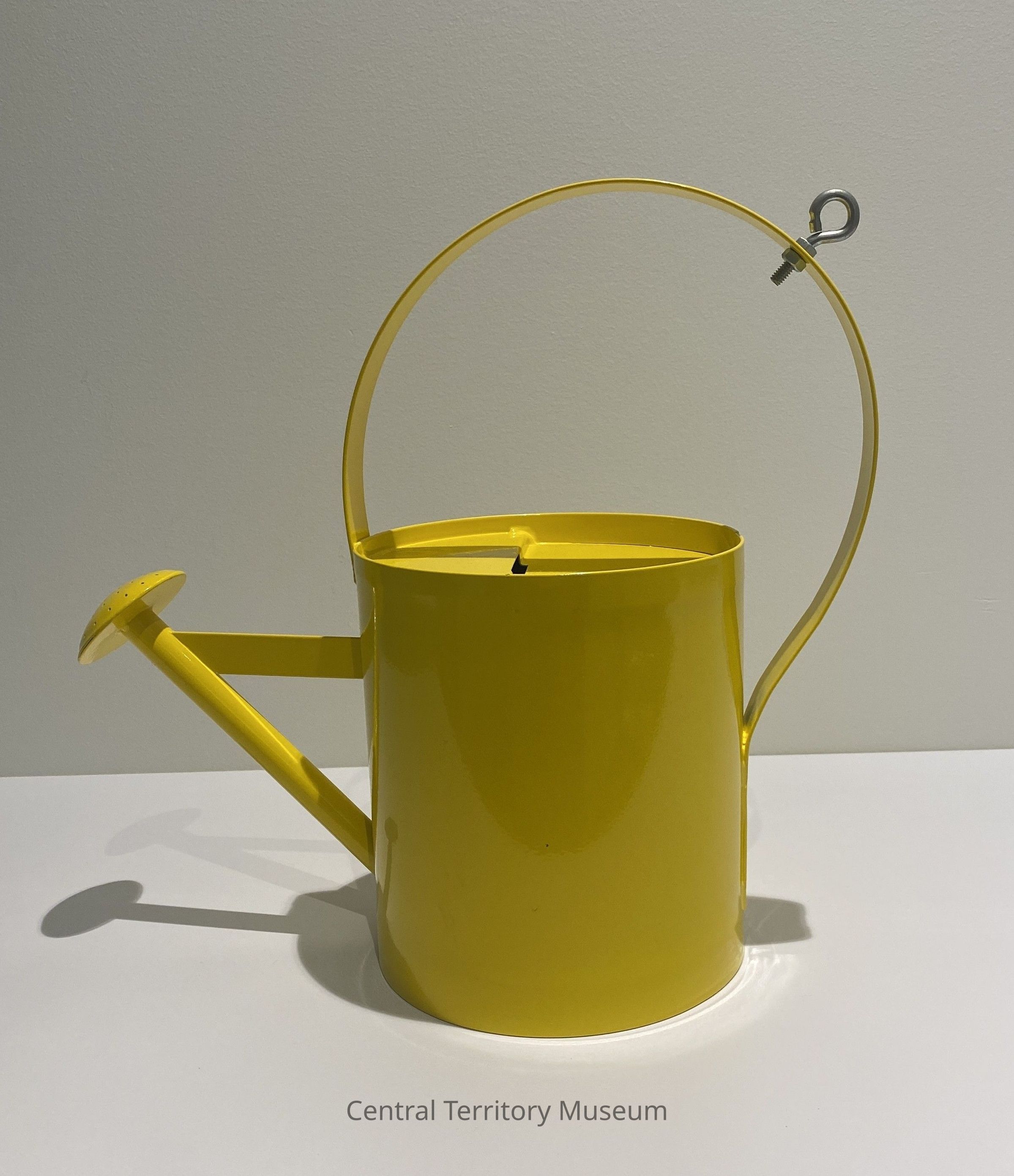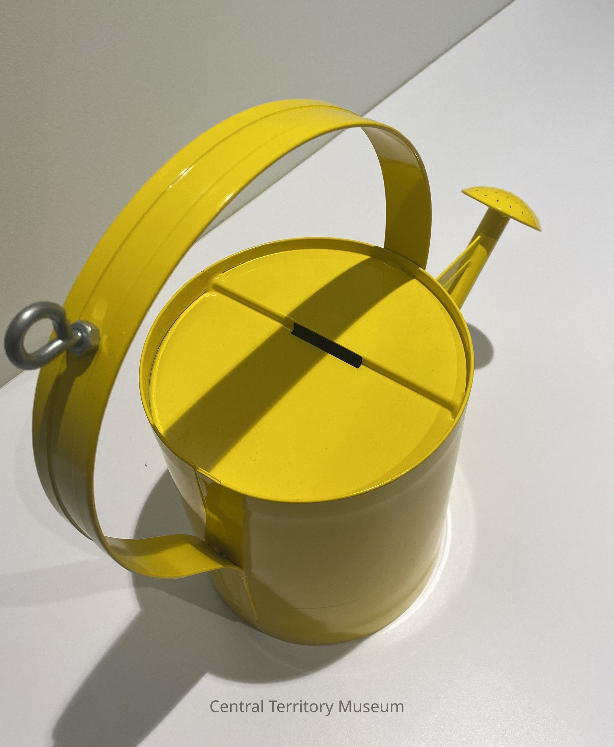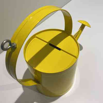 Yellow metal watering can, modified to act as a fundraising receptacle. The can has a sealed metal lid with a slot for donors to put in money. The bottom of the can has a hinged cover and a brass padlock without a key. An eyebolt is attached to the handle.