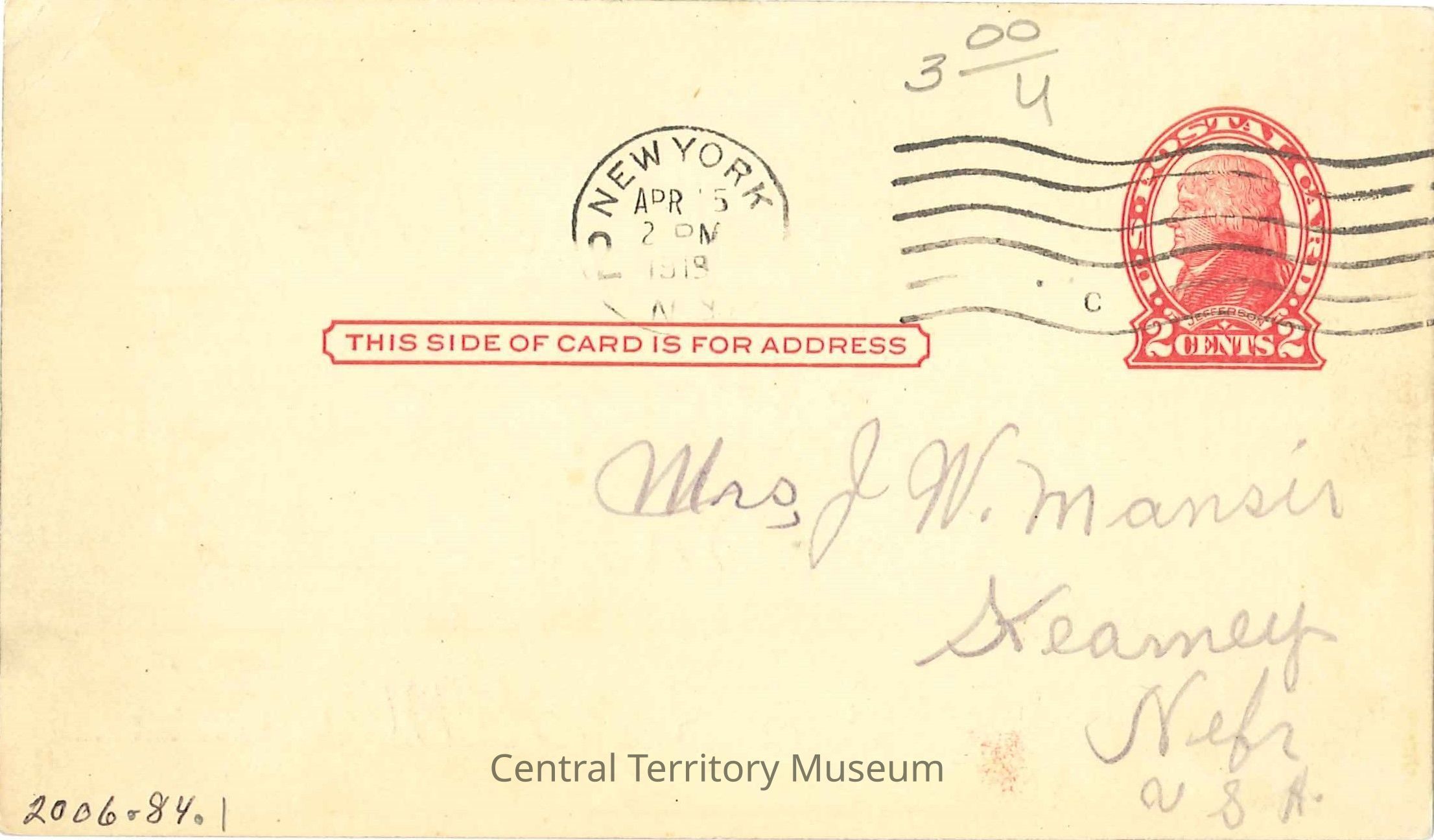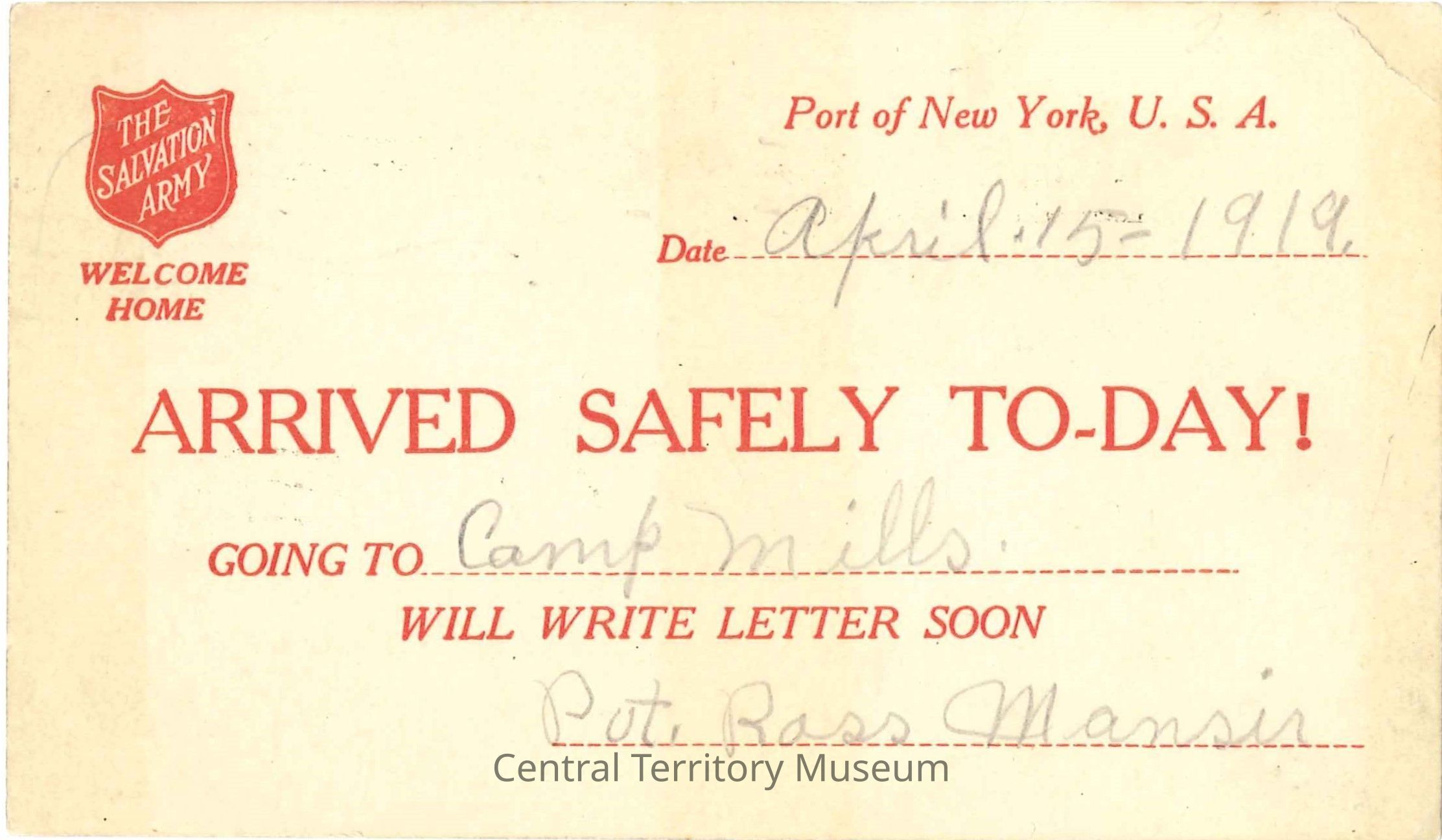 Postcard. The card is two sided, white cardstock, published by The Salvation Army. The first side is reserved for the address and has a red printed US postage worth 2¢ with an illustration of Thomas Jefferson. The other side has printed information with dotted lines for the sender to fill in. A Salvation Army Red Shield logo is in the upper left corner and to the right is text "Port of New York, U.S.A. with "Date" and a dotted line to fill in the date. Below that, in a large font, is "ARRIVED SAFELY TO-DAY!", under that in a smaller font "Going to" followed by a dotted line; then under that is "Will Write Letter Soon" and then another dotted line. This postcard is dated April 15, 1919, with the sender going to Camp Mills, and signed by Rvt. Ross Mansir. The postcard is addressed to Mrs. J.W. Mansir, Kearney, Nebr, U.S.A.