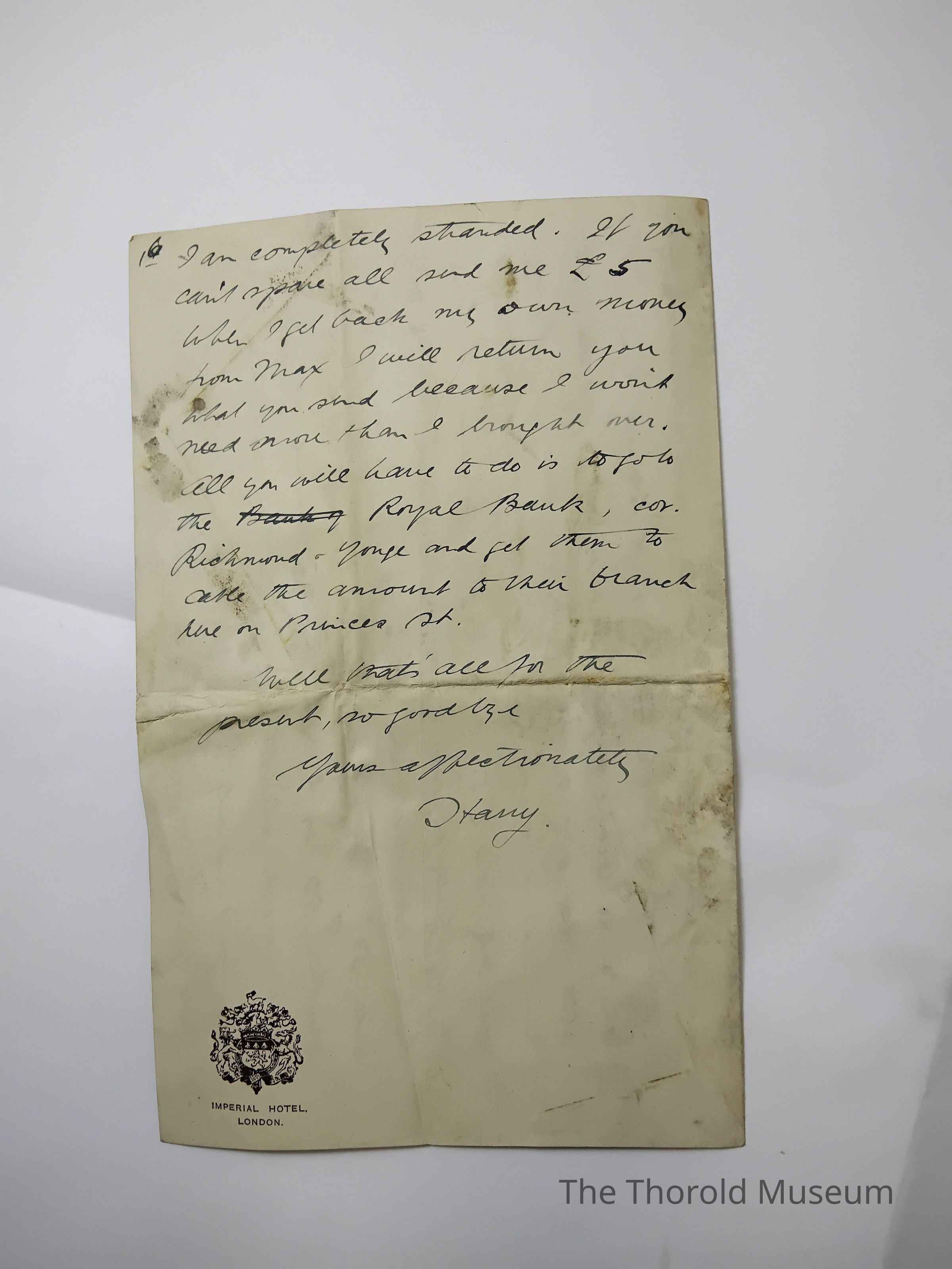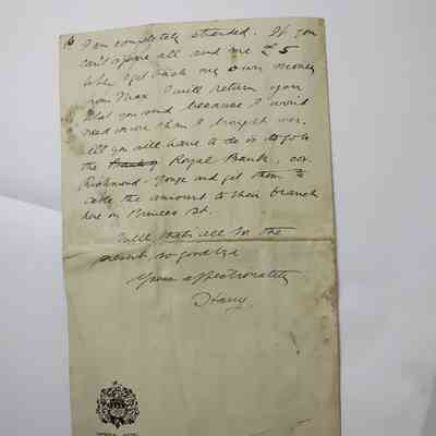 When I get back my own money from Max I will return you what you send because I wont need more then I brought over. All yu will have to do is to go to the Royal Bank, [???], Richmond [?????] And get them to [????] The amount to their branch here on Princes St.
