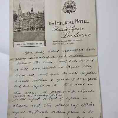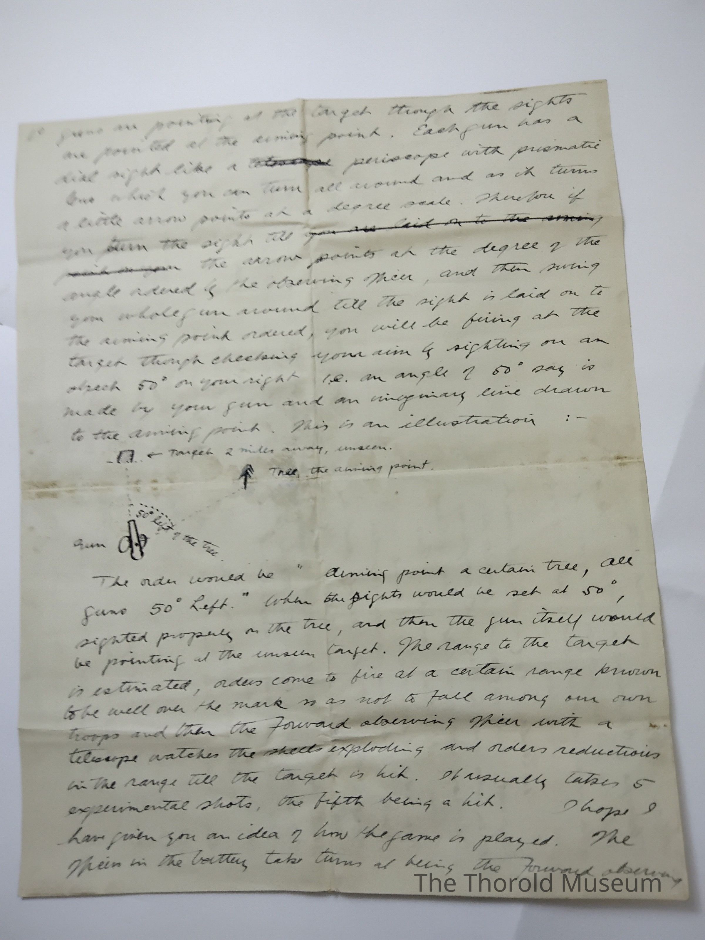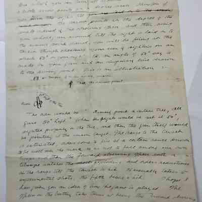 The order Would be "[??????] Point a certain tree, all guns 50degrees left" When the light would be et at 50degrees, lighted purposely on the tree, and then the gun [?????] Would be pointing at the [??????] target. The range to the target is estimated, [????] Come to fire at a certain range known to the well over the mark so as not to face among our own troops and then the forward [?????????] [?????] With a telescope watchers the shells exploding and orders reductions in the range until the target is hit, it usually takes 5 experimental shots, the fifth being a hit. I hope I have given you an idea of how the game I played. The [?????] In the [???????] Take turns being the forward [?????]ing [????] Who is in a dug-out with a telescope, telephone + [??????], he is safe under his position in di[?????????] When he is fired at and that's two only time his [???] In [?????????].