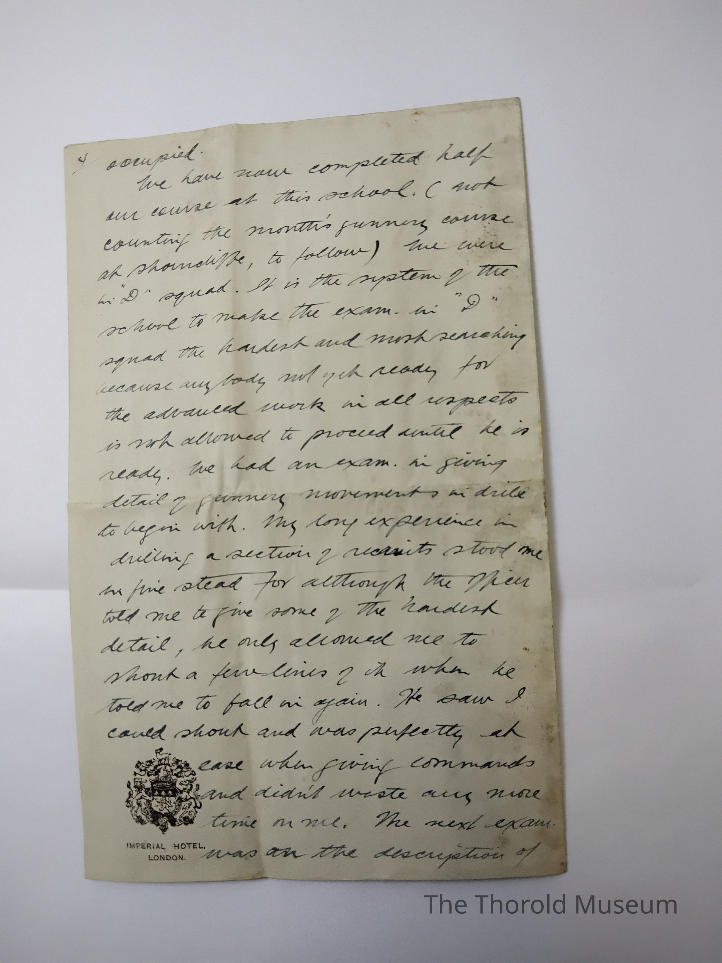 We have now completed half our course at this school, (not counting the [??????]'s gunners course at [????????????], to follow) we were in "D" squad. It is the [??????] Of the school to make the exam. In "D" squad the handout and [????] [??????]ing because our body not yet ready for the advanced work in all prospects is not allowed to proceed until he is ready. We had an exam, in [???????] Detail of gunners movement in d[????] To begin with. My [????] experience in [????????] a [?????????] Of [???????] Stood me [??] [????] To give some of the hand[???] detail, he only allowed me to [?????] A few [?????] Of it when he told me to [????] In again. He saw I could shout and was perfectly at ease when [?????] Commands and didn't waste [????] More time on me. The next exam was on the description of the 18 po[?????] Gun and the mechanism and [??????] Action (what each little [????] does) I knew I had all night [???????] [?????] "Half - a - crown" or 60 cents [??] An hall's extra [???????????] On the mechanism the night before, mainly to [??????] Me t get my hands on it to take it apart + not to much for our instructions.