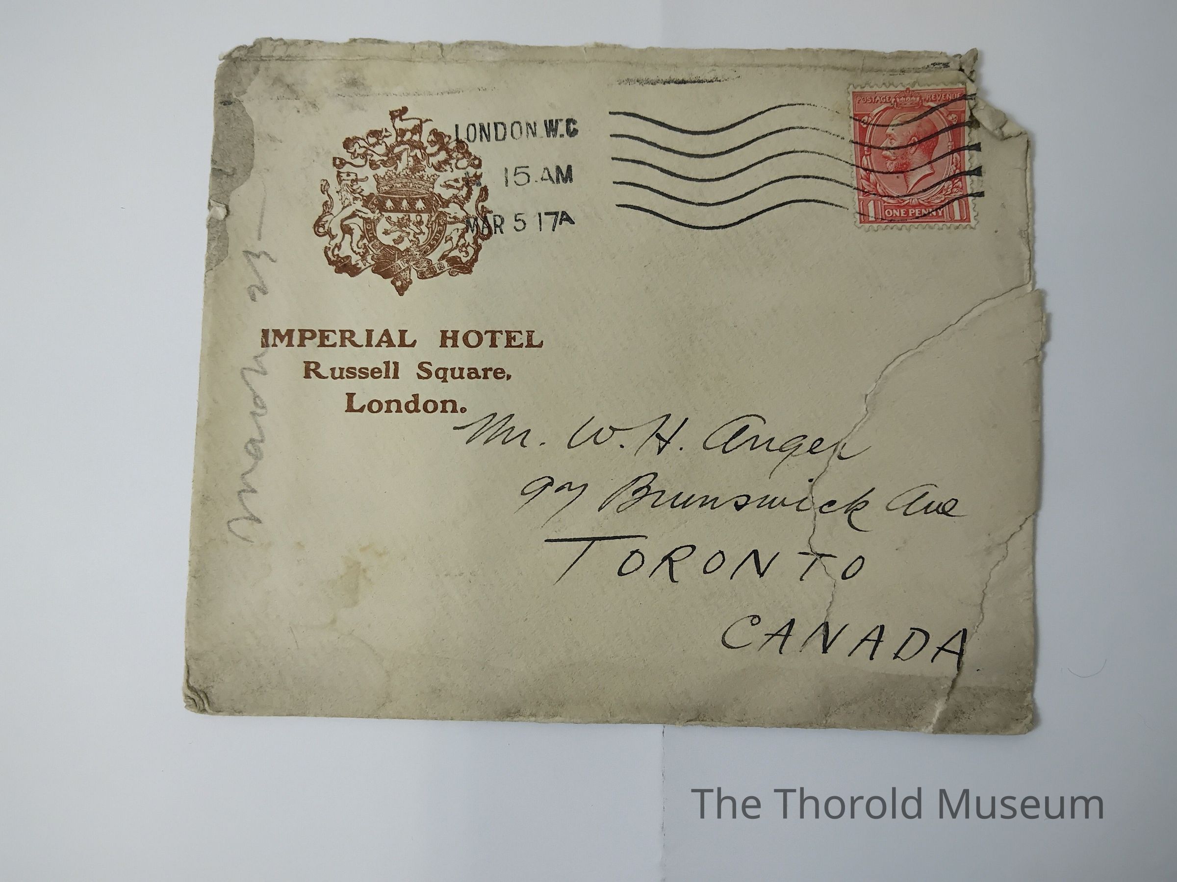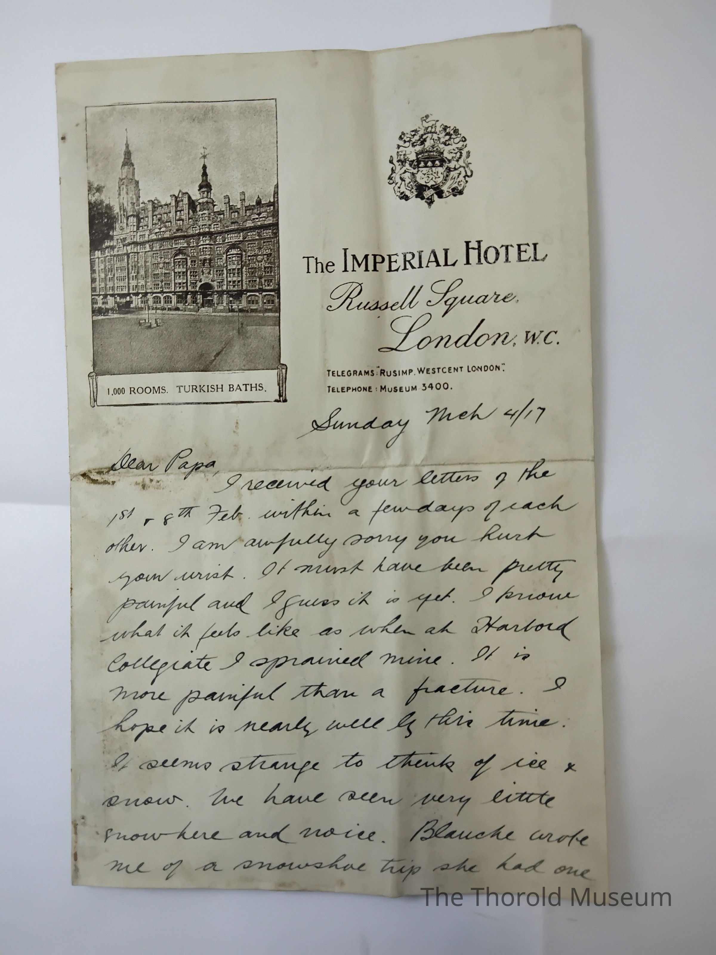 I received your letters of the 1st + 8th Feb, within a few days of each other. I am awfully sorry you hurt your wrist, it must have been pretty painful and I guess it is yet. I know what it feels like as when at Harvard collegiate I [?????????] Mine. It is more painful then a [????????]. I hope it in means well is this time. It seems strange to think of ice & snow. We have seen very little snow here and no ice. Blauche wrote me of a snow[????] trip she had one night and it made me [????????] For Canadian winter weather. Here it is damp + soggy all the time, and so damp that it reaches worst than Canadian snow weather.