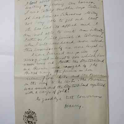 I have learned one piece of news of great [???????] To you which has never come out. Both the Deutcehland and Bremen were caught by the British, the former on her [??????] From U.S. the Bremen was sunk and the Deutcehland captured, with a [????] Of gold!