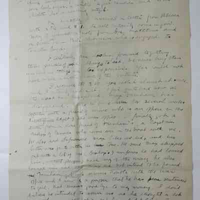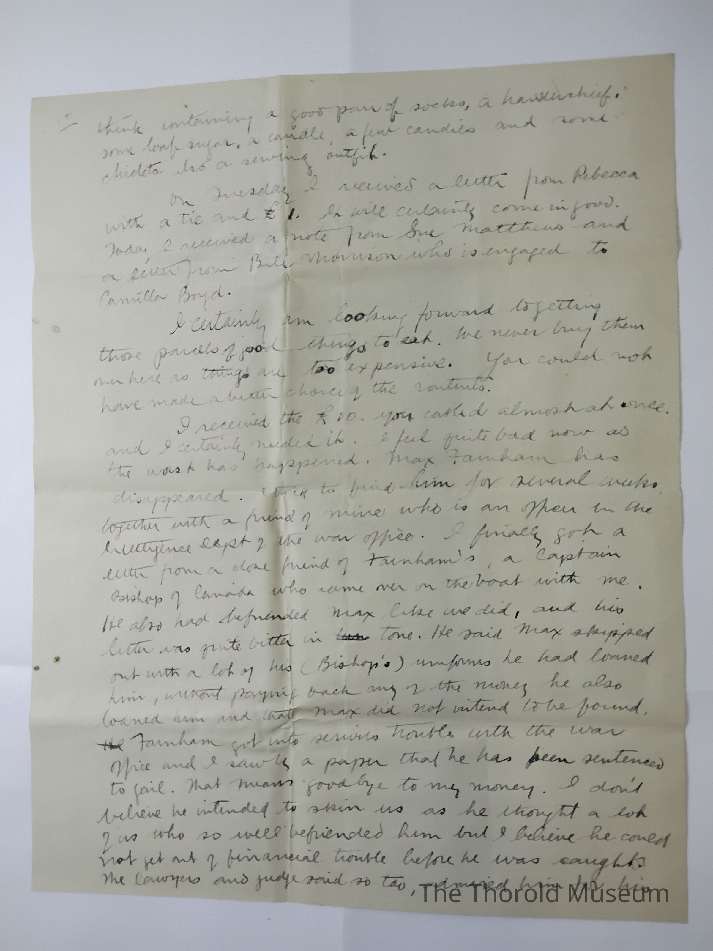 I recieved the 10 euros you [?????] Almost at once, and I certainly needed it. I feel quite bad now as the worst has happened, Max Farnham has disappeared. I tried to find him for several weeks together with a friend of mine who is an officer in the [???????????] Dept of the war office. I finally got a letter from a close friend of Farnham's, a captain Bishops of [???????] Who came over on the boat with me. He also had befriended Max like we did, and his letter was quite bitter in tone. He said Max shipped out with a lot of his (Bishop's) uniforms he had loaned him, without paying back any of the money he also loaned him and that Max did not intend to be found. Farnham got into serious trouble with the war [????] And I saw a paper that he has been sentenced to jail. That means goodbye to my money. I don't believe he intended to skim us as he thought a lot of us who [??] Well befriended him and I believe he could not get out of financial trouble before he was caught. the layers and judge said so too, admended him for his [??????] And for his good intentions to get back to the front as it seems when he learned he was being searched for he enlisted a a private in the new [?????????] And tried to get over to France. But the judge of course said he must pay the penaltys. I don't know whether it was the hotel or his tailor that prosecuted him after he skipped.