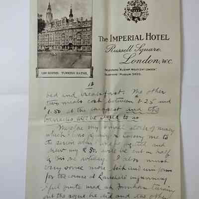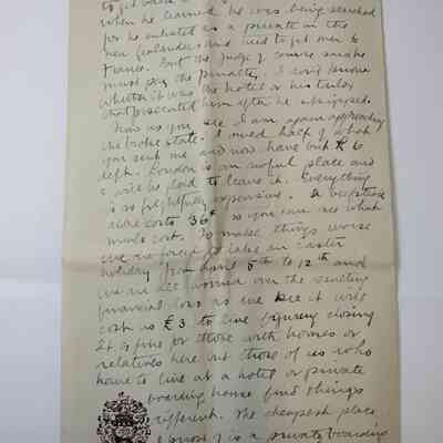 Now as you see I am again approaching the broke state. I owed half of what you sent me and now have but 6 euros left. London is a awful place and I will be glad to leave it. Everything is so [??????????] Expensive, a [????????] Alone costs 35 euros, as you can see what [?????] cost.to make things worse we are forced to take an Easter holiday from April 5th - 12th and we are all worried over the [?????????] financial cost, as we see it will cost 3 euros to live [????????] Closing it is fine for those with homes or relationships here, but those of us who happen to live at a hotel or private boarding house finds things different. The cheapest place I know of is a private boarding house where it costs $1.12 for bed and breakfast. The other two meals cost between $1.25 and $1.50 at the ceapest and the barracks will be closed to us.