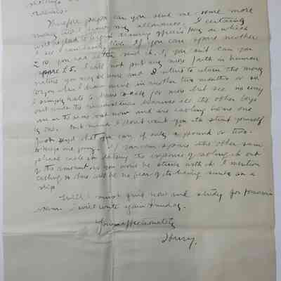 Therefore papa can you send me some more money till I draw my allowance, I certainly will be glad to begin drawing [?????] Pay on which I see I can easily live. If you can spare another 10 euros, you had better send it. If you cant can you send spare 5 euros. I will not put any more faith in human nature you may be sure and I intend to return the money [????] When I draw mine in another two months or so. I simply hate to have to ask for more but see no way out under the circumstances because all the other boys are in the same boat now and are [???????] Home one by one. But mind I dont want you to stunt yourself just send what you can if only a pound or two to keep me going. If you can spare the other sum please [?????] It, taking the expense of [??????] It out of the amount so you won't be stuck with it. I mention [??????] So there will be no fear of it being sunk on a ship.