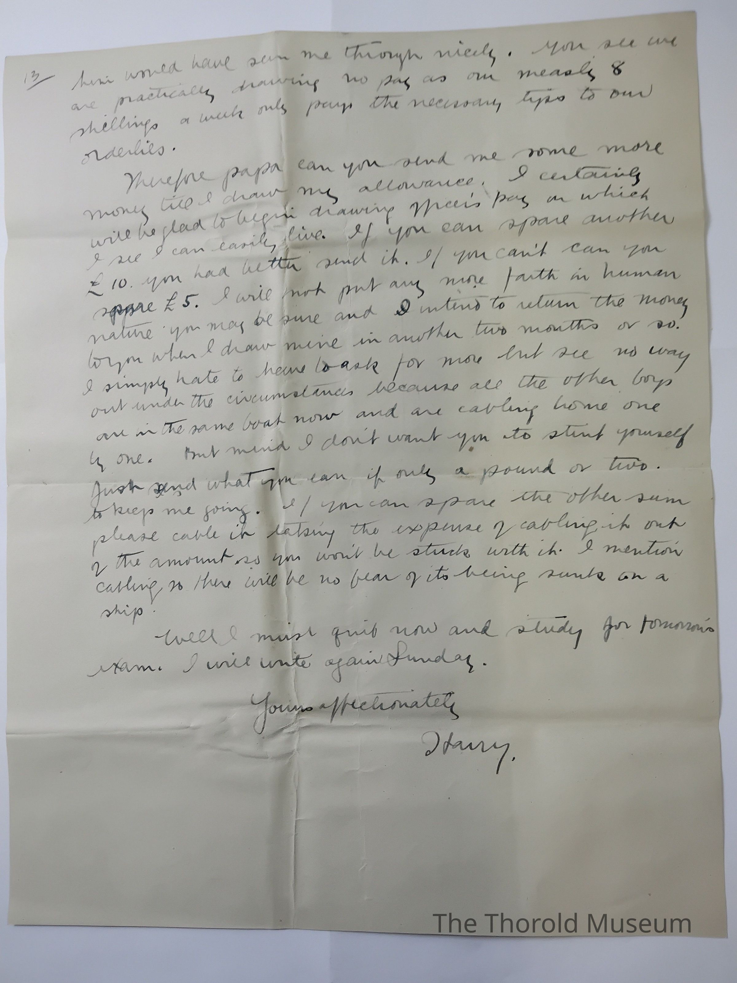 Therefore my small stock of money which I was [??]gunning on taking me to the per[????] When I wil be [??]setted and [????] My 50 euros will be cut in half by this one holiday. I also must [????] [?????] More [????] And [????????] For the cause at Lakehill in gunnery, I feel quite mad at Farnham turning out the [?????] He did and the other boys the same. The money I loaned him would have sent me though nicely. You see we are practically drowning [???] Pay as our mearly 8 shillings a week only pays the necessary trips to our [??????].