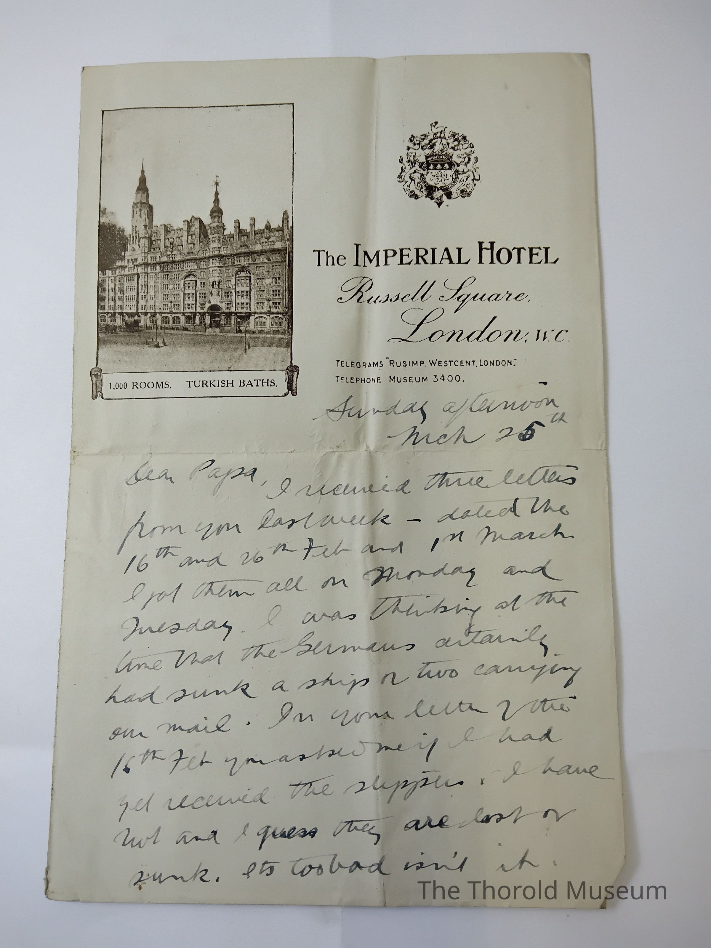 I received three letters from you last week - dated the 16th and 26th Feb and 1st March. I got them all on Monday and Tuesday. I was thinking of the time that the German artillery had sunk a ship or two carrying our mail. In your letter of the 16th Feb you asked me if I had yet received the slippers, I have not, and I guess they are lost or sunk. Its too bad isint it. I received one package of imperial [????????] Once I came over and it is not all gone yet. We don't get as much time to smoke as we want to in Canada, but quite sufficient time at that.