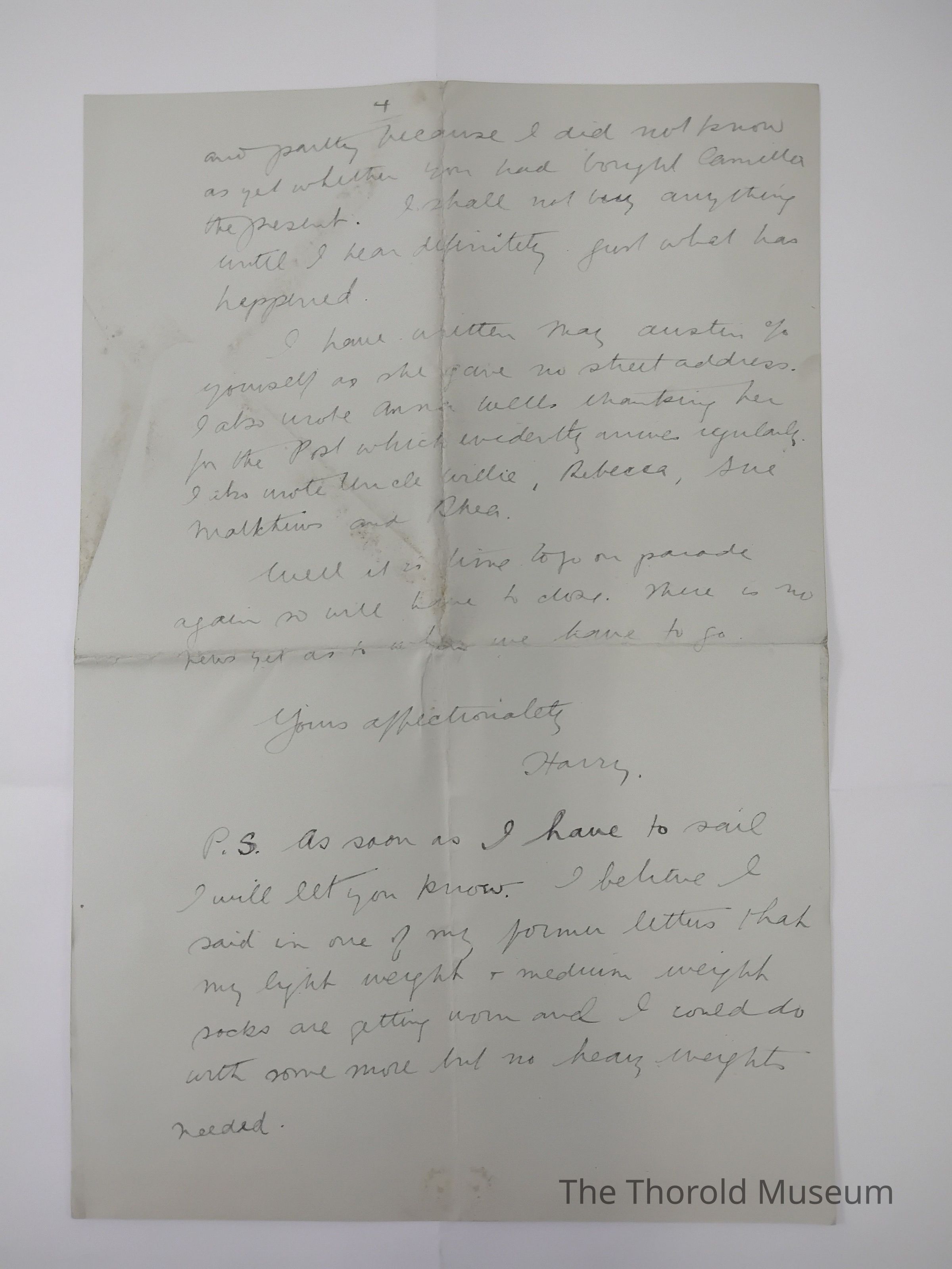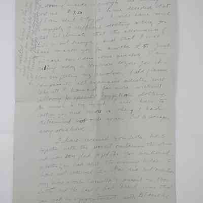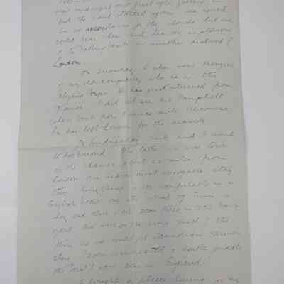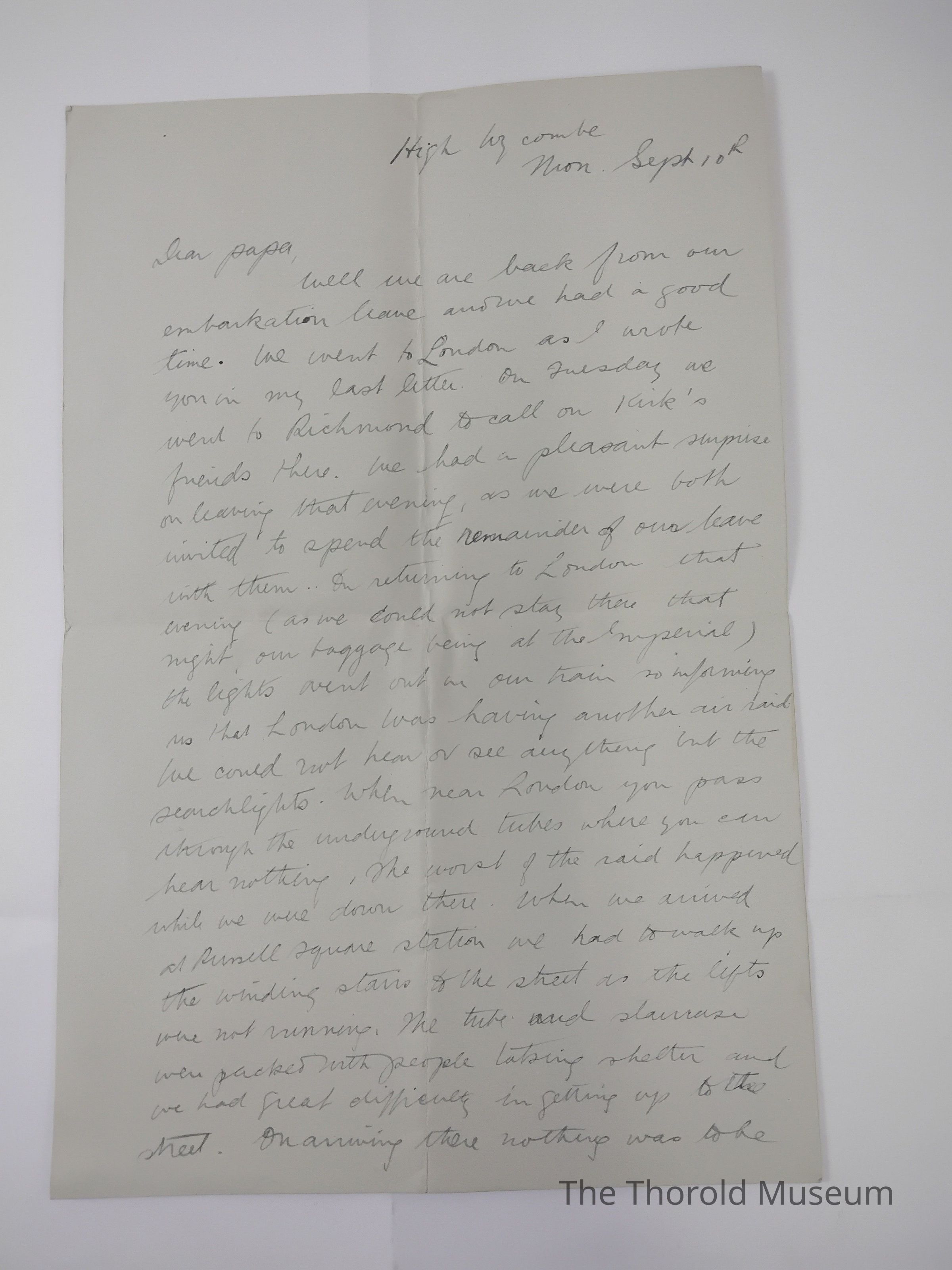 Well we are back from our embarkation leave and we had a good time. We went to London as I wrote you in my last letter. On Tuesday we went to Richmond to call on Kirk's friends there. We had a pleasant surprise on leaving that evening, as we were both invited to spend the remainder of our leave with them. On returning to London that evening (as we could not stay there that night, our baggage being at the Imperial) the lights went(?) out [?] our train so informing us that London was having another air raid. We could not hear or see anything but the searchlights. When near(?) London you pass through the underground tubes where you can hear nothing, the worst of the raid happened at Russell(?) Square station we had to walk up the winding stairs to the street as the lights were not running, the tube and [?] were hacked with people [??] and we had great [?] in getting up to the street. On arriving there nothing was [?] seen or heard. We want to bed as it was midnight and just after getting in bed the raid started again. We could see(?) no aeroplanes [?] the clouds but we could hear them and hear the explosions of the falling bombs in another district of London.