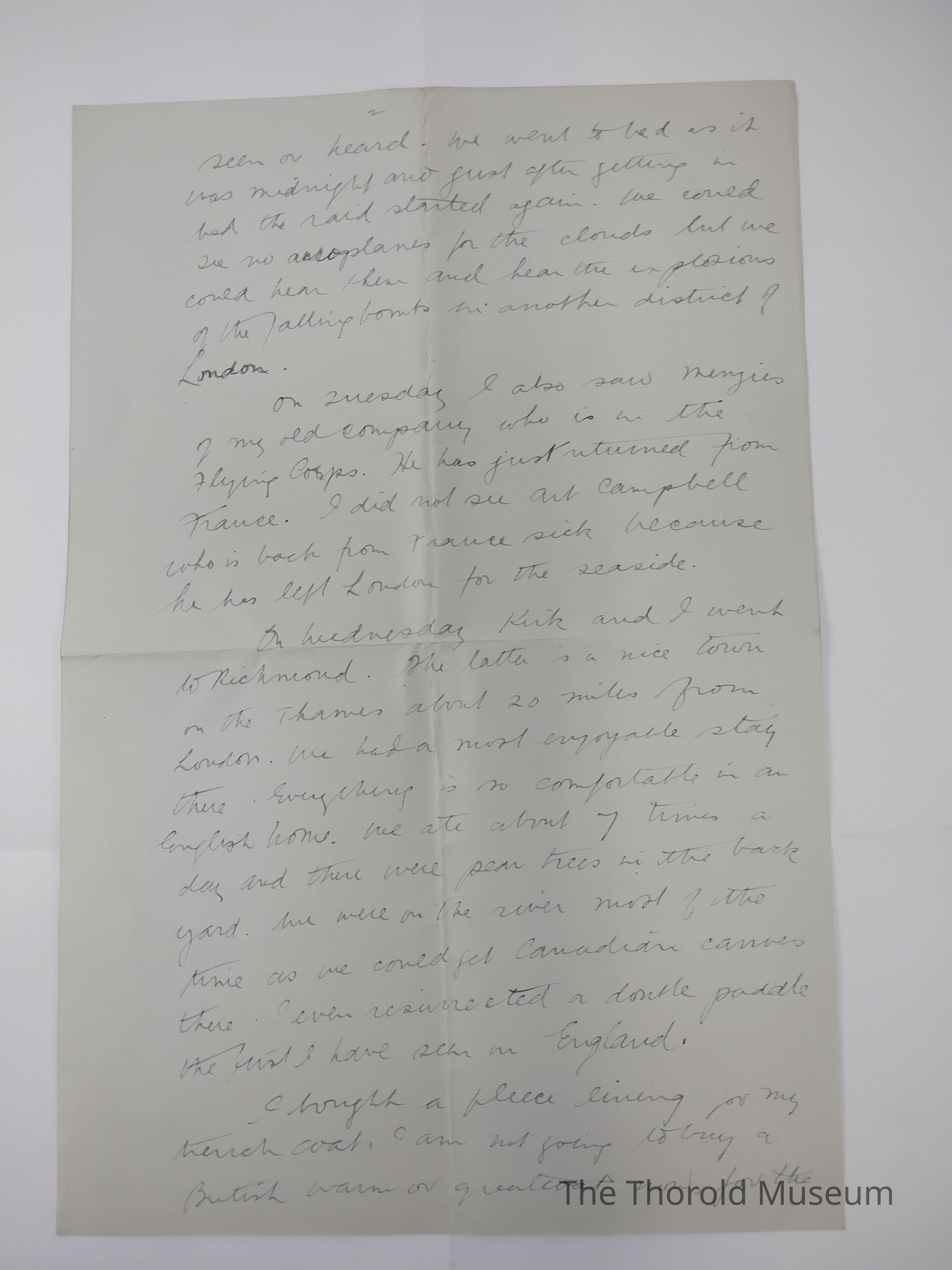 On Tuesday I also saw [?] of my old Company who is in the Flying Corps. He has just returned from France. I did not see Art(?) Campbell who is back from France sick because he has left London for the seaside.