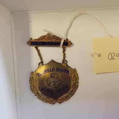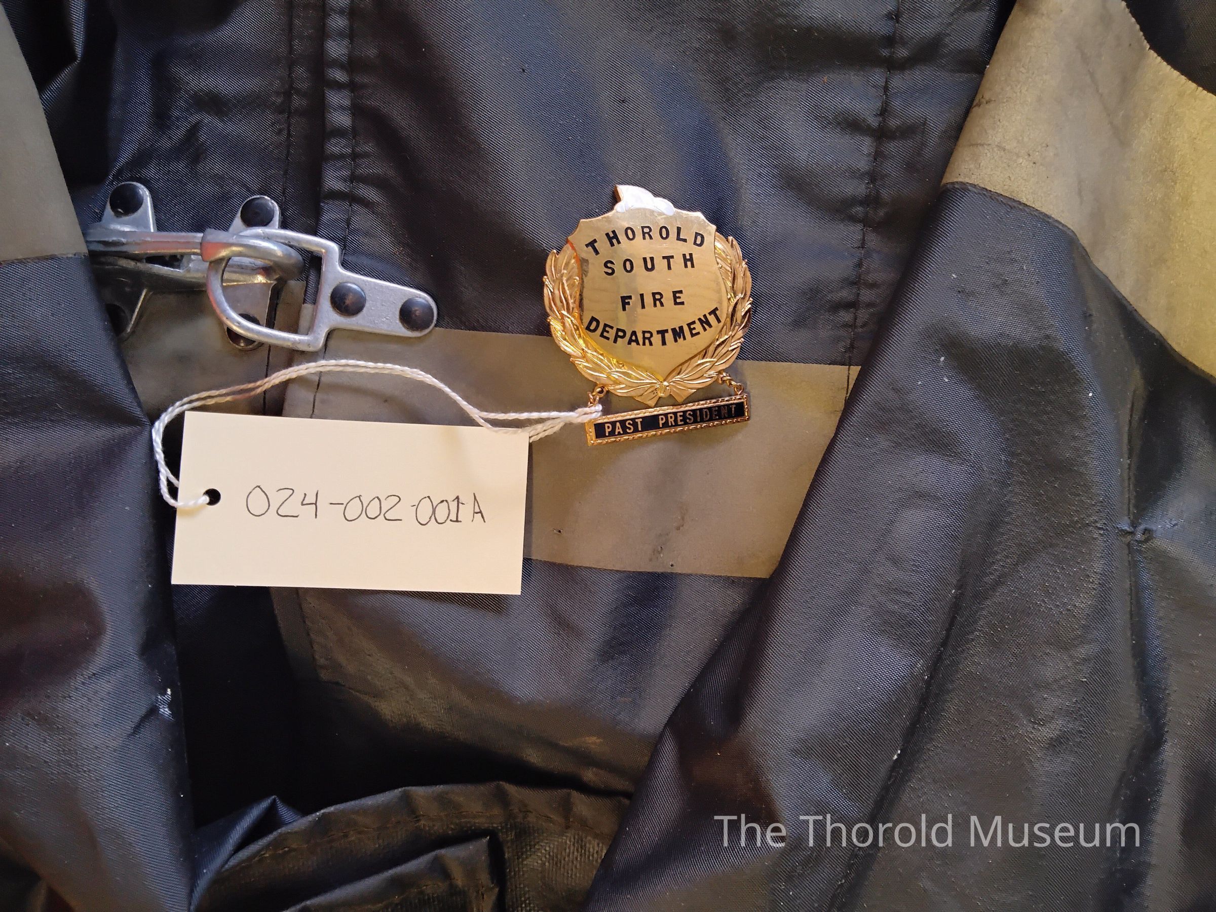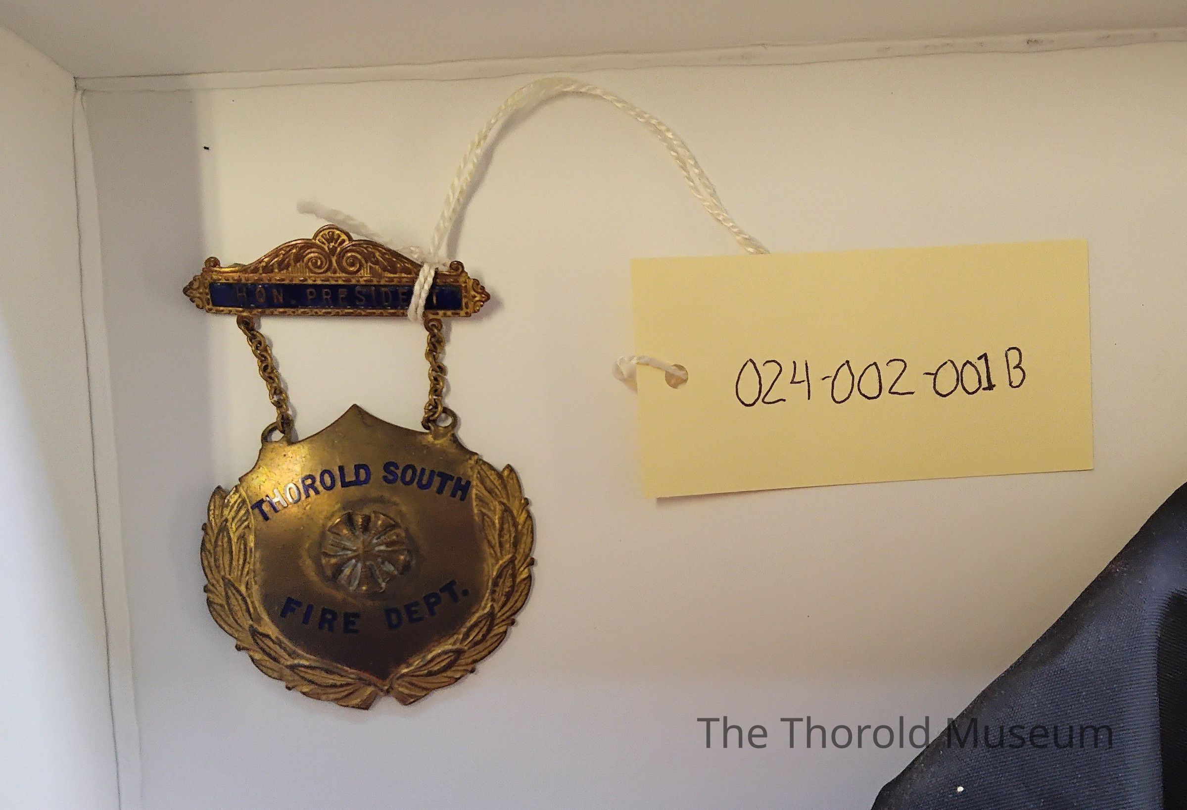 B) A pin saying "Thorold South Fire Department - Honorary President"Cataloged By