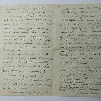 I will write again so the letter will be posted as soon as we land in Liverpool. We are(?) calling c[?] [????????] telephone our homes. So [???] please telephone Bla[?]he.