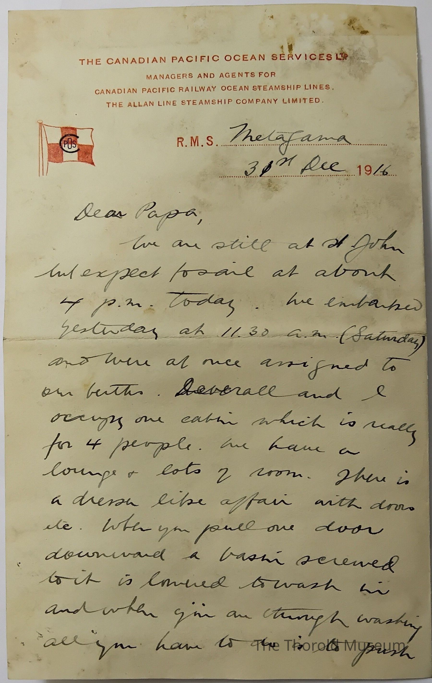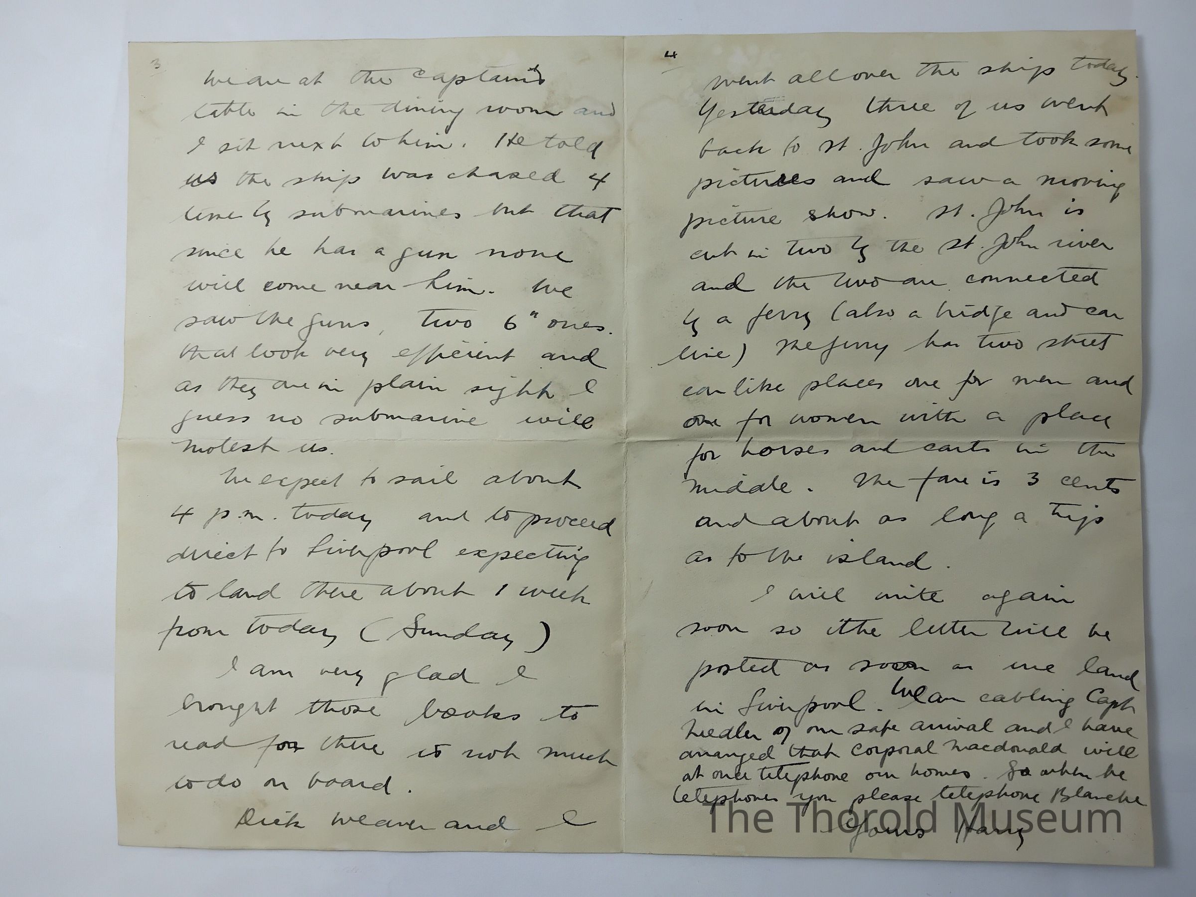 We are still at St. John but expect to sail at about 4 p.m. today. We embarked yesterday at 11:30 a.m. (Saturday) and were at once assigned to our butler. [?] and I occupy one cabin which is really for 4 people, we have a lounge & lots of room. There is a dresser like affair with doors etc. When you pull one door downward a basin screwed to it lowered to wash in and when you are through washing all you have to do is to push [????] in the dining room and I sit [??]. He told us the ship was chased[???] submarines but that since he has a gun none will come [?] him. We saw the guns , two 6" ones. And look [?] efficient [?] they [?] in plain sight I guess no submarine will m[?]t us.